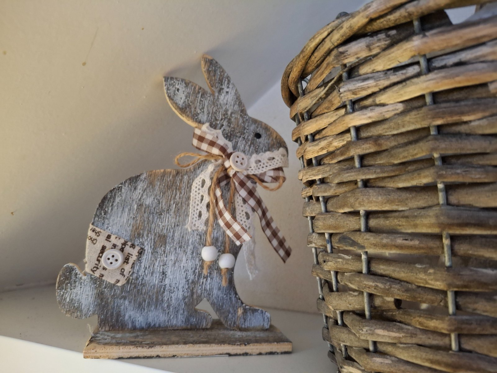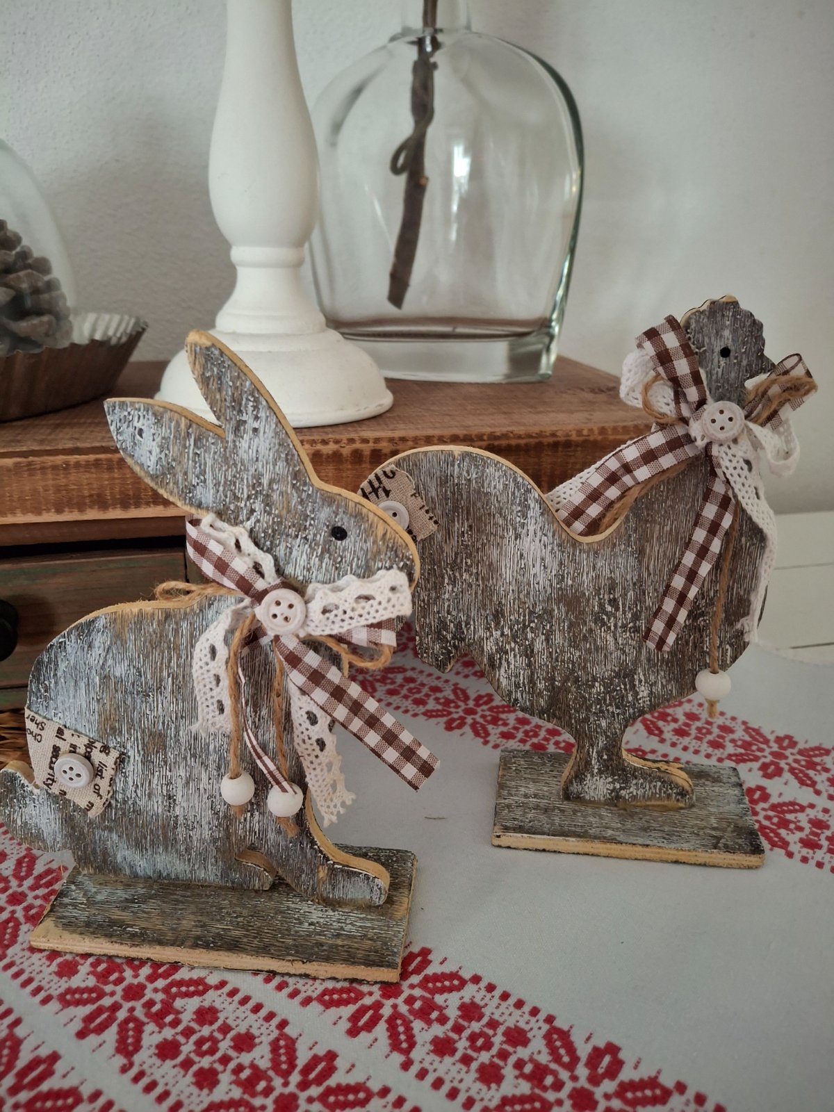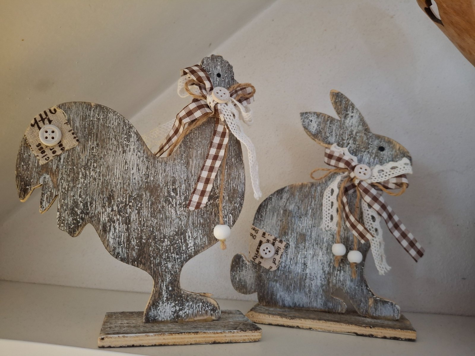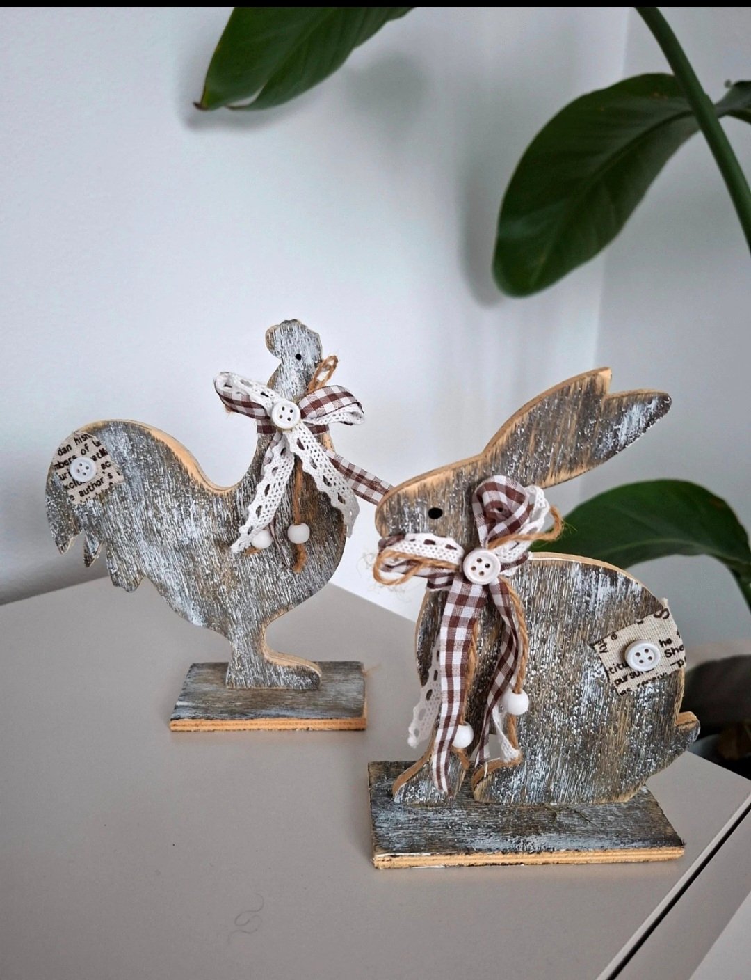 2ks drevene dekoracie sliepka a zajacik farba hneda, siva, biela. Cena spolu za 2ks. V pripade zaujmu mam 2ks sliepka a 2ks zajacik. Vyska 18 cm a 17 cm.