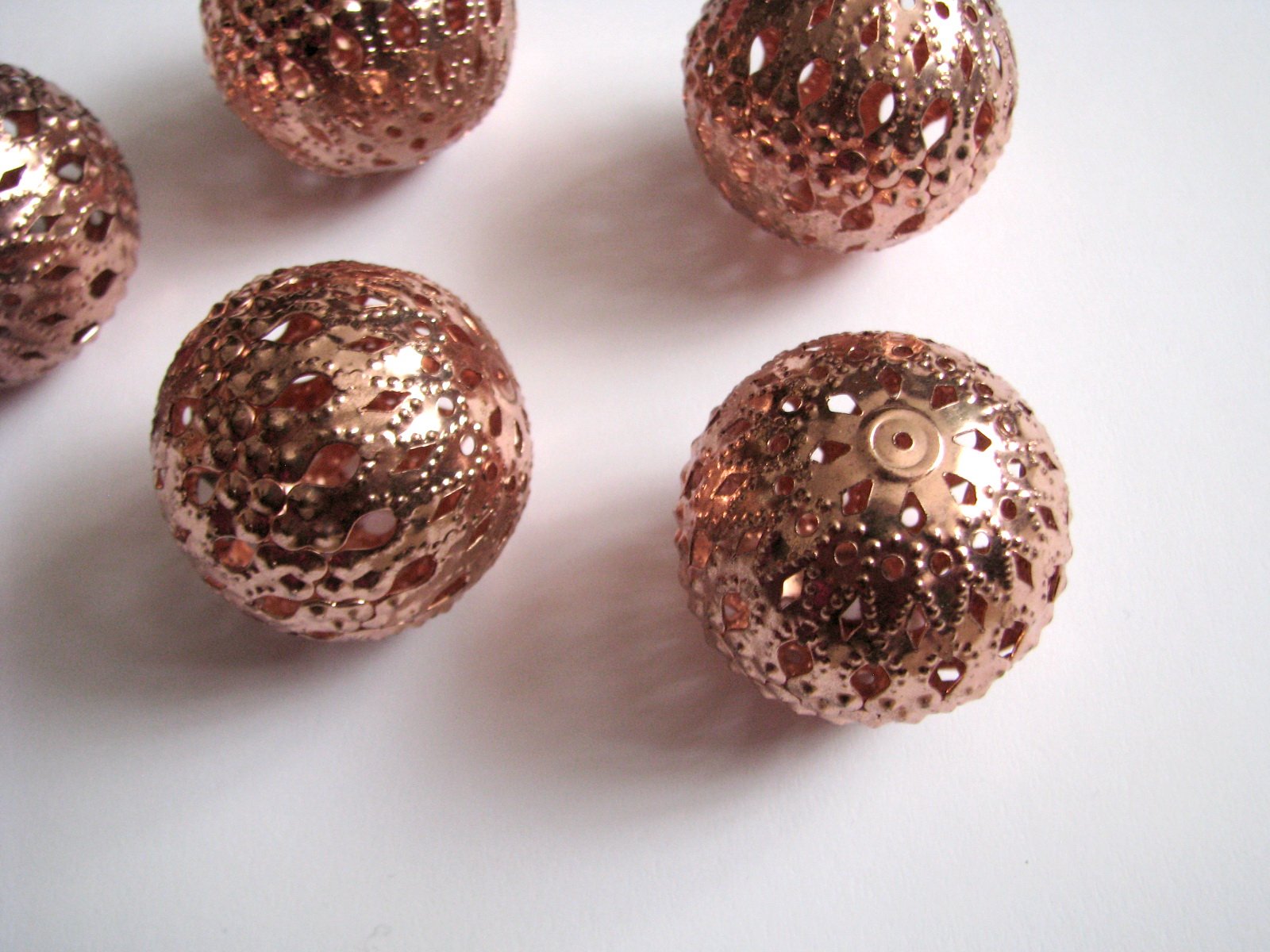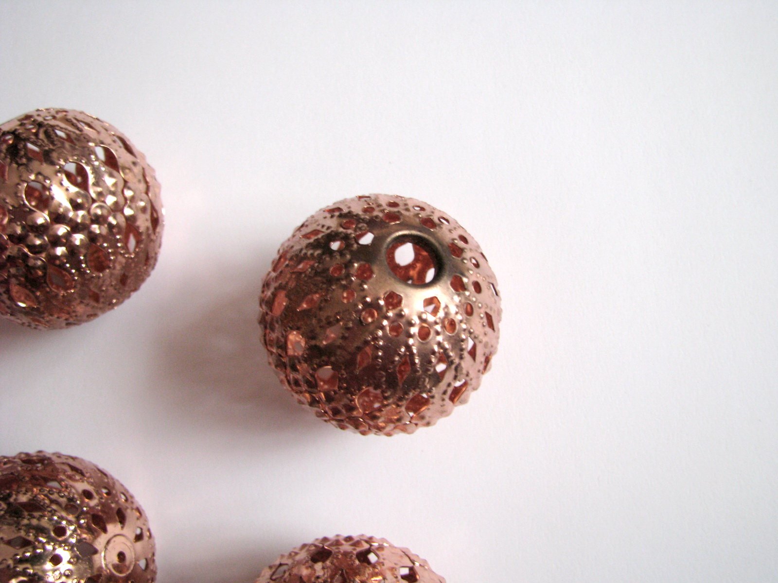 Kovové filigránové vianočné ozdoby - medené gule s priemerom 4 cm, 5 kusov. Na jednej strane majú väčší otvor, na druhej maličký. Bez závesného systému, možné použiť aj do vencov a iných dekorácií. Niektoré sú pri väčšom otvore trošíčku šuchnuté do čierna, inak sú bez chýb. Cena za všetky.