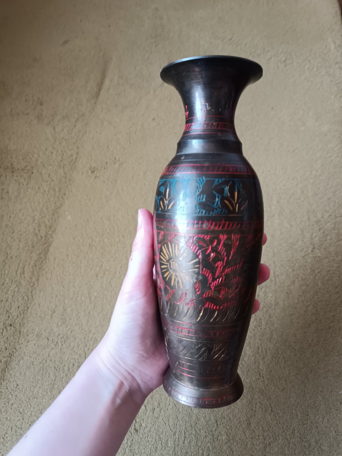 Predám krásnu mosadznú vázu s jemným gravírovaným zdobením v orientálnom štýle. Dekoratívny vintage kúsok, vhodný do interiéru, na chalupu alebo ako štýlový doplnok do retro bývania.