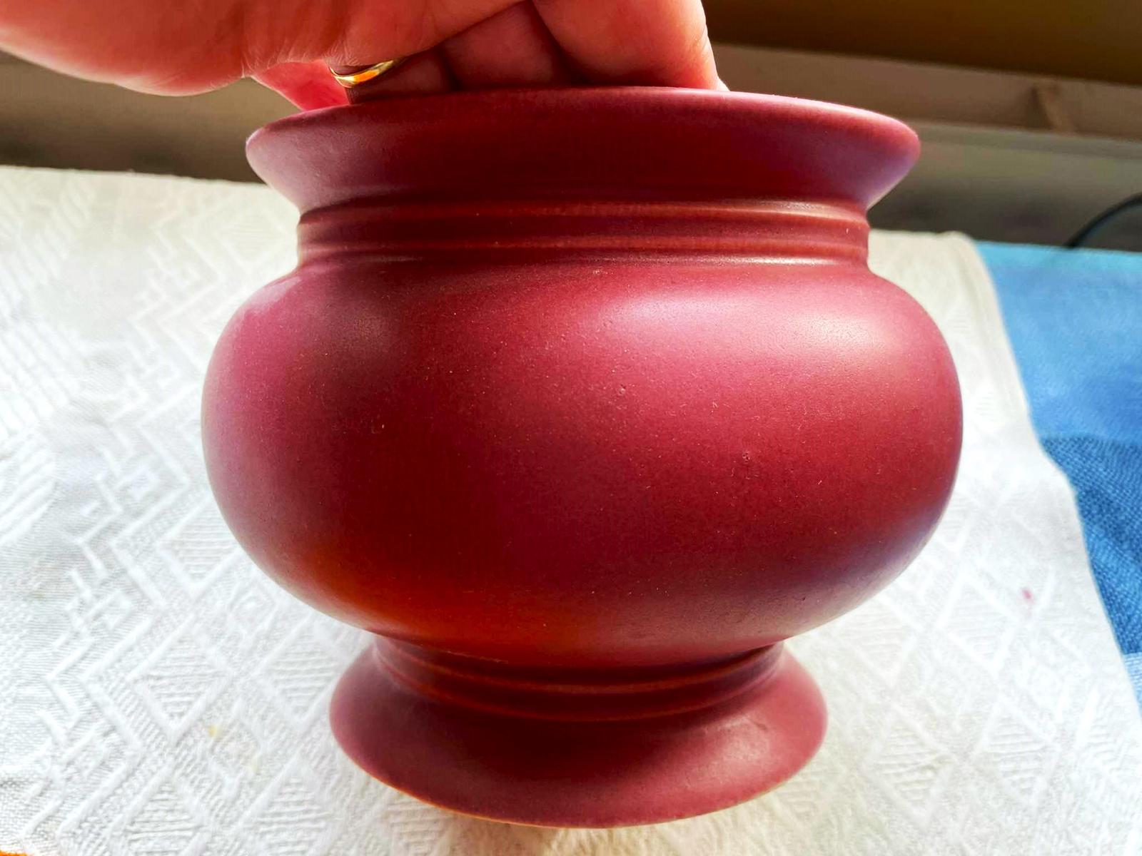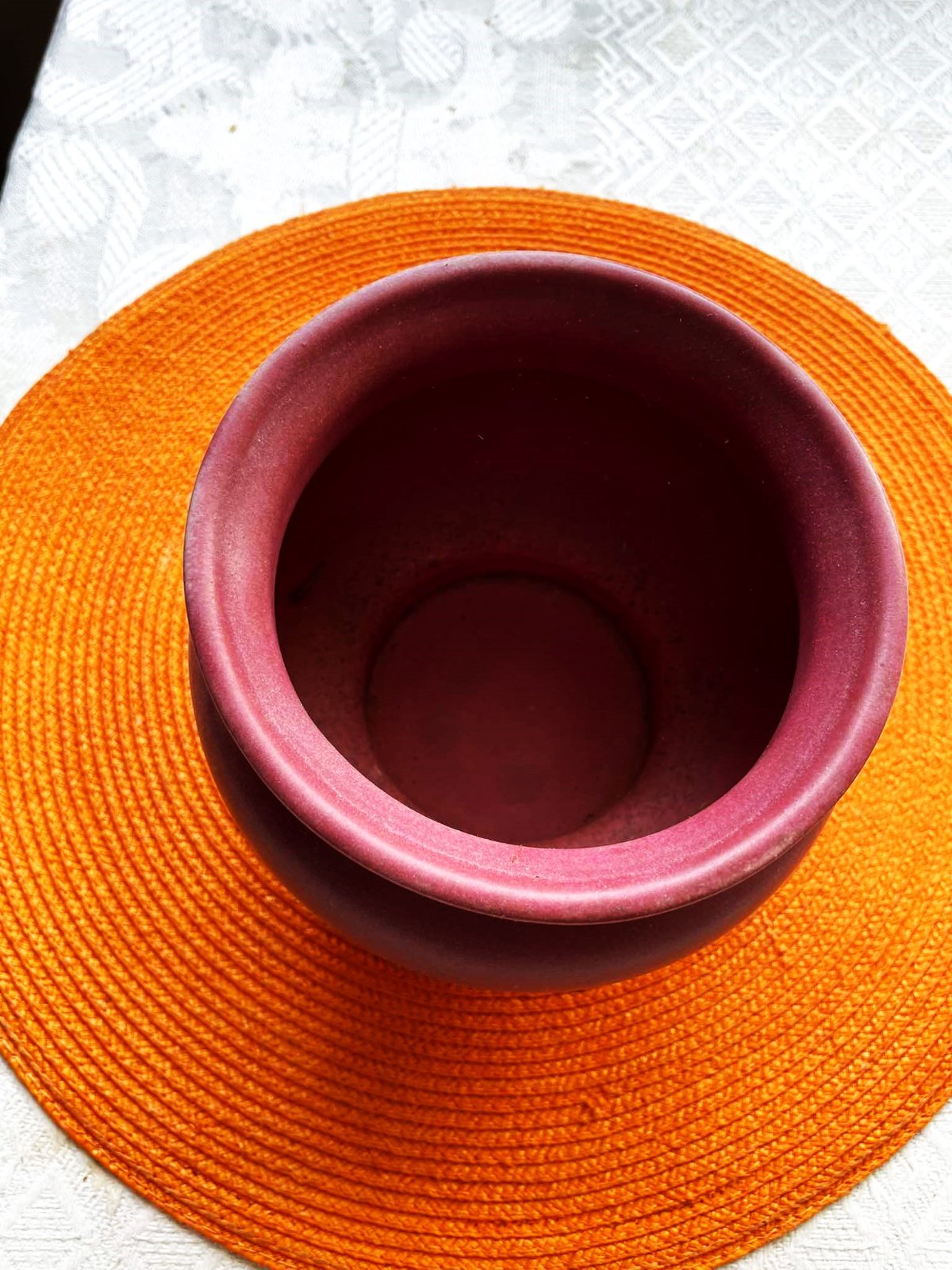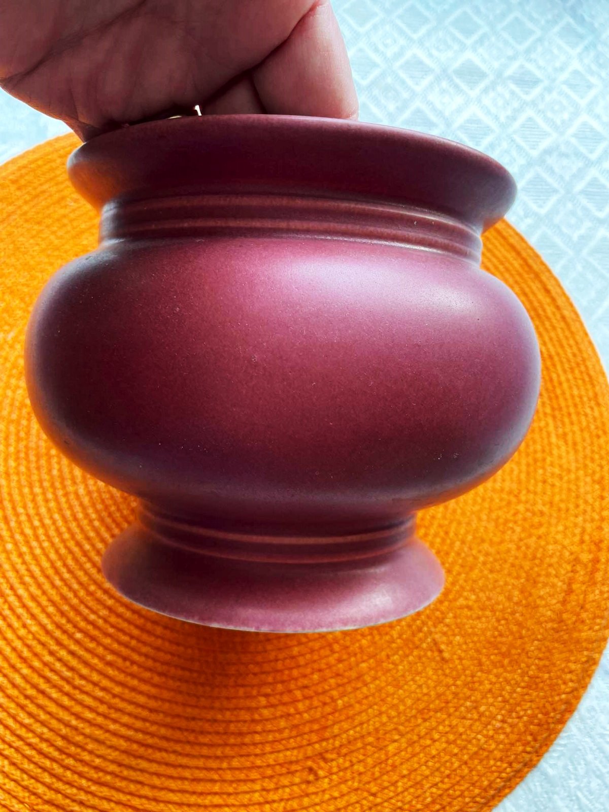 veľmi zaujímavá keramická váza,vhodná na sušené kvety,alebo ako črepník,netypický tvar,farba zastretá akoby vyblednutá fréziová ružovobordová,výška = 14 cm,priemer vrch = 14 cm, šírka v najširšej časti = 18 cm