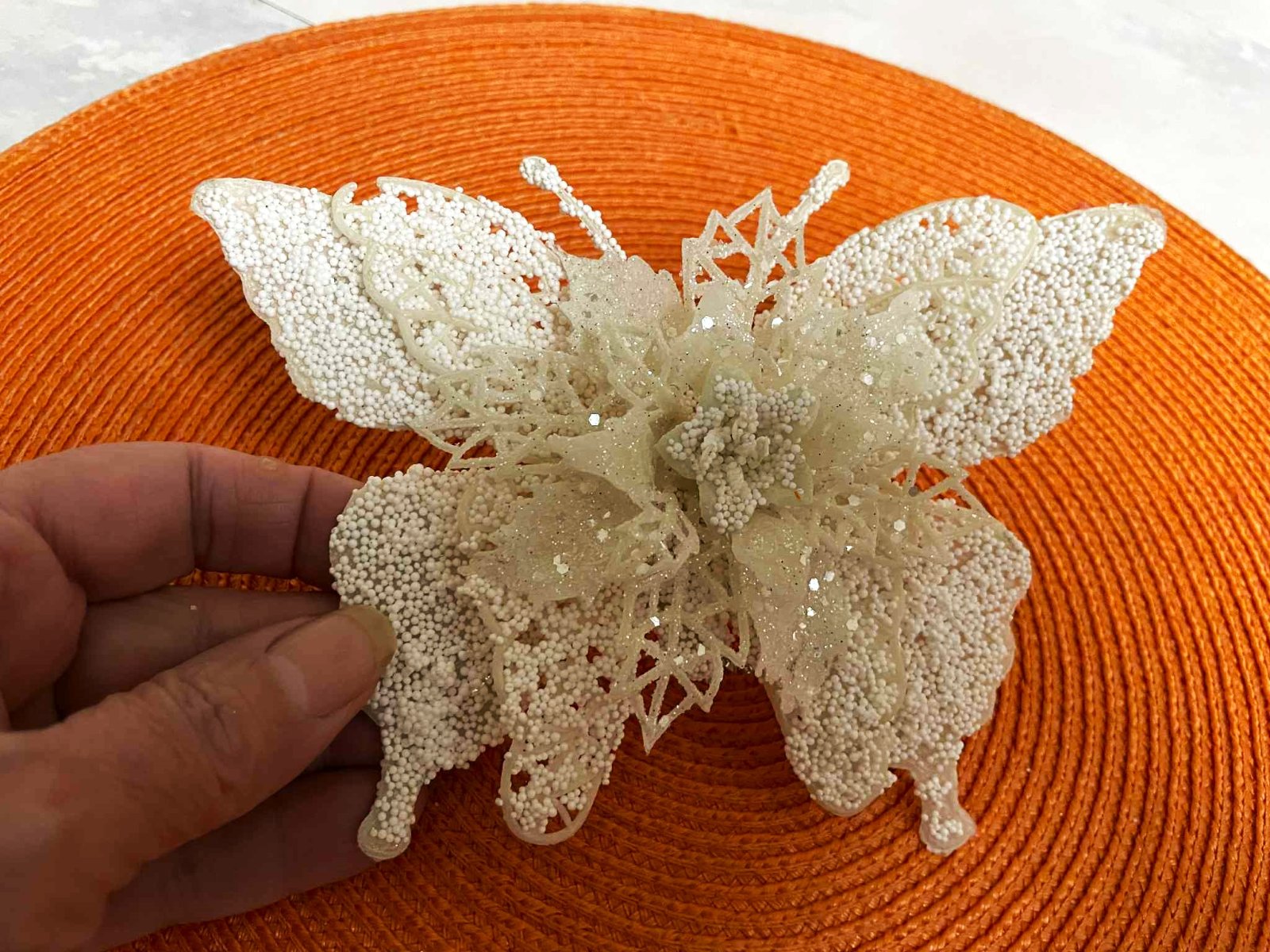 nádherná dekorácia vhodná na Vianočný stromček - ako dekorácia,ale nielen,vyzerá to,ako keby pocukrované kryštálmi,15 x 11 cm,smotanovo biele,top stav,min.použité