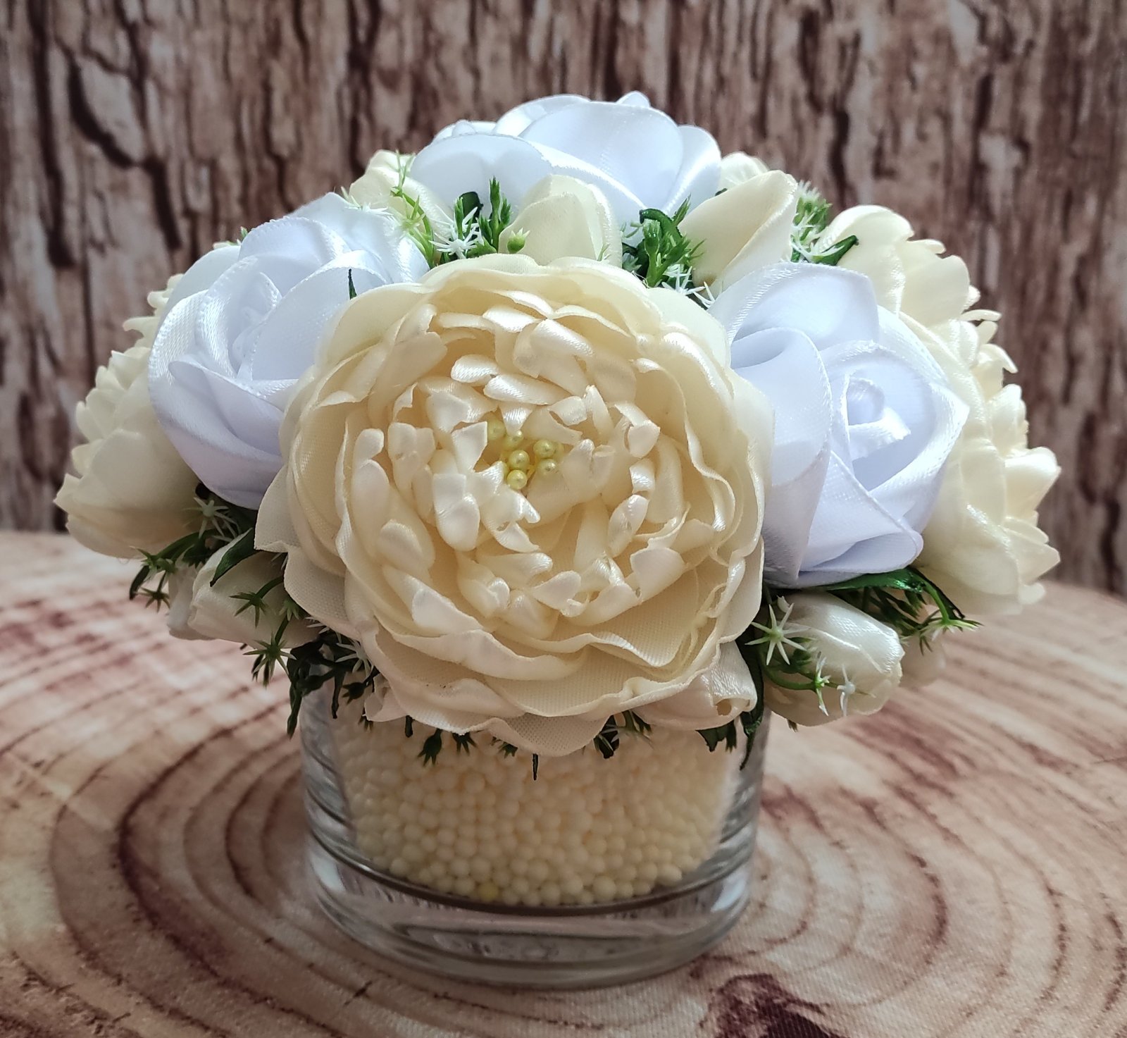 Celá kompozícia je zasadená v priezračnej sklenenej nádobe, naplnenej drobnými polystyrénovými guľôčkami, ktoré dodávajú aranžmánu jednotný farebný celok.