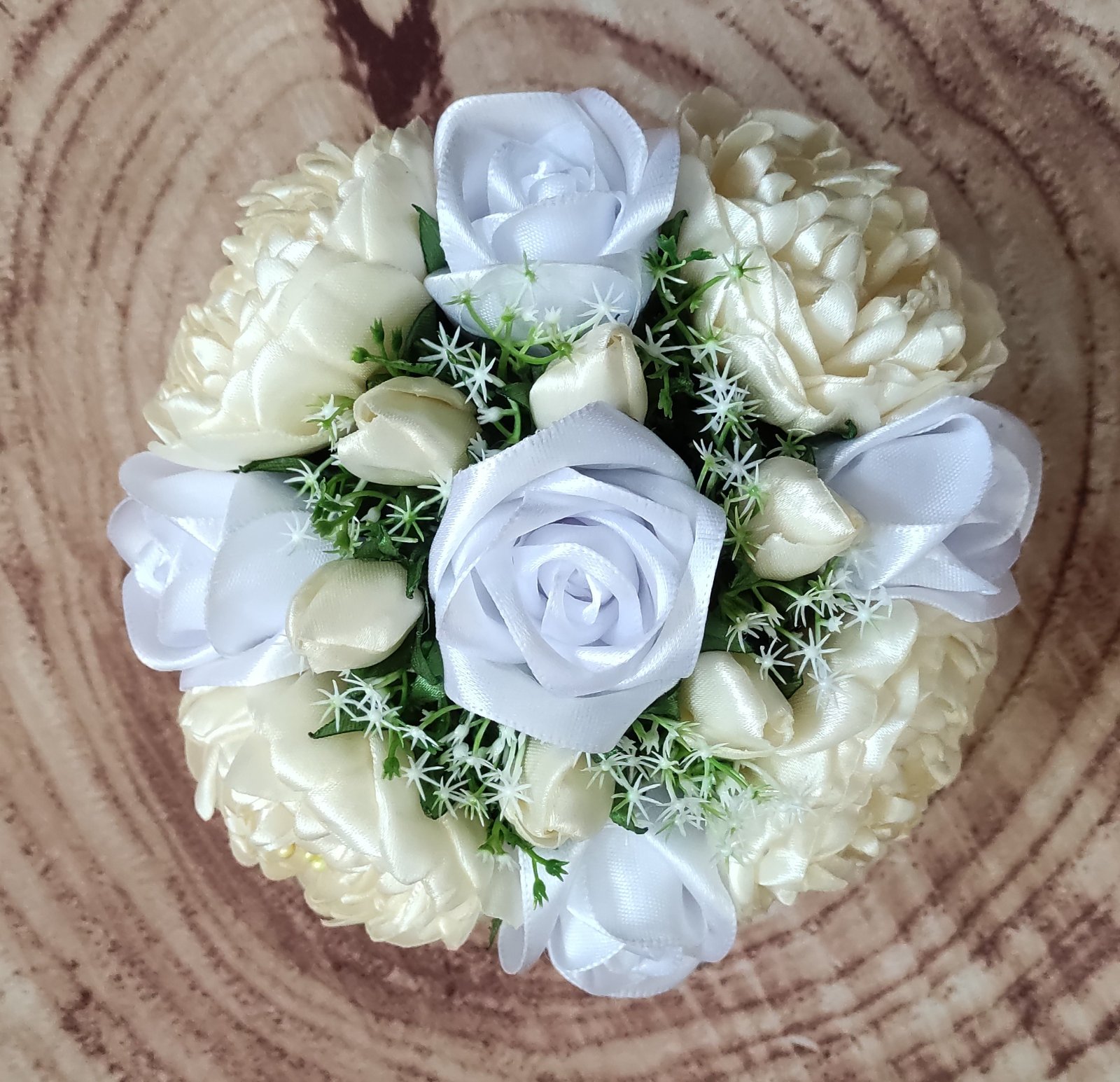 Jemné saténové pivonky a ruže rozkvitajú v dokonalej harmónii s ich pôvabnými púčikmi. Medzi nimi sa nežne vynímajú drobné biele hviezdičky, ktoré príjemne kontrastujú so zelenými saténovými lístkami.
