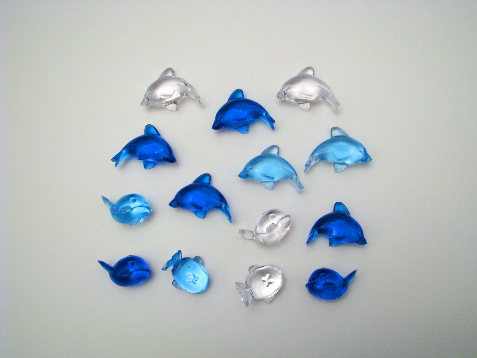 Dekoračné delfíny a veľrybky - malé dekorácie z tvrdého plastu, pekne lesklé, vo farbách - kráľovsky modrá (4 delfíny, 2 veľrybky), tyrkysová a číra (po 2 z každého druhu), spolu ich je 14. Len na položenie, nemajú dierky na zavesenie. Výborne zachovalé, bez poškodení. Cena za všetky spolu, predám aj jednotlivo za 0,50 eur/kus, pri minimálnom odbere 2 ks a minimálnej celkovej hodnote nákupu 2 eurá.