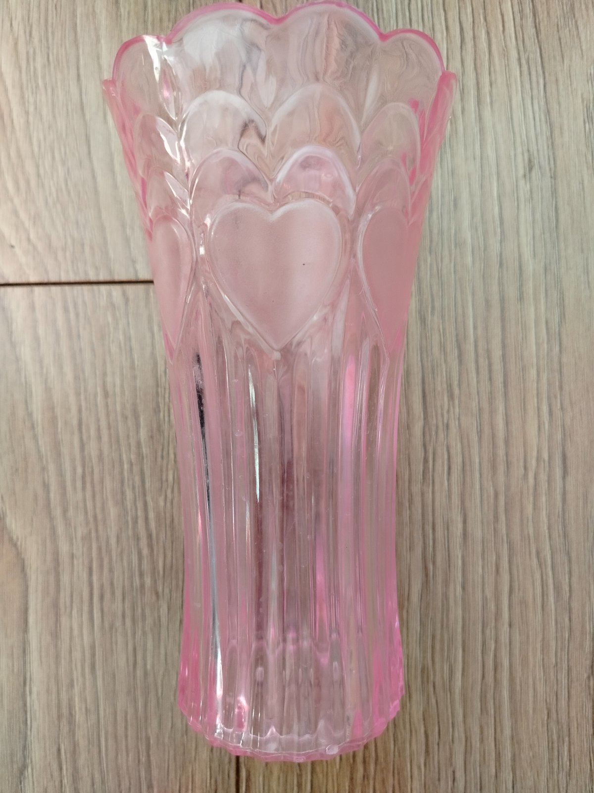 Predám minimálne používanú peknú ružovú plastovú vázu so srdiečkami po obvode. Horný okraj je vlnkovaný (scalloped), dole rebrovaný dizajn pre lepšiu stabilitu. Je ľahká, nerozbitná, ideálna na kvety, sušené aranžmány alebo ako samostatná dekorácia do dievčenskej izby, na Valentína či romantickú výzdobu. Je ako nová, bez poškodenia. Výška 18cm, priemer hore 10cm, dole 6,5cm