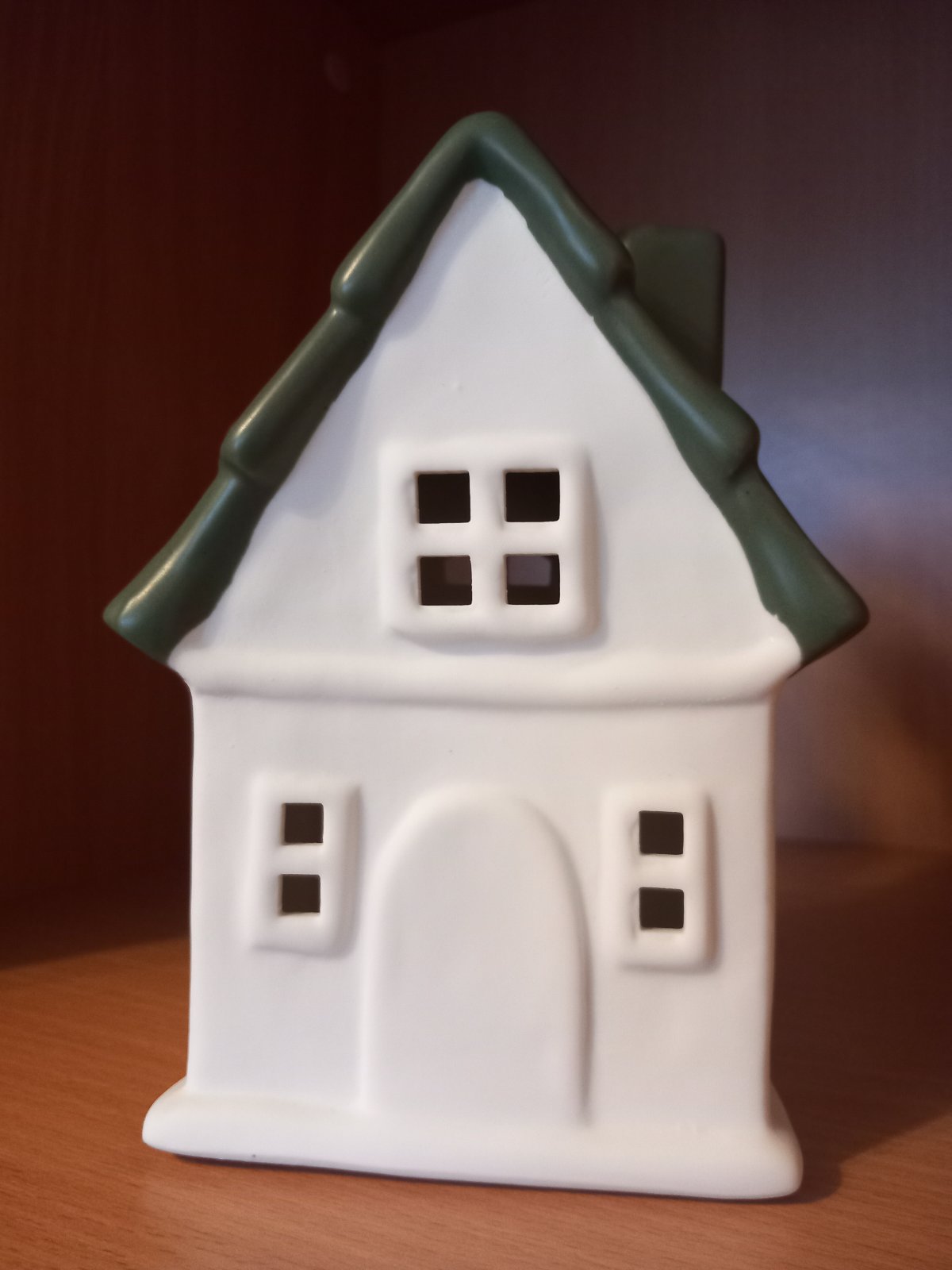 Keramika, váhovo ťažší. Žiarivo biela farba s matnou úpravou, zelená strecha lakovaná s jemným leskom. Zospodu režim zap./vyp. Batérie sú súčasťou domčeka. Vysvietený teplou bielou - viď foto. Nový.