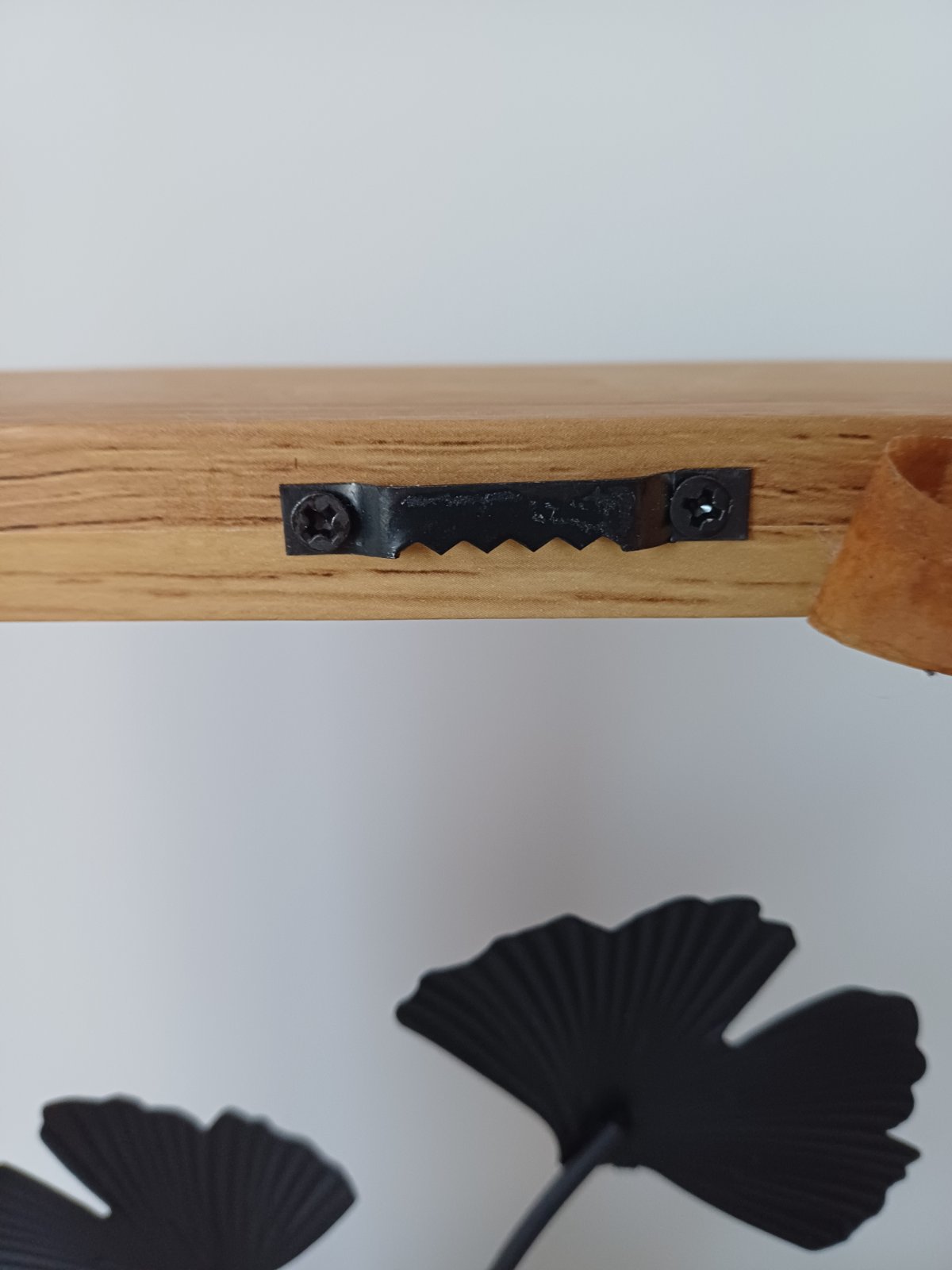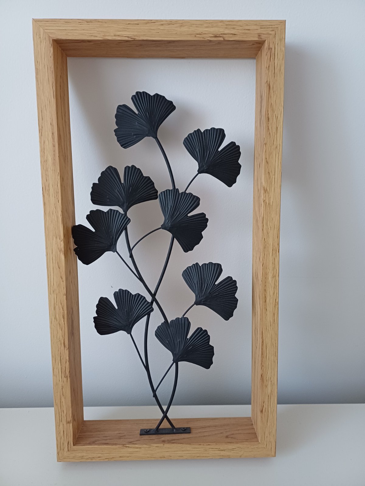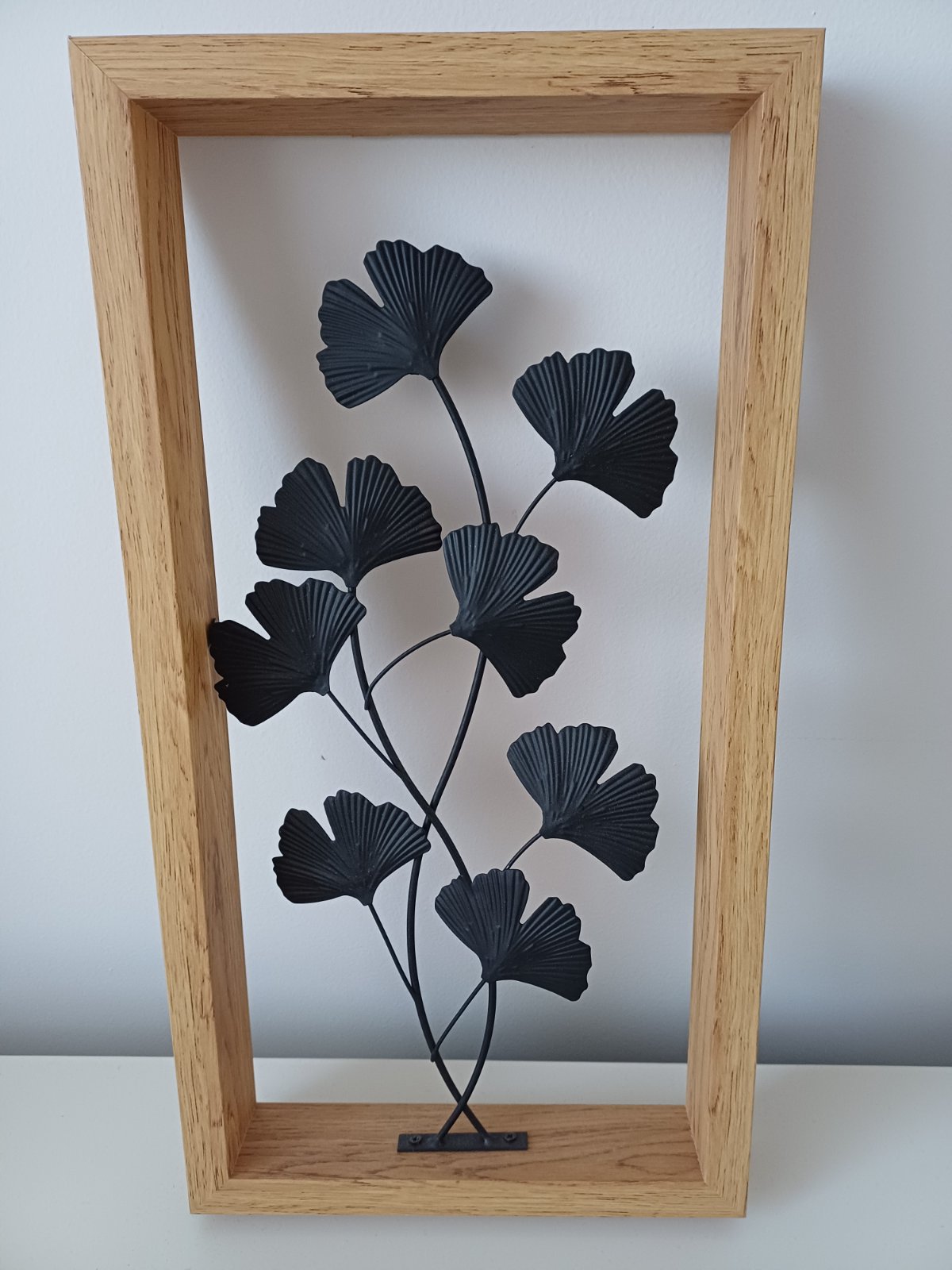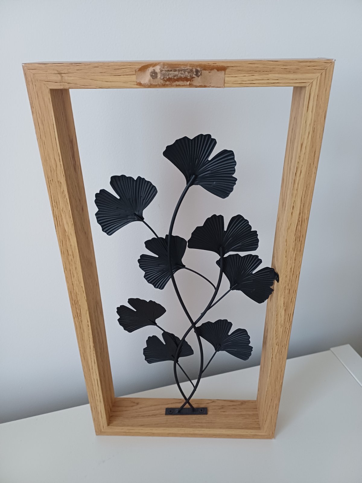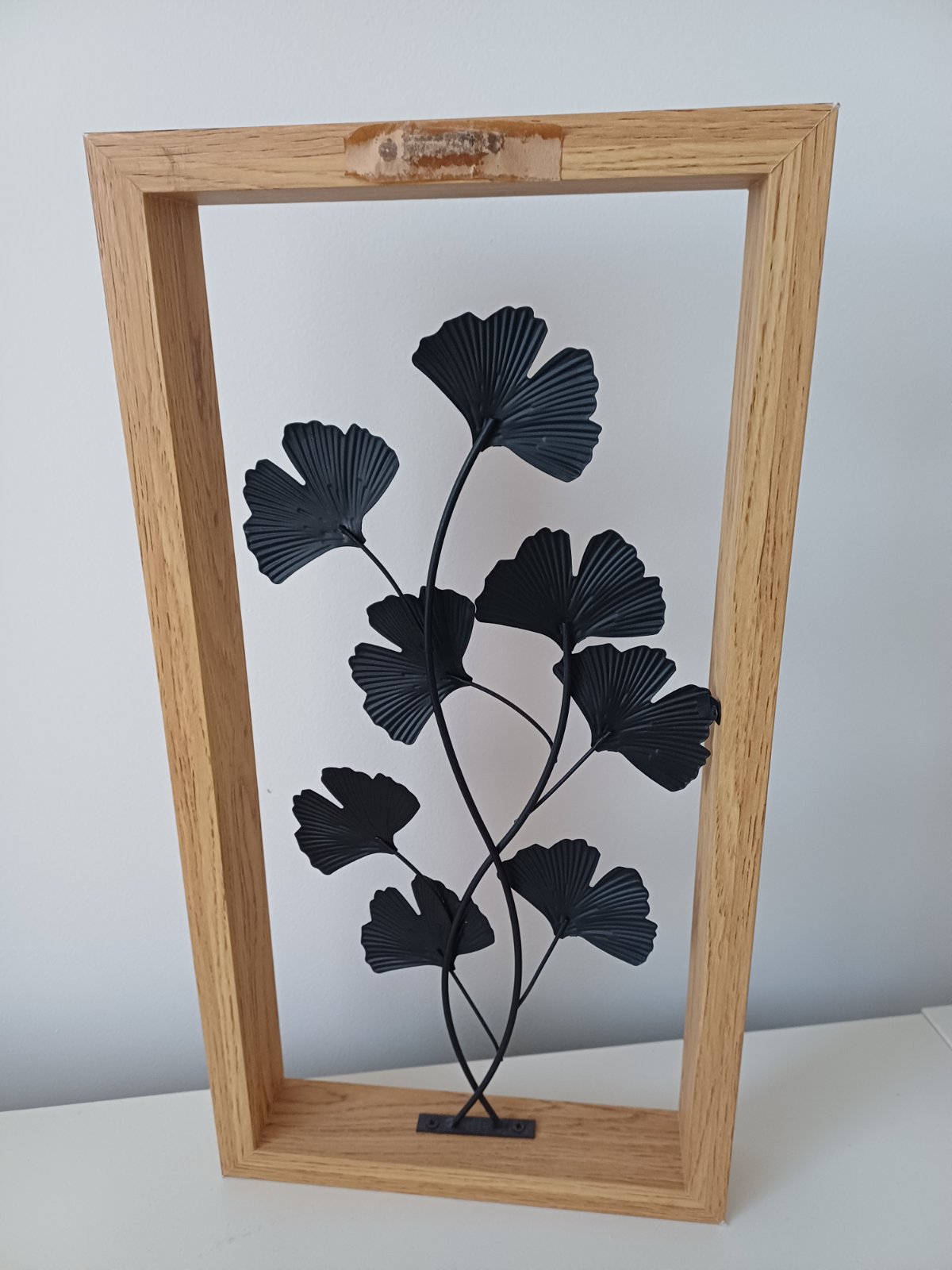 Predám dekoráciu, kde v drevenom ráme sú čierne kovové listy.