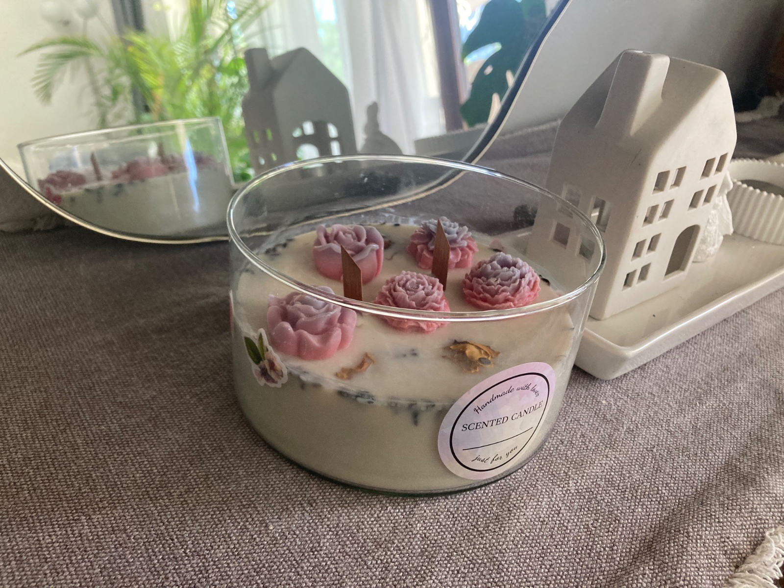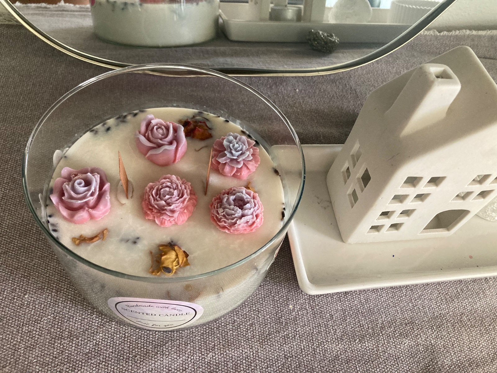 Home made, vyrobená z prírodného vosku. Použité sušené kvety z mojej záhrady a drevený knôt na lepšie horenie. Viem vyrobiť s rôznymi vôňami.