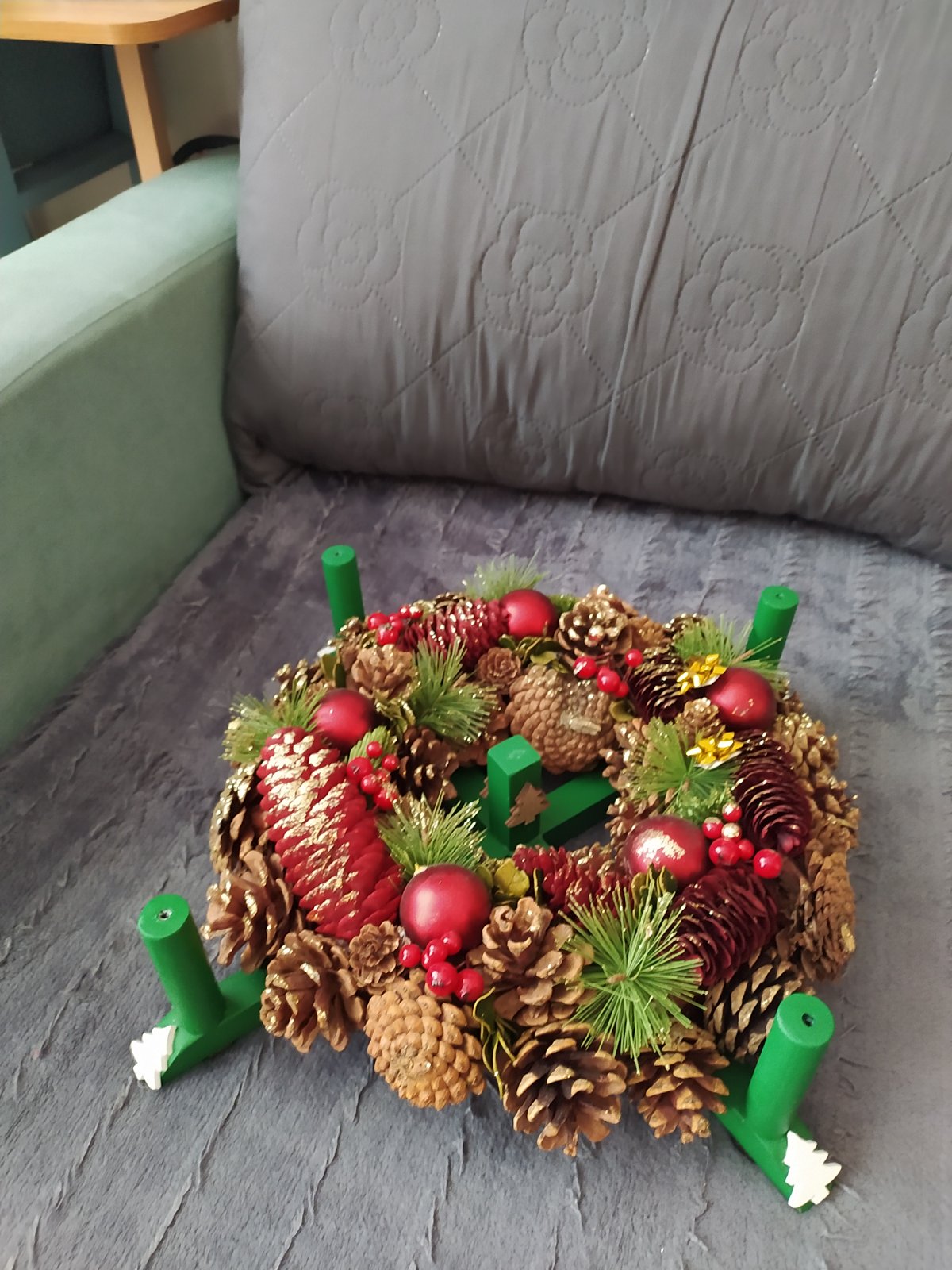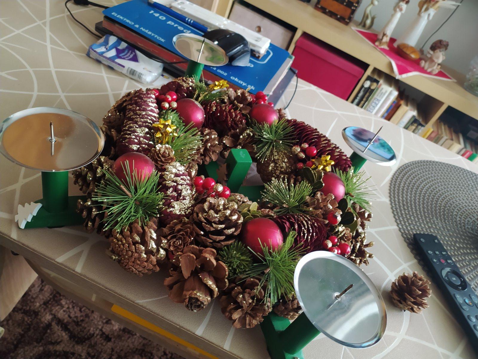 Mužova práca -stojan na vianočný veniec .Zdarma pridam aj zapichovatka na sviečky čo idu po bokoch .Foto ako to vyzeralo -