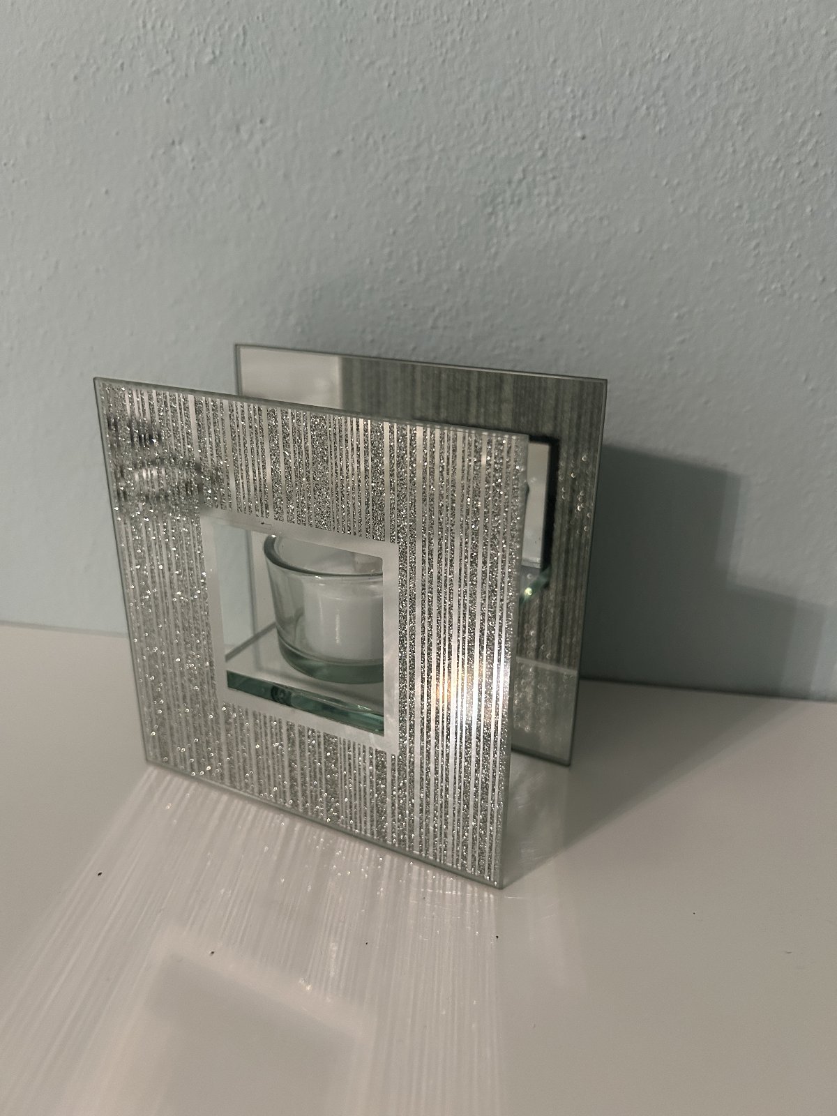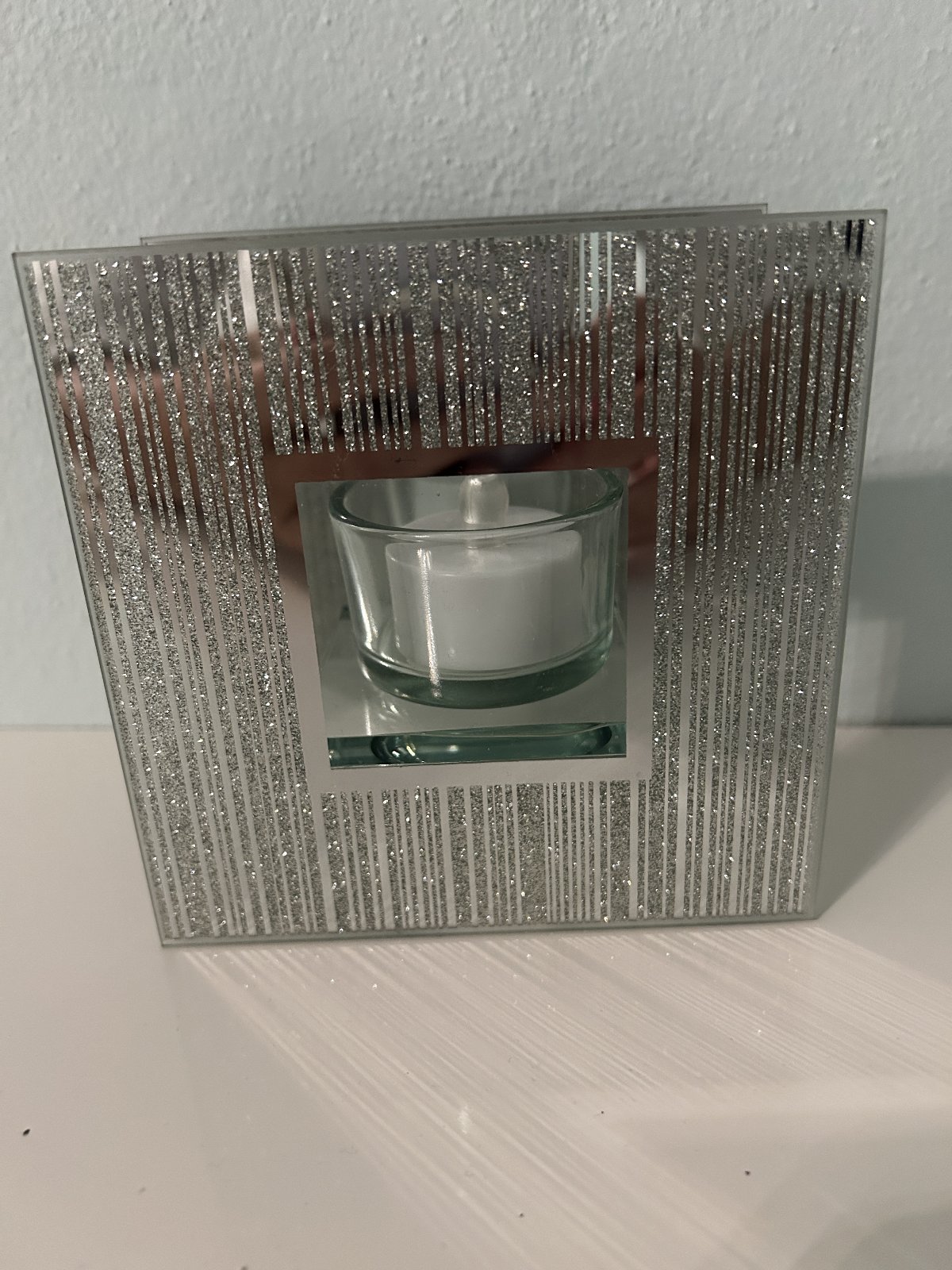 zaujímavý svietnik zo zrkadlových platní zdobených striebornými trblietkami 12x12 cm, hrúbka 6 cm, s led sviečkou. baterka vo sviečke je súčasť balenia