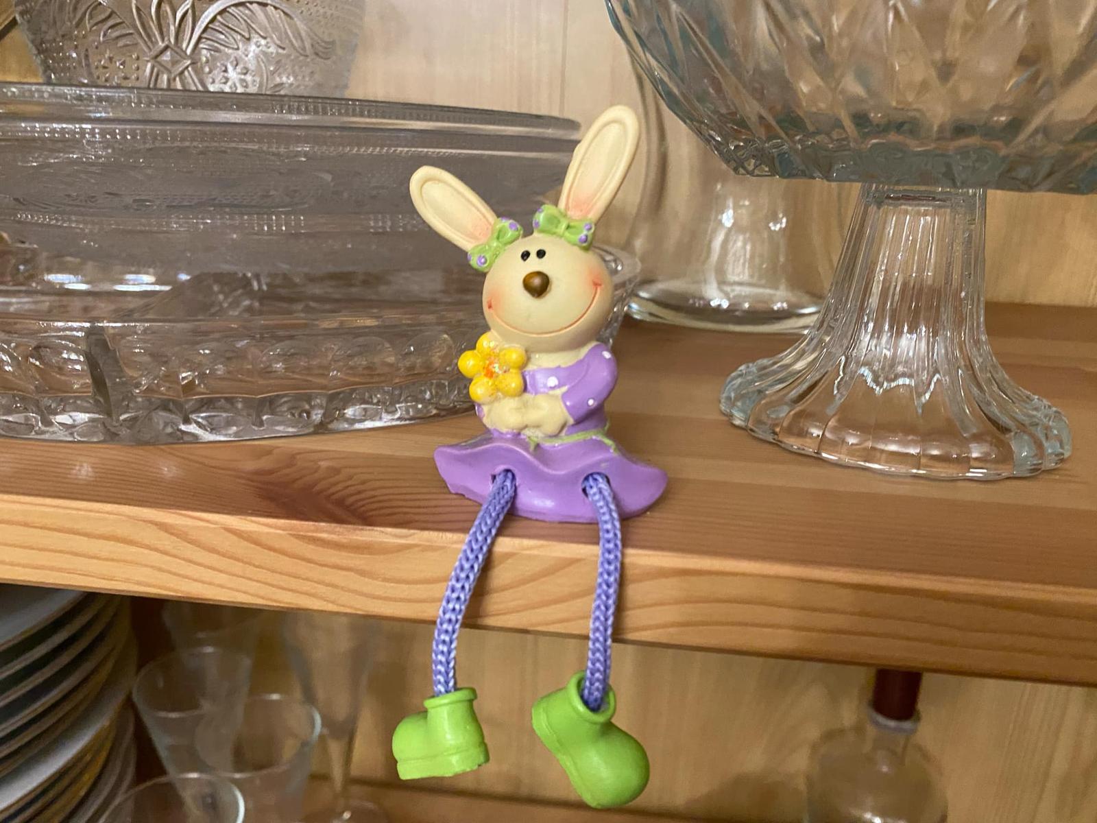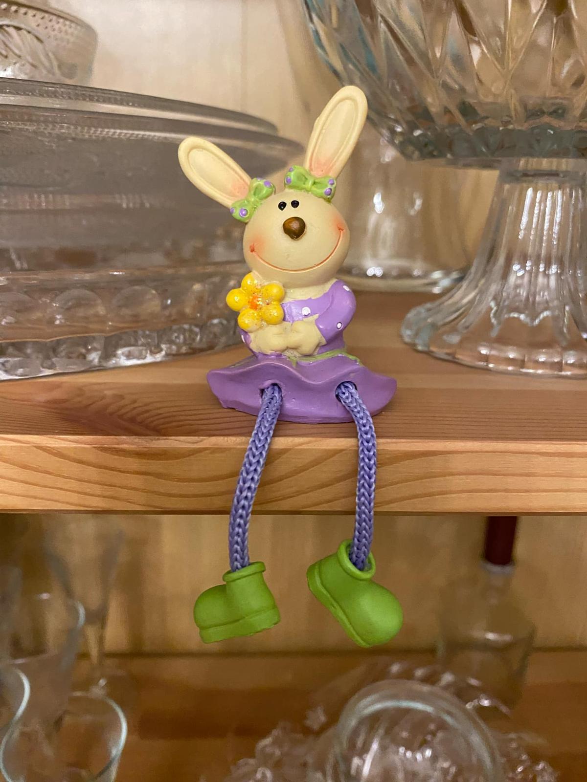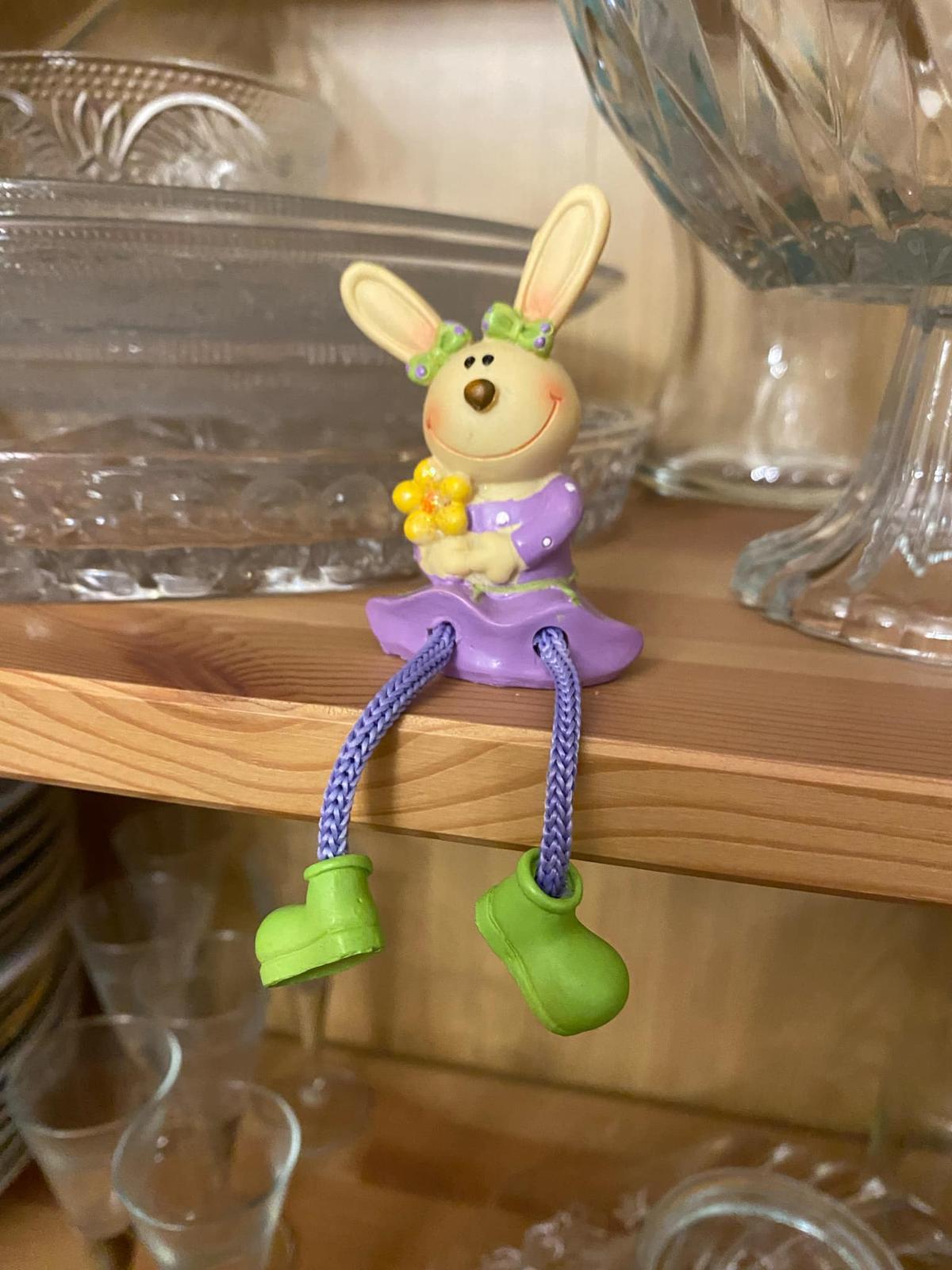 Predám sediacu Zajku s visiacimi nohami na posadenie na okraj nábytku, do aranžmánu, na dekorovanie a pod.