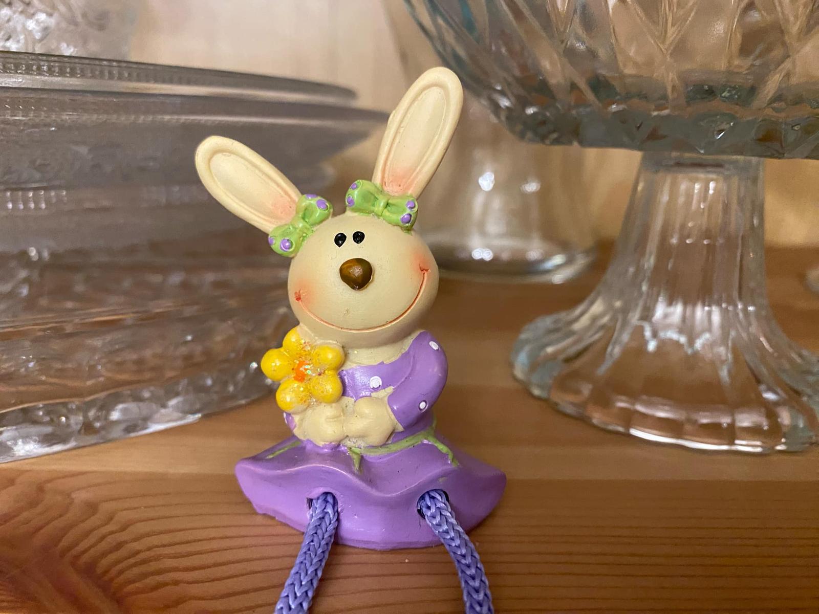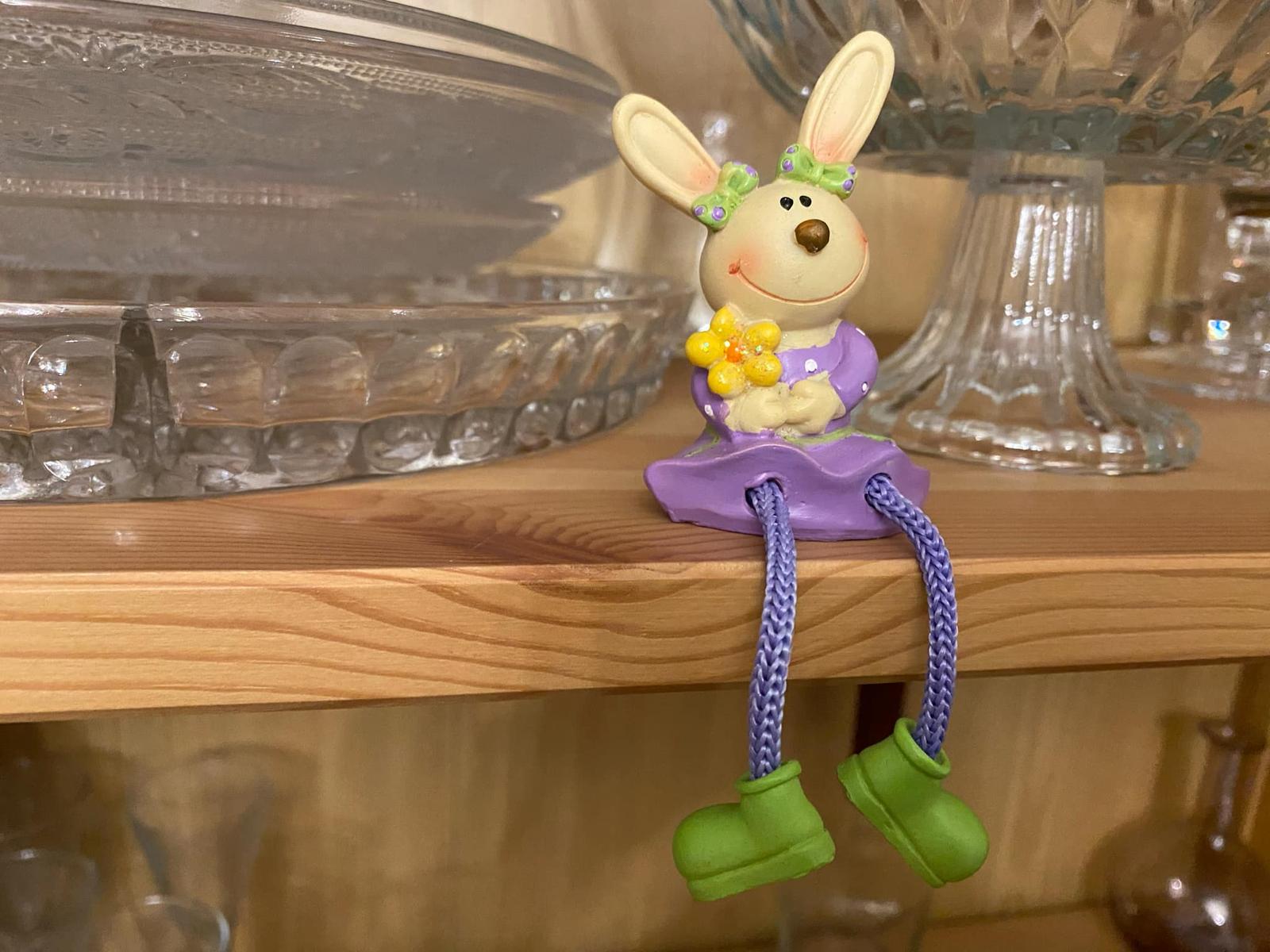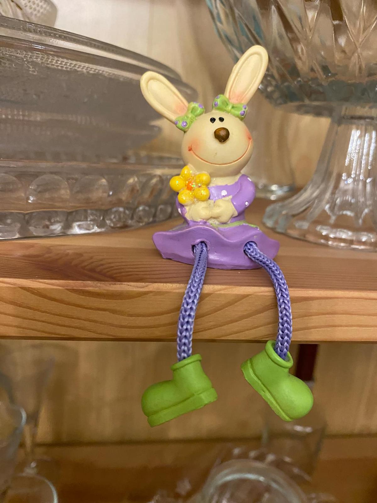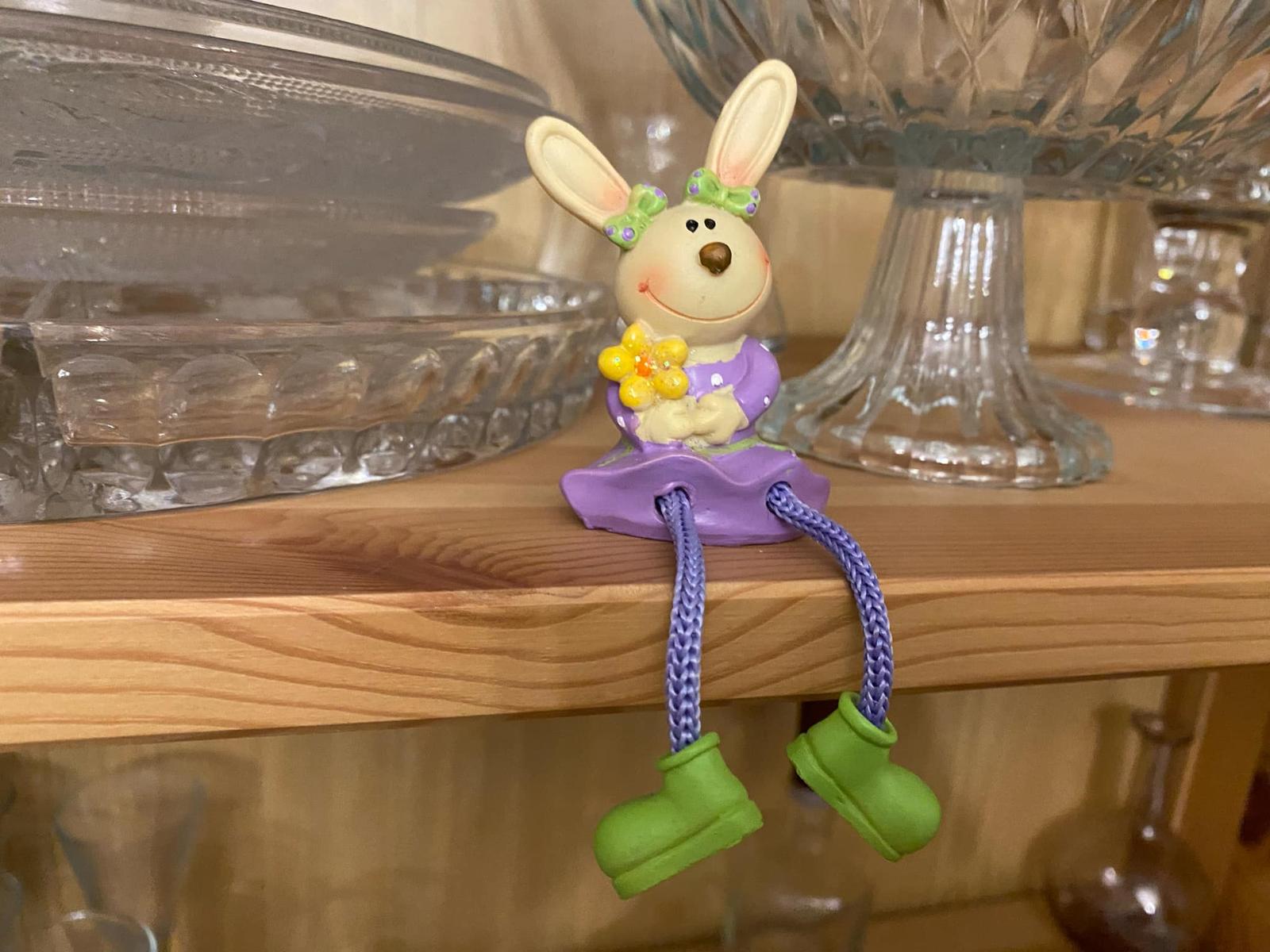 Predám sediacu Zajku s visiacimi nohami na posadenie na okraj nábytku, do aranžmánu, na dekorovanie a pod.