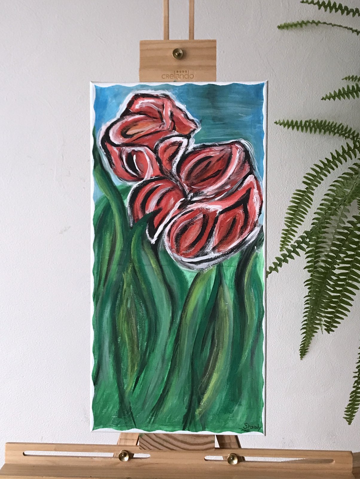 Ponúkam na predaj tento výrazný, ručne maľovaný obraz s motívom tulipánov. S podpisom