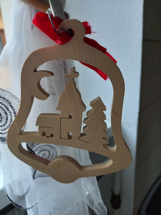 Drevená vianočná dekorácia, rozmery zvončeka sú cca 16 x 13 cm. Preto sú tam štipce, lebo ja som ich mala na záclone, tie si môžete dať preč. Doložím k tomu motýliky z dreva na zavesenie-viď posledný obrázok Cena 2,50 € za obidva+poštovné.