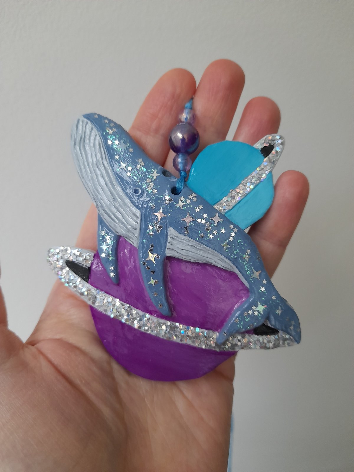 Vesmirna velrybka s planetami. Zavesna handmade dekoracia vyrobena zo samotvrdnucej hliny. Malovana akrylom a osetrena lakom.