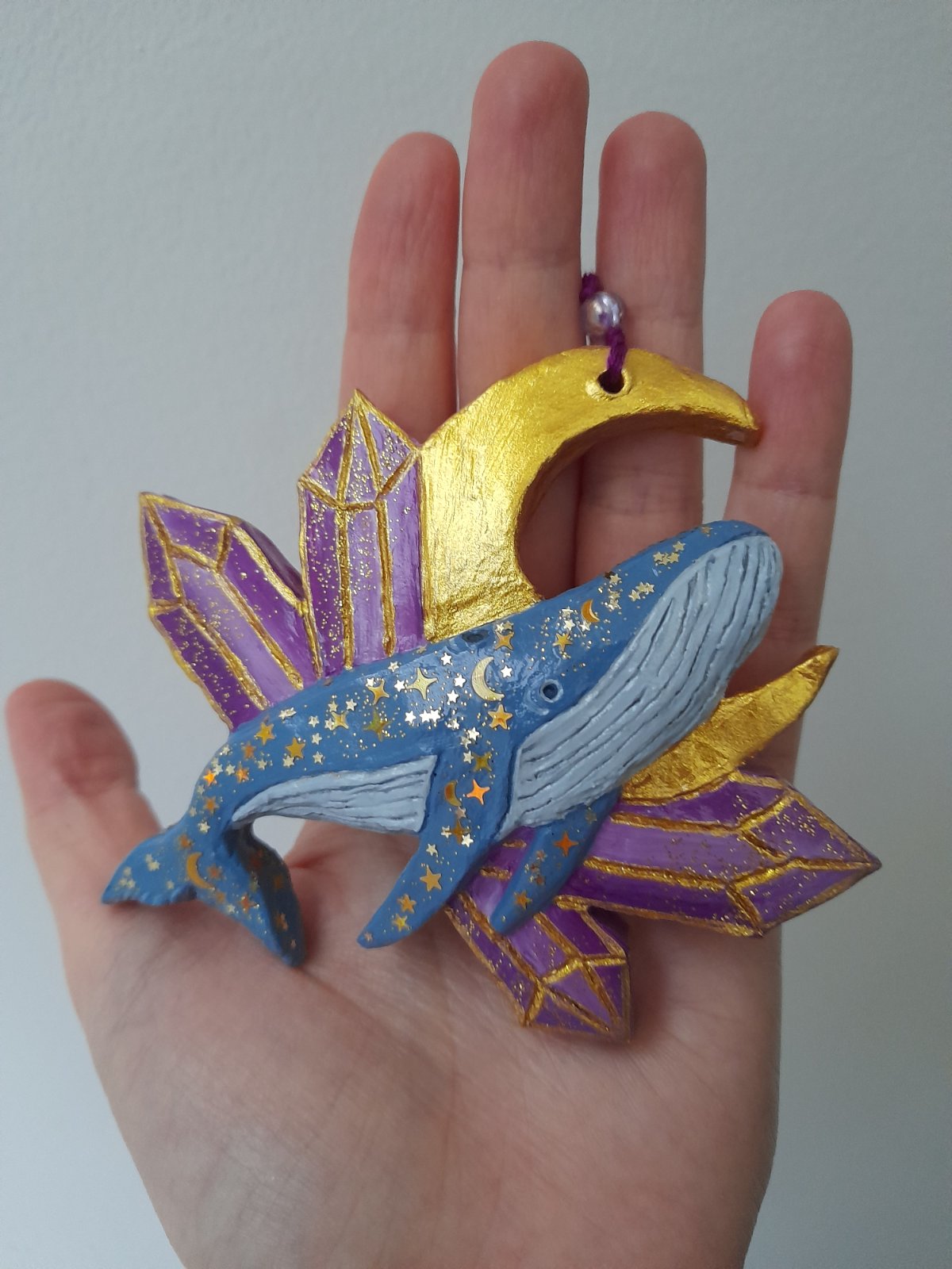 Handmade velrybka s mesiacom. Zavesna dekoracia. Vyrobena zo samotvrdnucej hliny, malovana akrylom. Osetrena lakom.