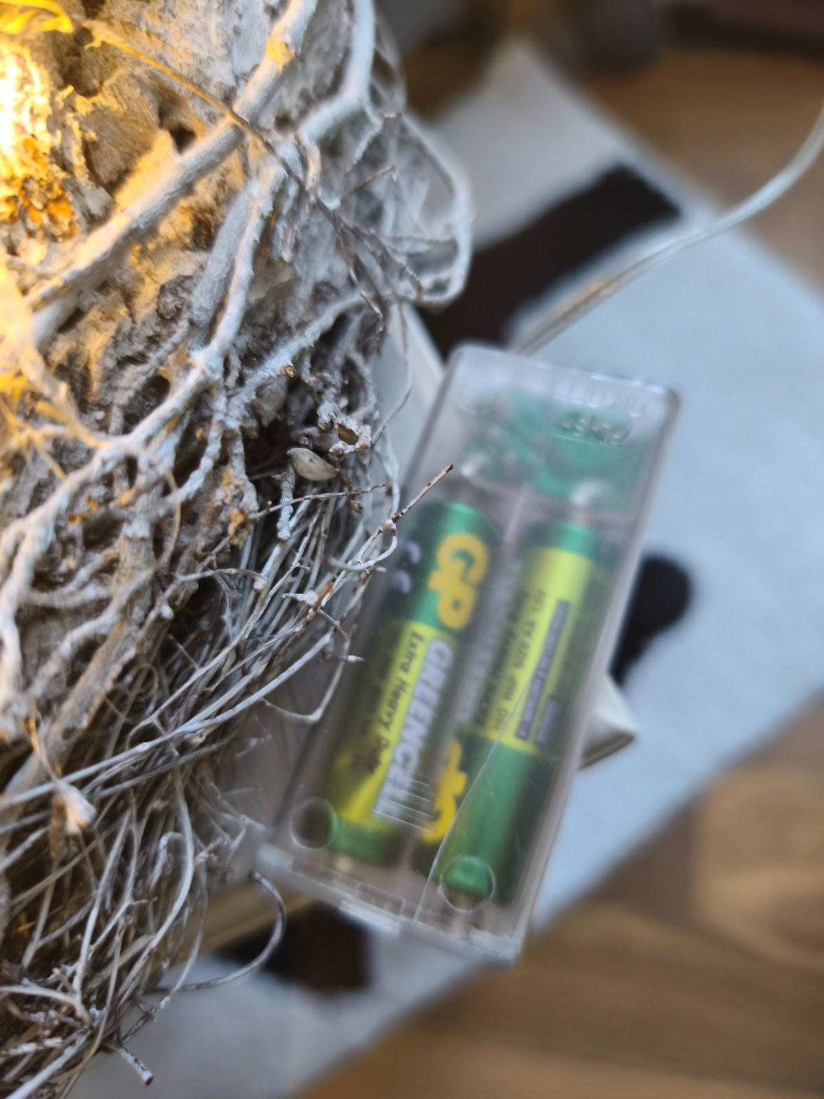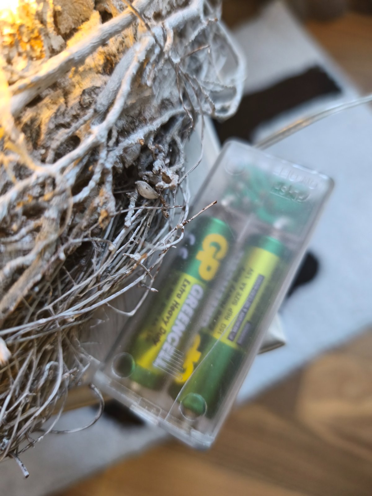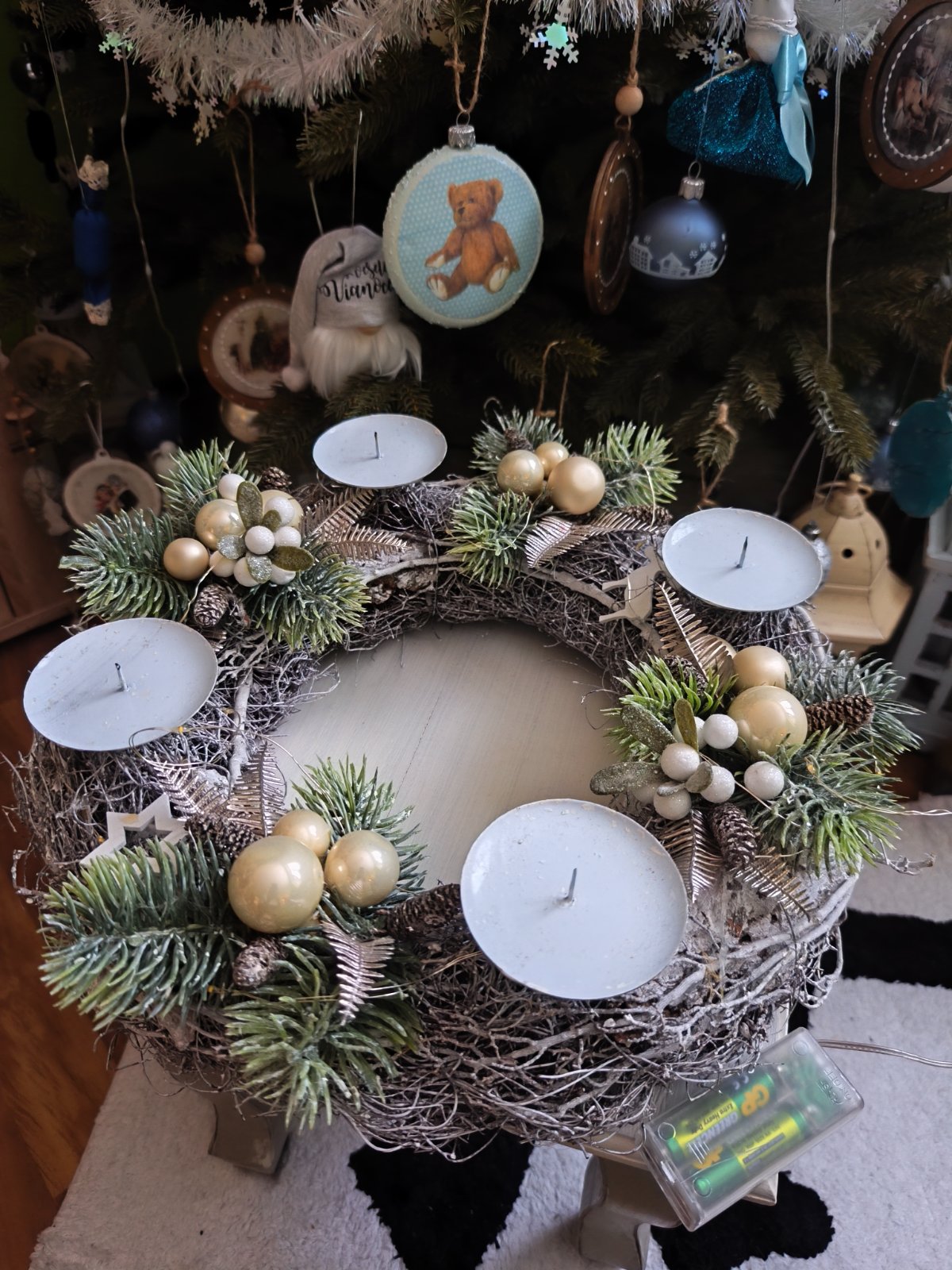 Adventný veniec, trochu puknuty obal na batérie, bodce sú trochu pokvapkane od vosku, čo nijako neprekáža v používaní.