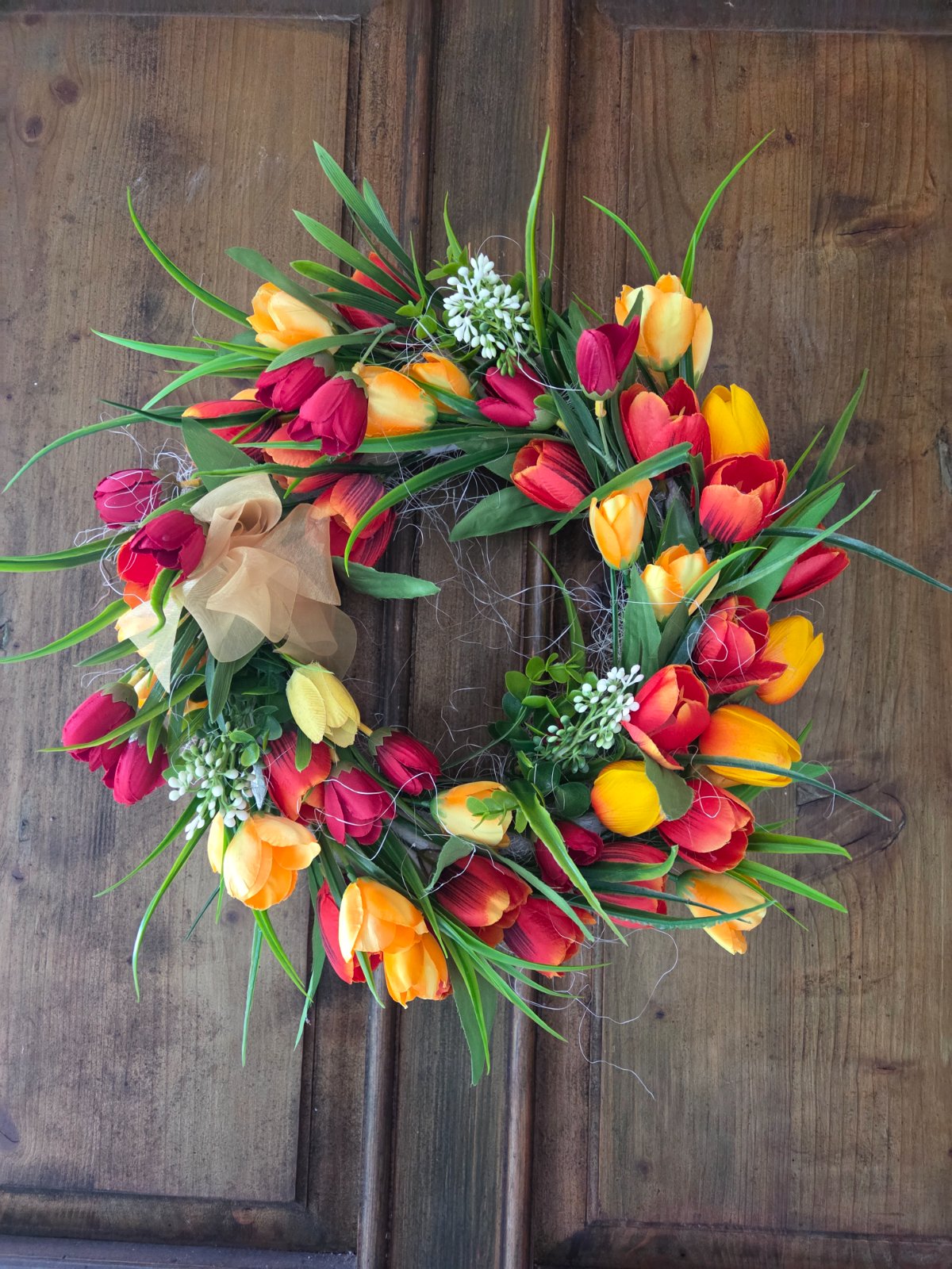 Jarný veniec na prútenom základe. Tulipány červené a žlté. Priemer 38 cm. Cena 28,00€