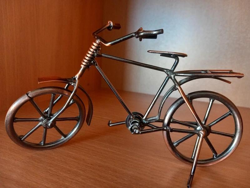 Vekovo staršia dekorácia, vyprataná z nábytku pracovne po zosnulom otcovi. Kov, ťažšej váhy, otočné riadidlá aj pedále, stojan napevno/nie je sklopný, mosadz/bronz (podľa lomu svetla), 18,5x10x8 cm.