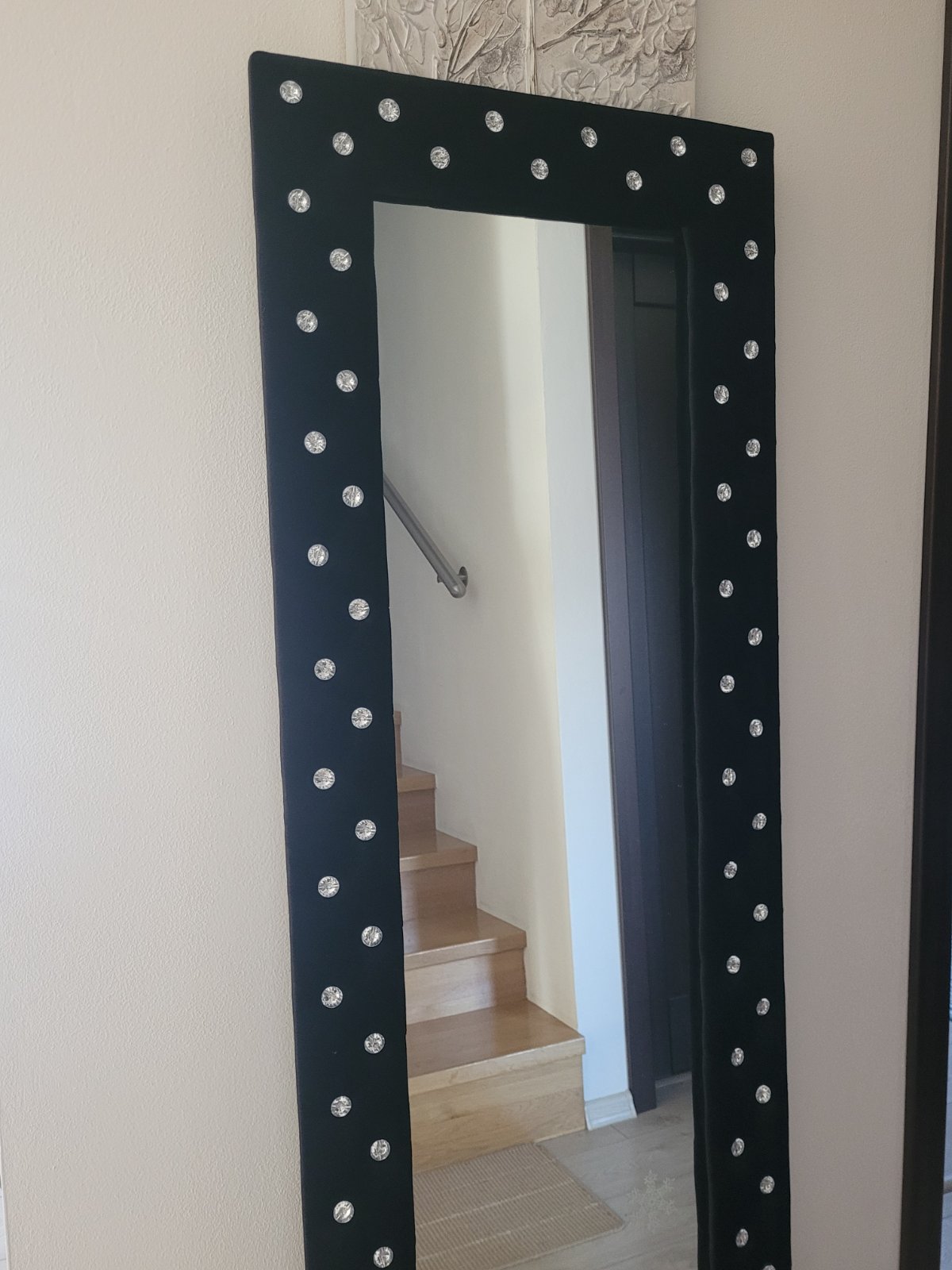Zrkadlo v glamour štýle, bez poškodení. Rozmery šírka 60 cm, výška 170 cm. Mam v albume aj ladiacu taburetka. Ram je z materiálu ako čierny zamat.