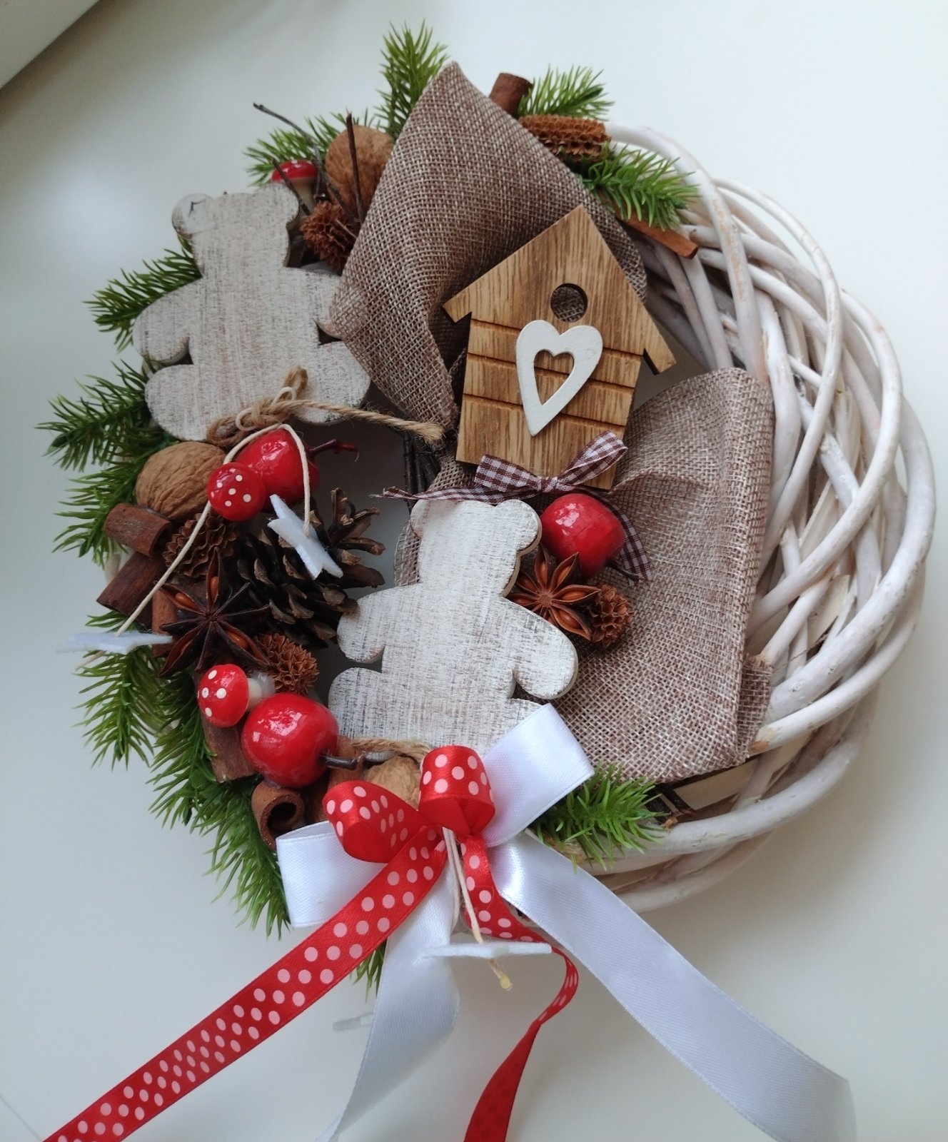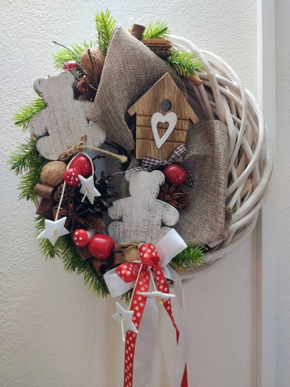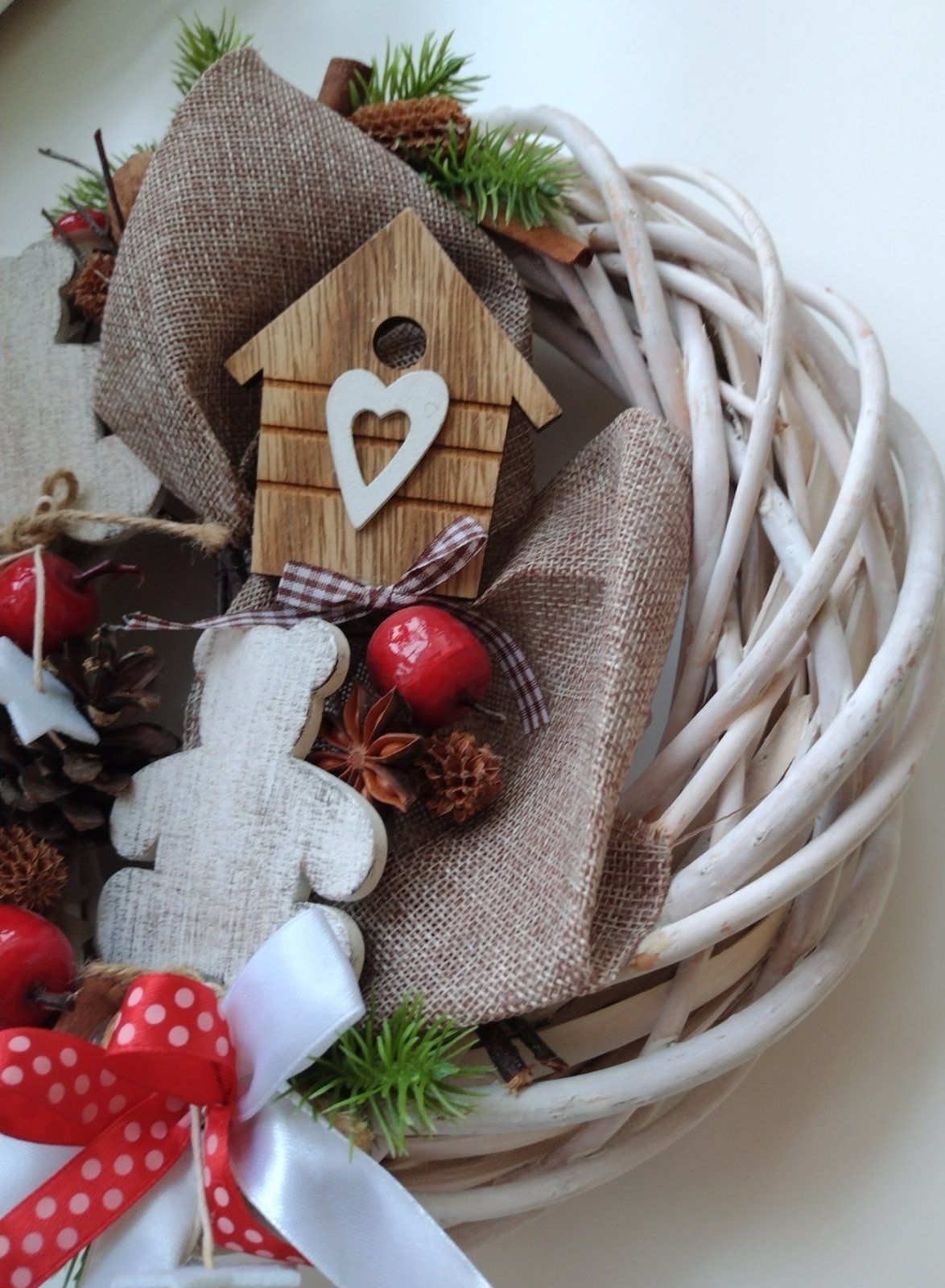 Vianočný veniec - vŕbový pletený veniec bielej farby s dekoráciami z prírodných materiálov, ozdobený stuhami, s možnosťou zavesenia, ako nový.