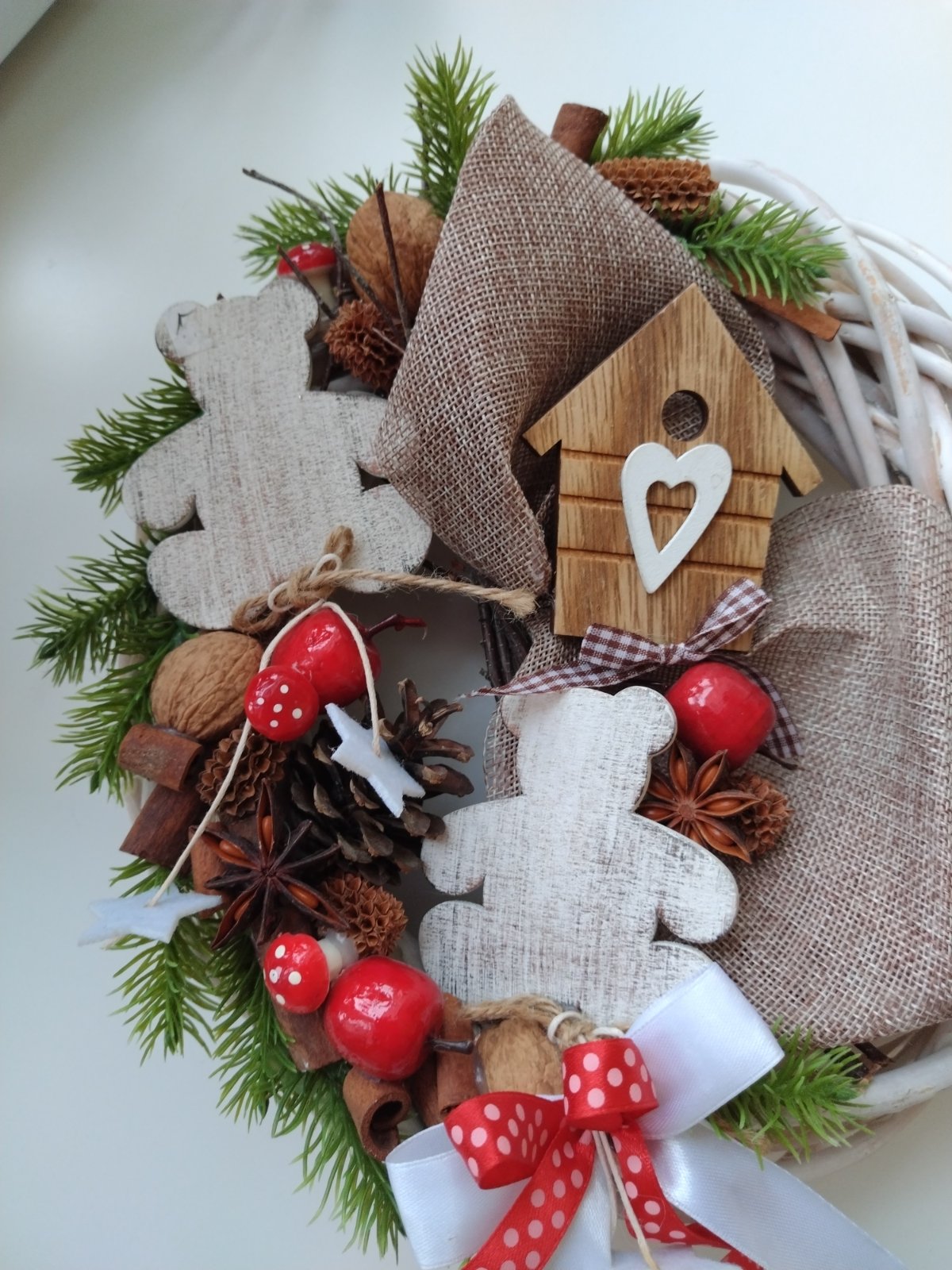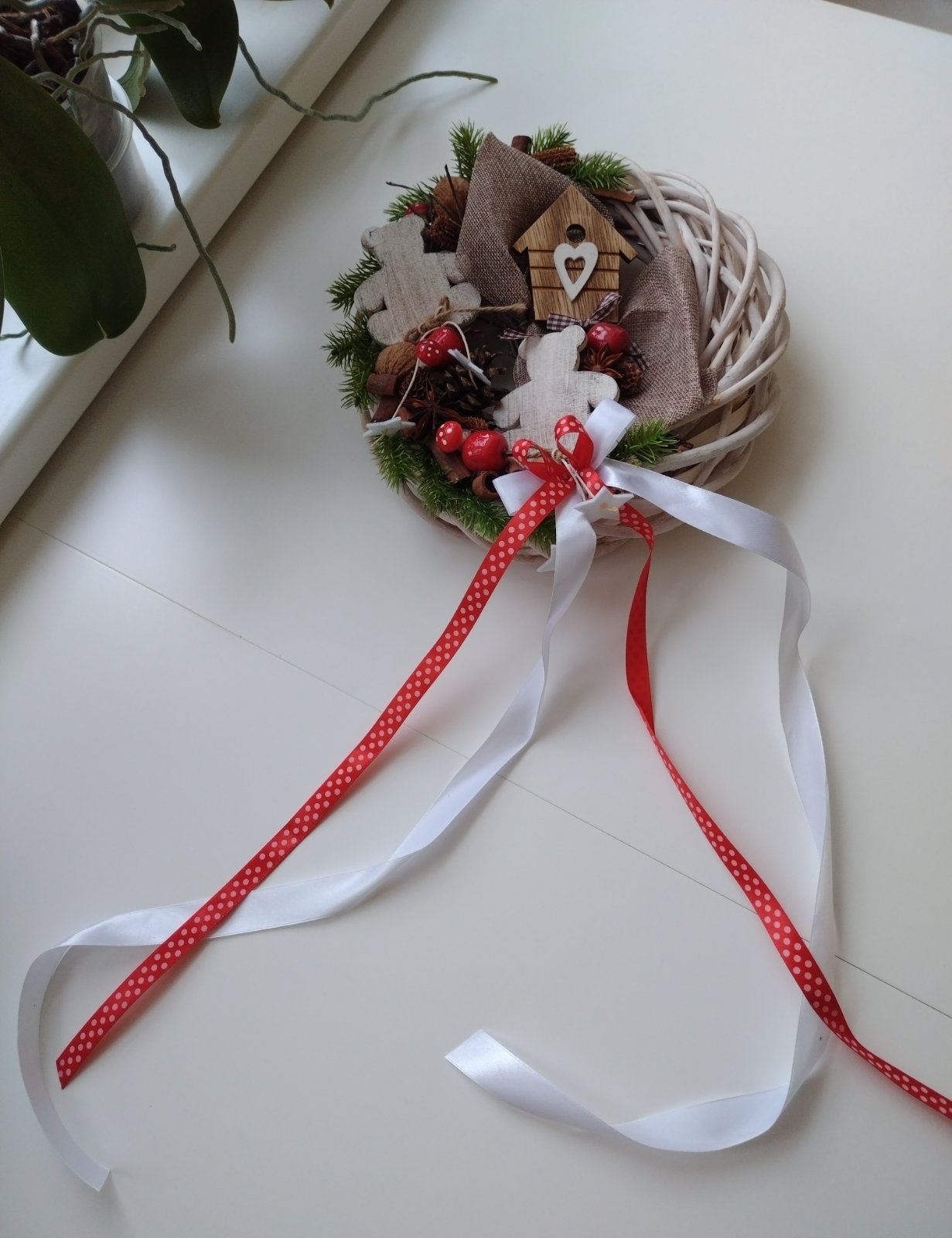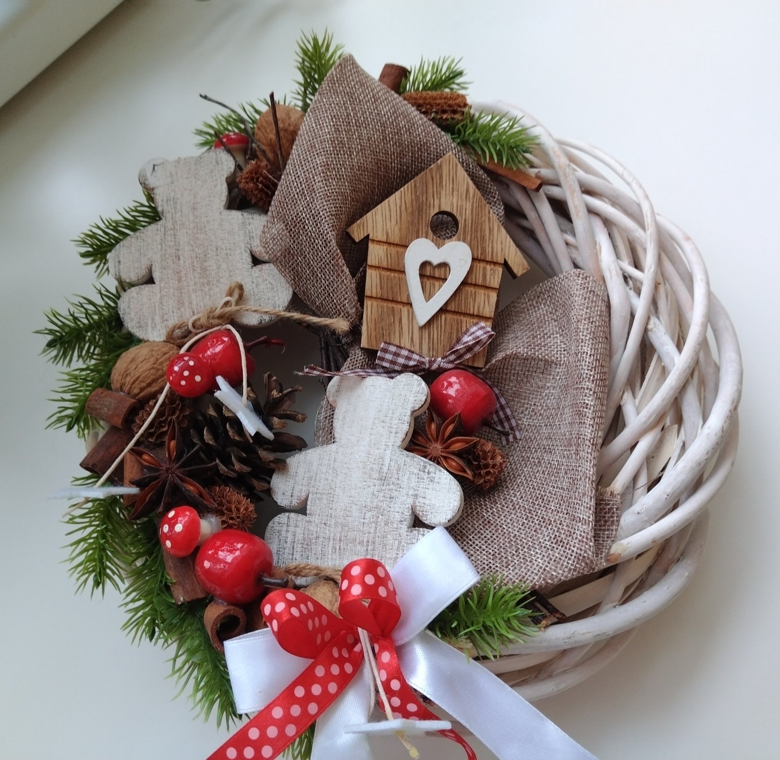 Vianočný veniec - vŕbový pletený veniec bielej farby s dekoráciami z prírodných materiálov, ozdobený stuhami, s možnosťou zavesenia, ako nový.