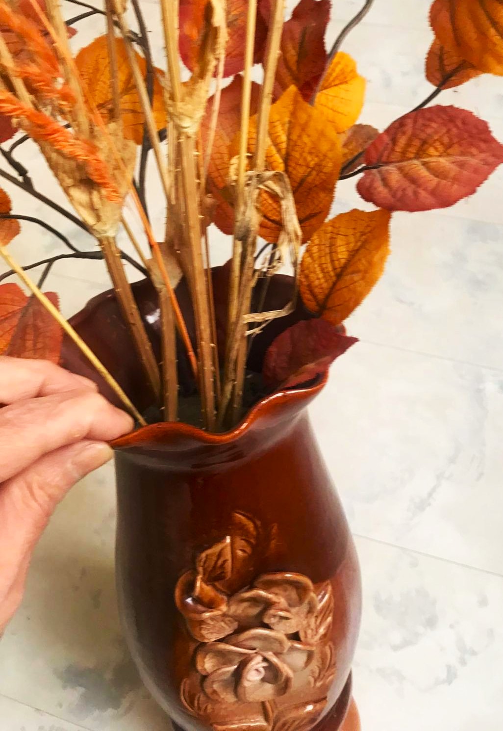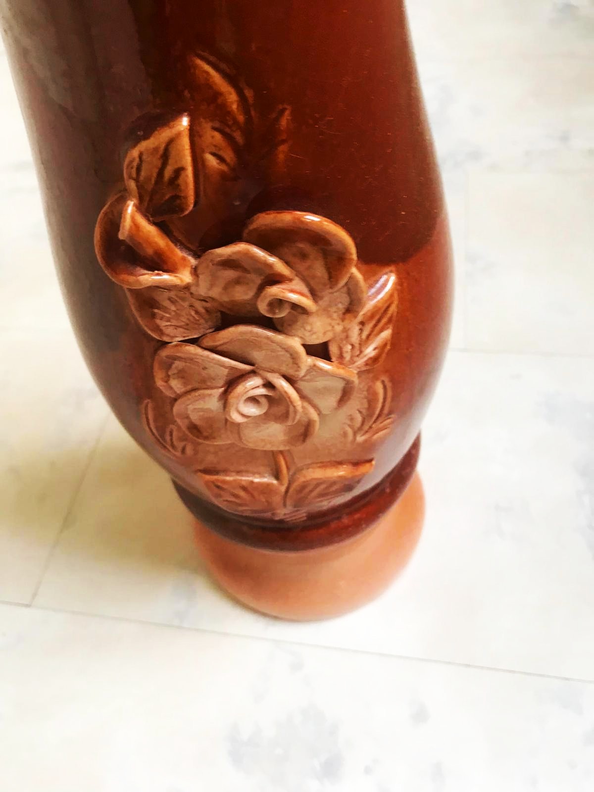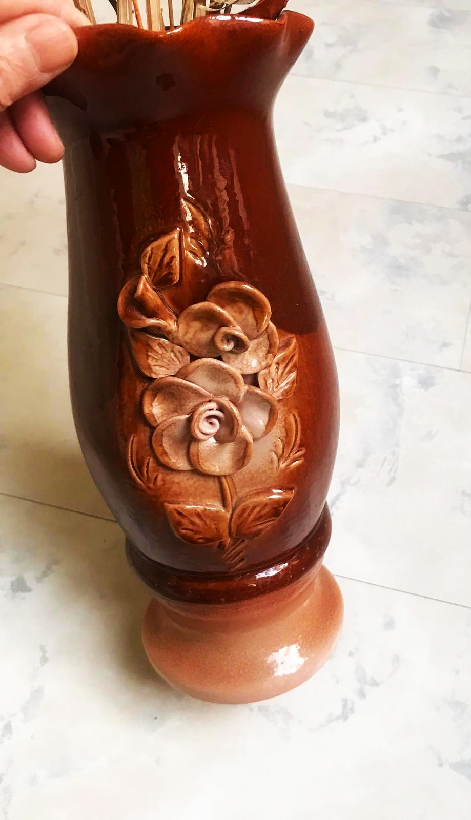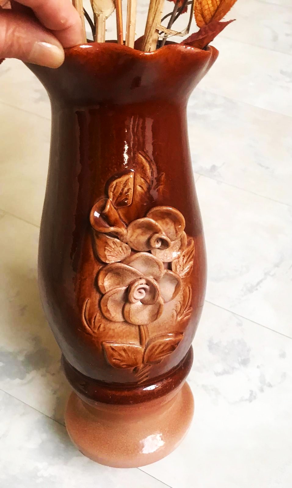 vysoká keramická váza s dekoratívnym tvarovaným okrajom a plastickým vzorom kvetov,čokoládovo hnedá glazúra s plynulým prechodom do svetlejších tónov na podstavci,výška 33 cm,šírka v strede - v najširšej časti 15 cm,pekne vyzerá so sušenými naaranžovanými kvetmi,resp. jesenným lístím &