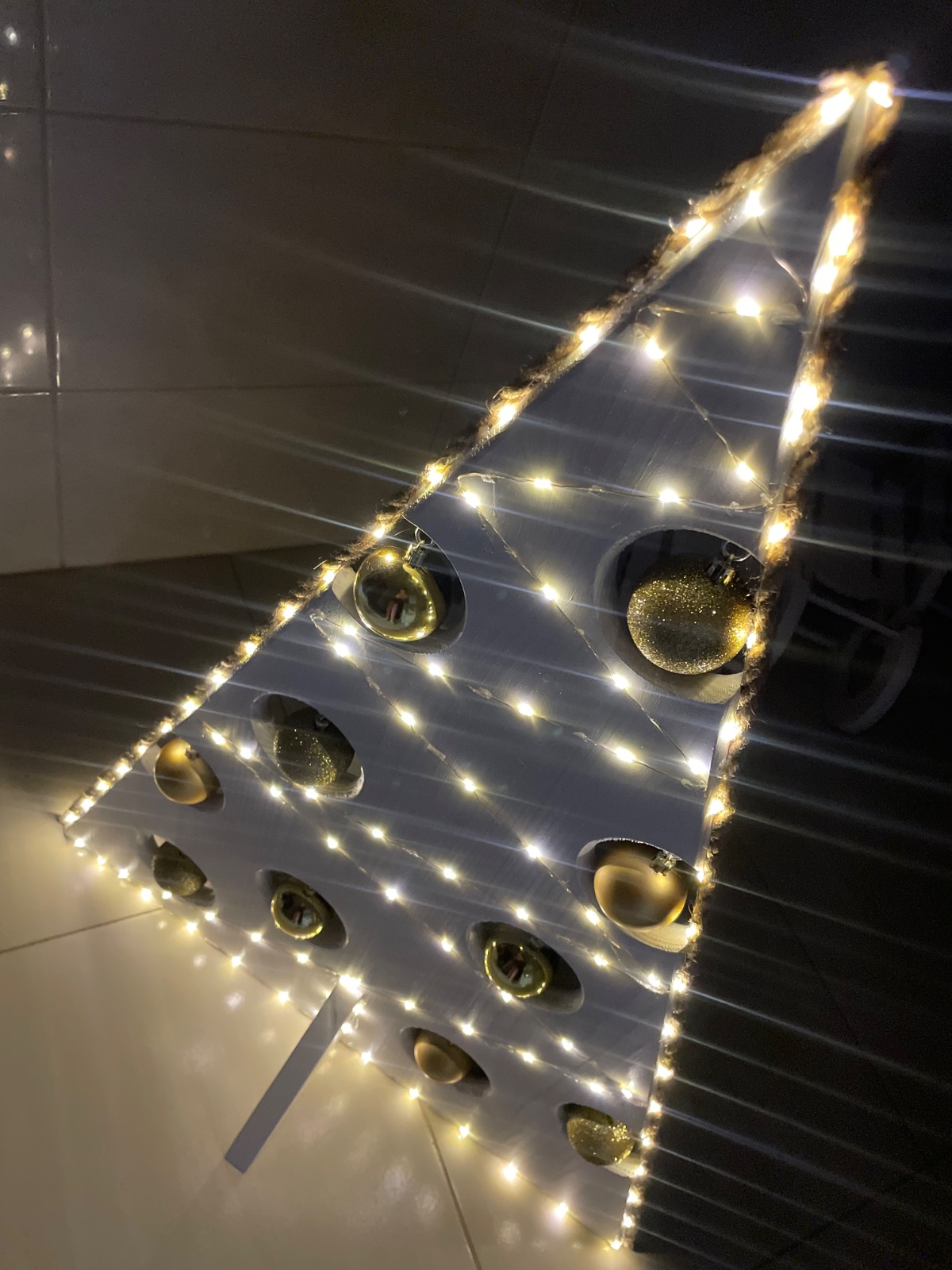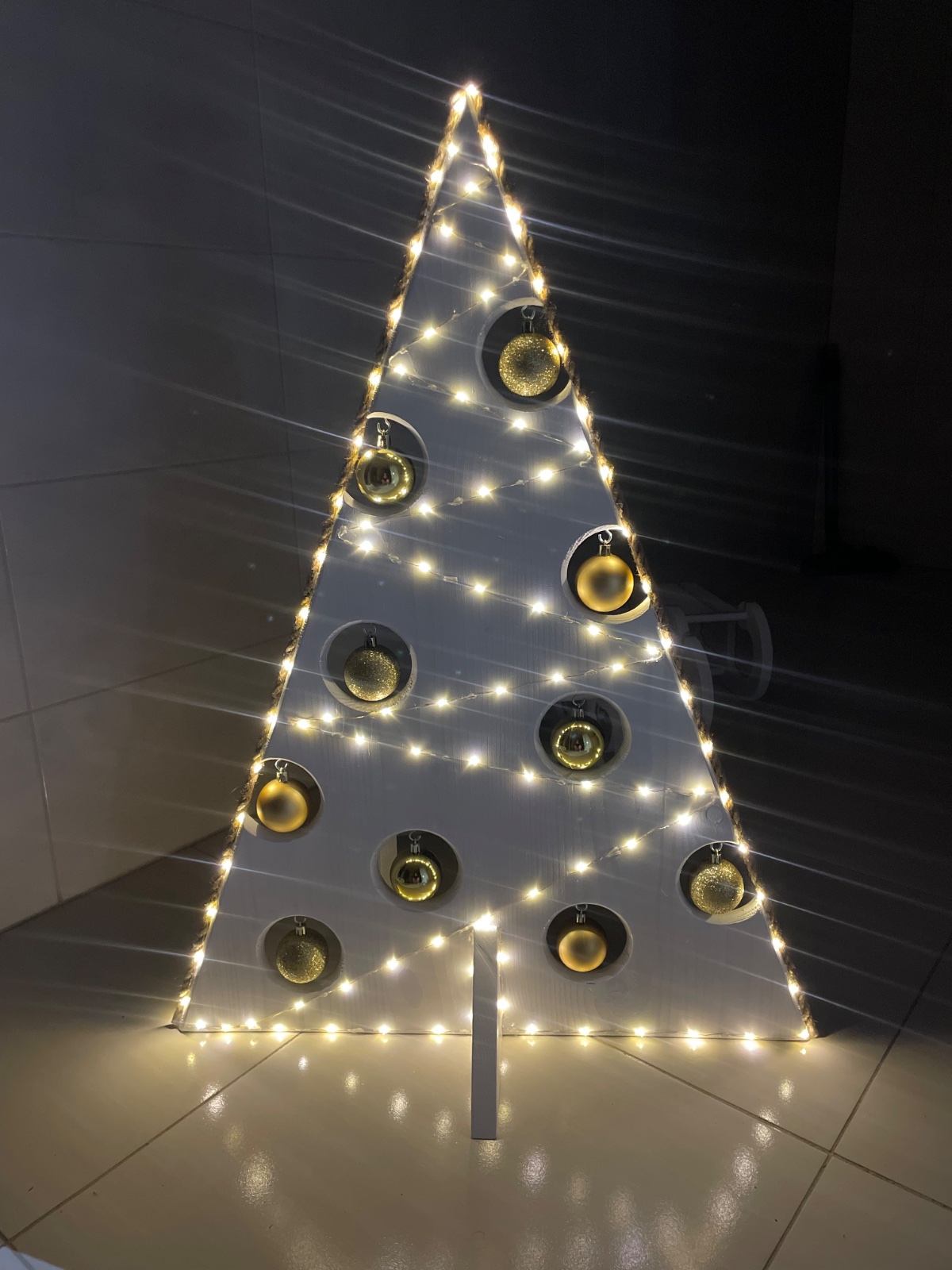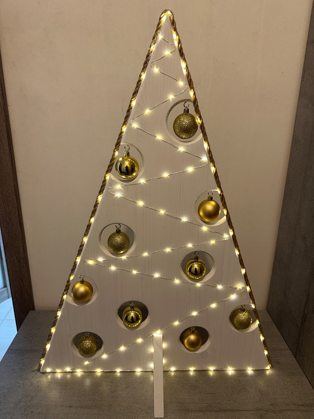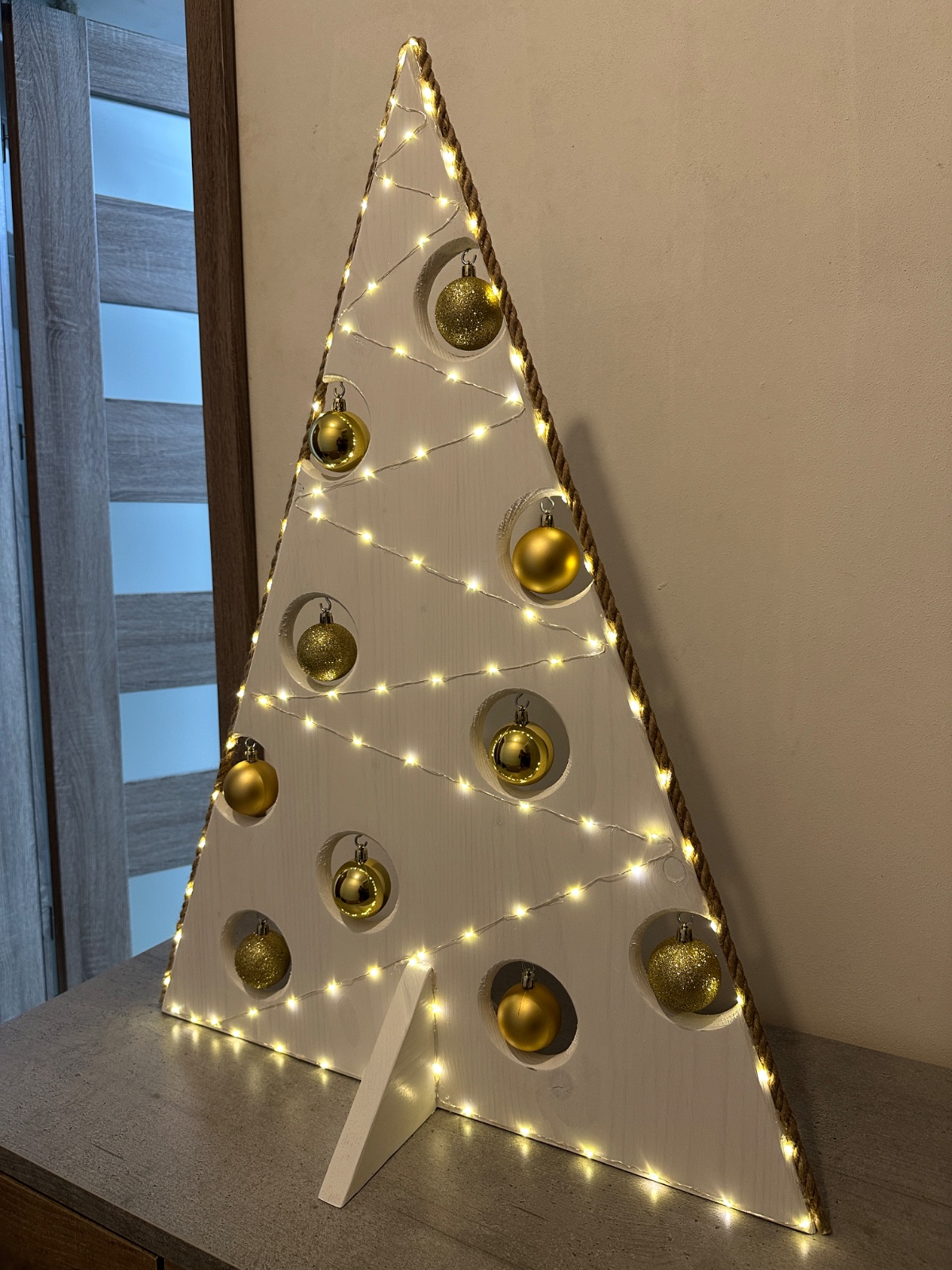 Drevený vianočný stromček s vianočnými guľkami a svetielkami.
