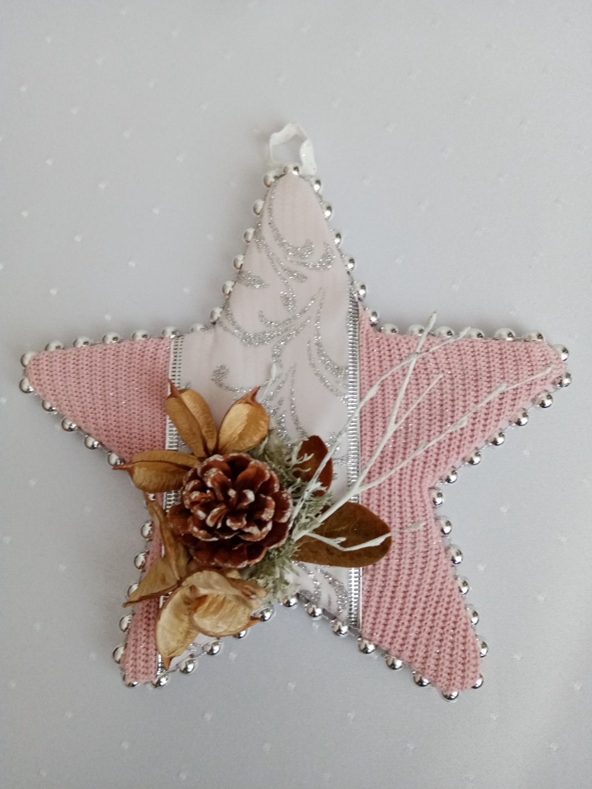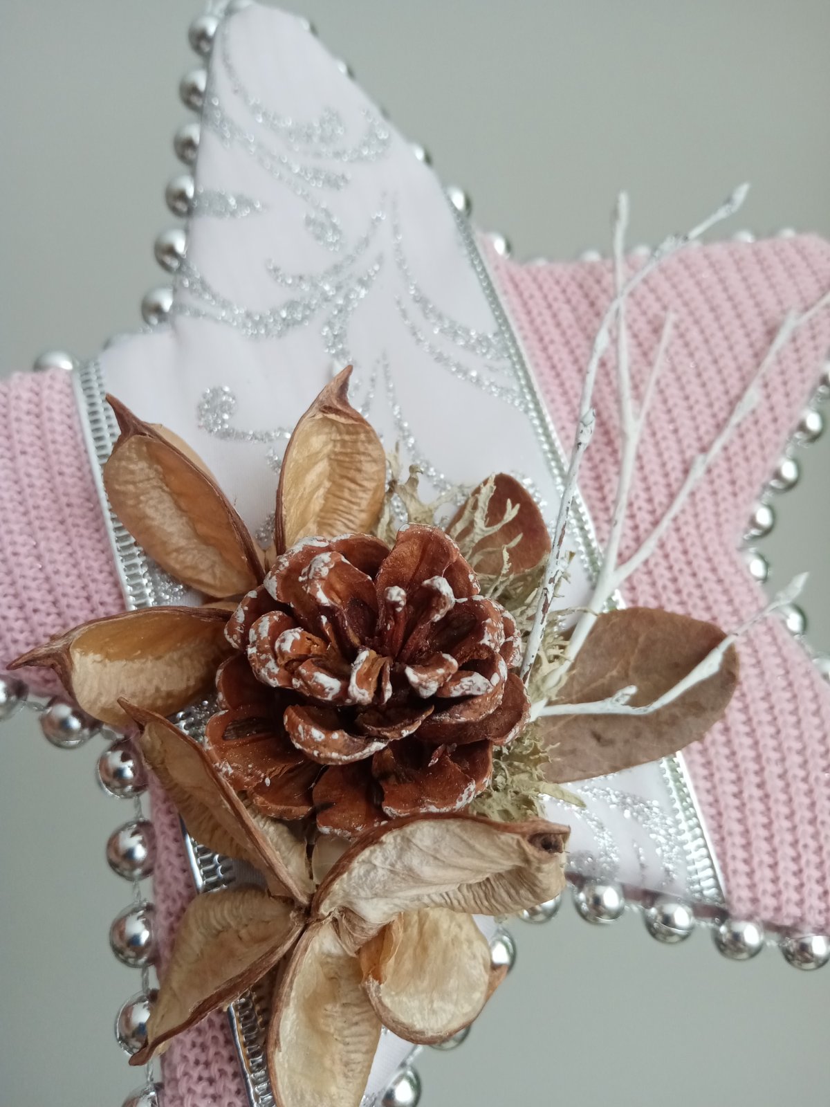Závesná hviezda je vyrobená ručnou prácou z prevažne prírodných a recyklovaných materiálov, v elegantnej jemnej kombinácii ružovej, striebornej, bielej a béžovej farby. Stačí ju zavesiť na dvere, na stenu, či okno a zútuľniť si tak domov počas vianočného obdobia.