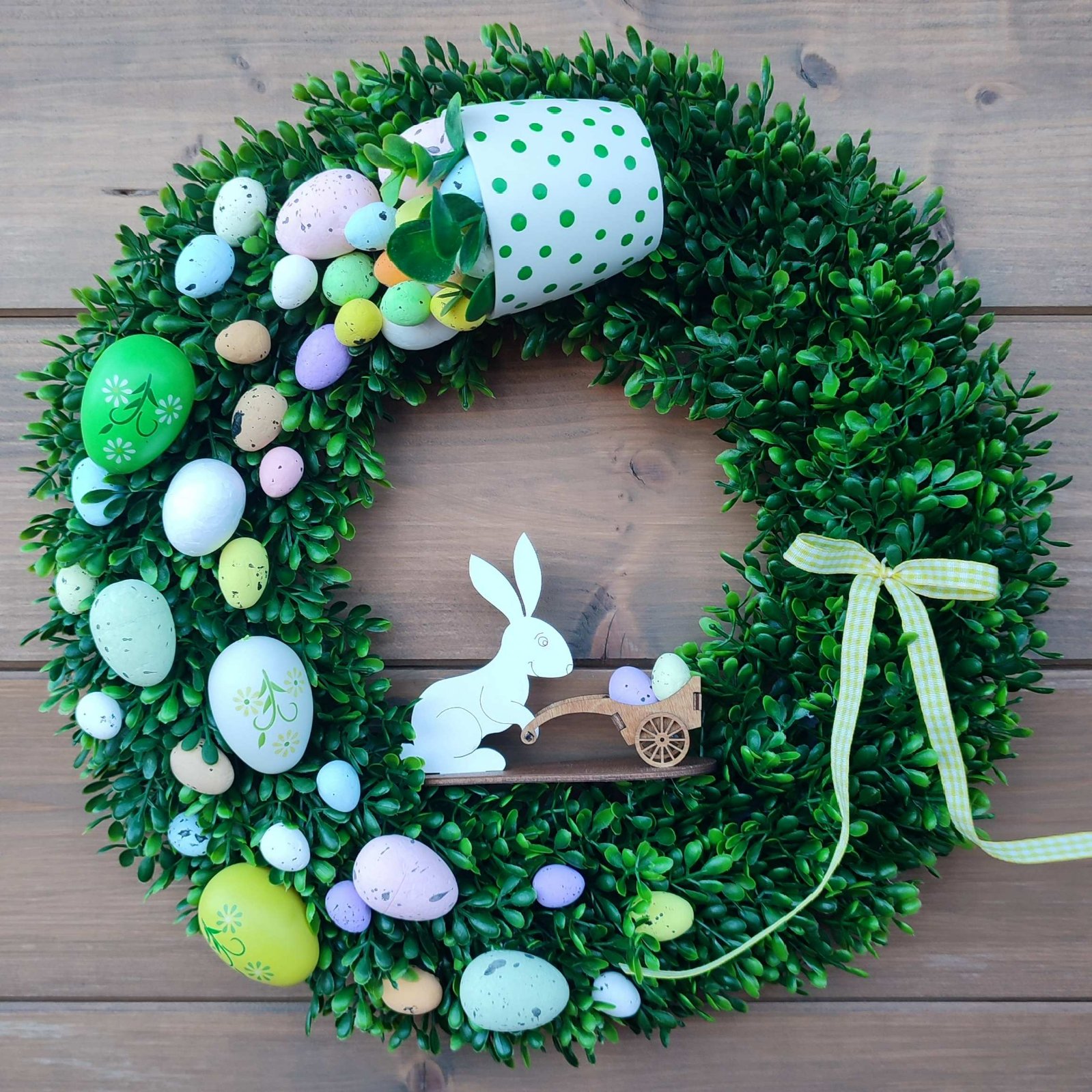 Ponúkam Vám krásny zelený veniec s drobnými lístkami z umelého materiálu. Veniec je dozdobený bodkovaným kvetináčom, z ktorého 'vypadávajú' vajíčka rôznych veľkostí a farieb. V strede venčeka je drevený zajačik s vozíkom. Na venčeku je aj stužka.