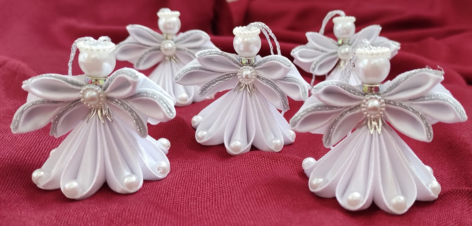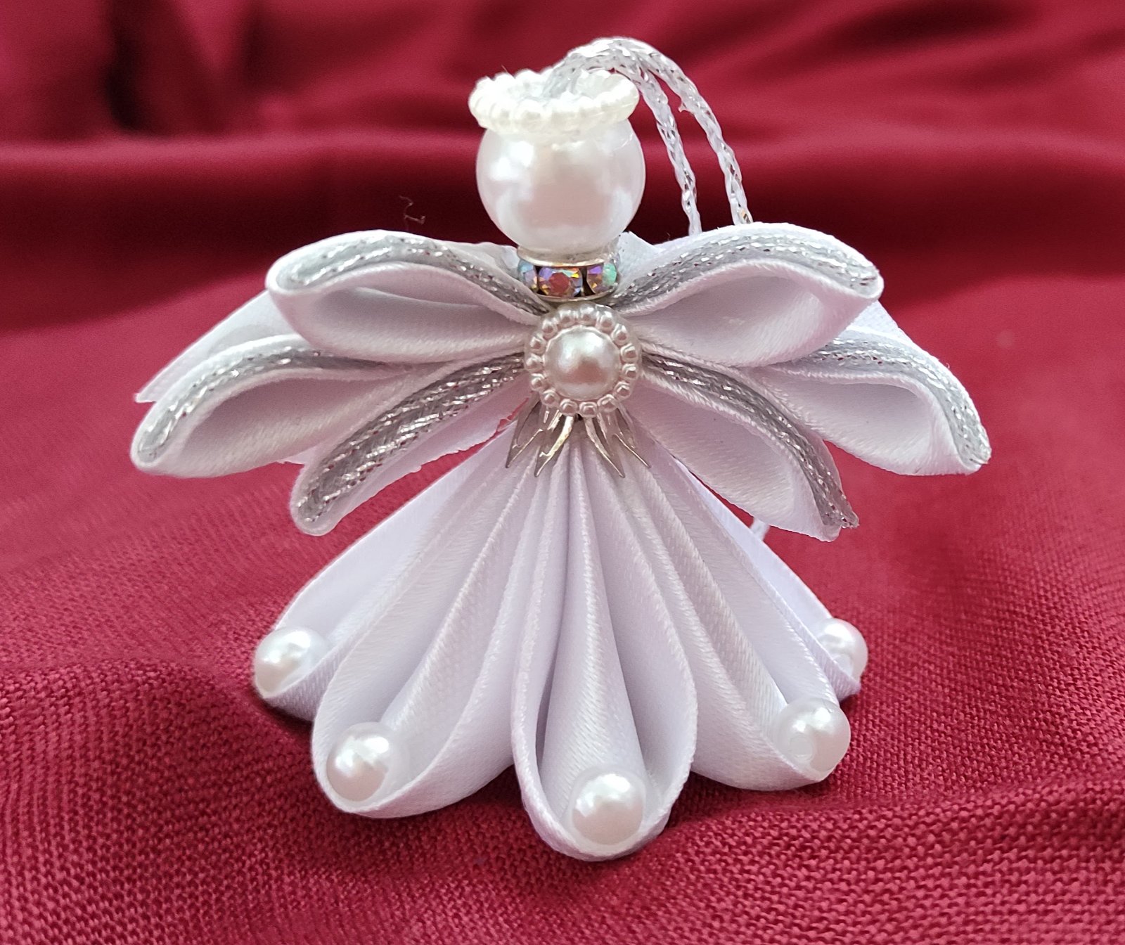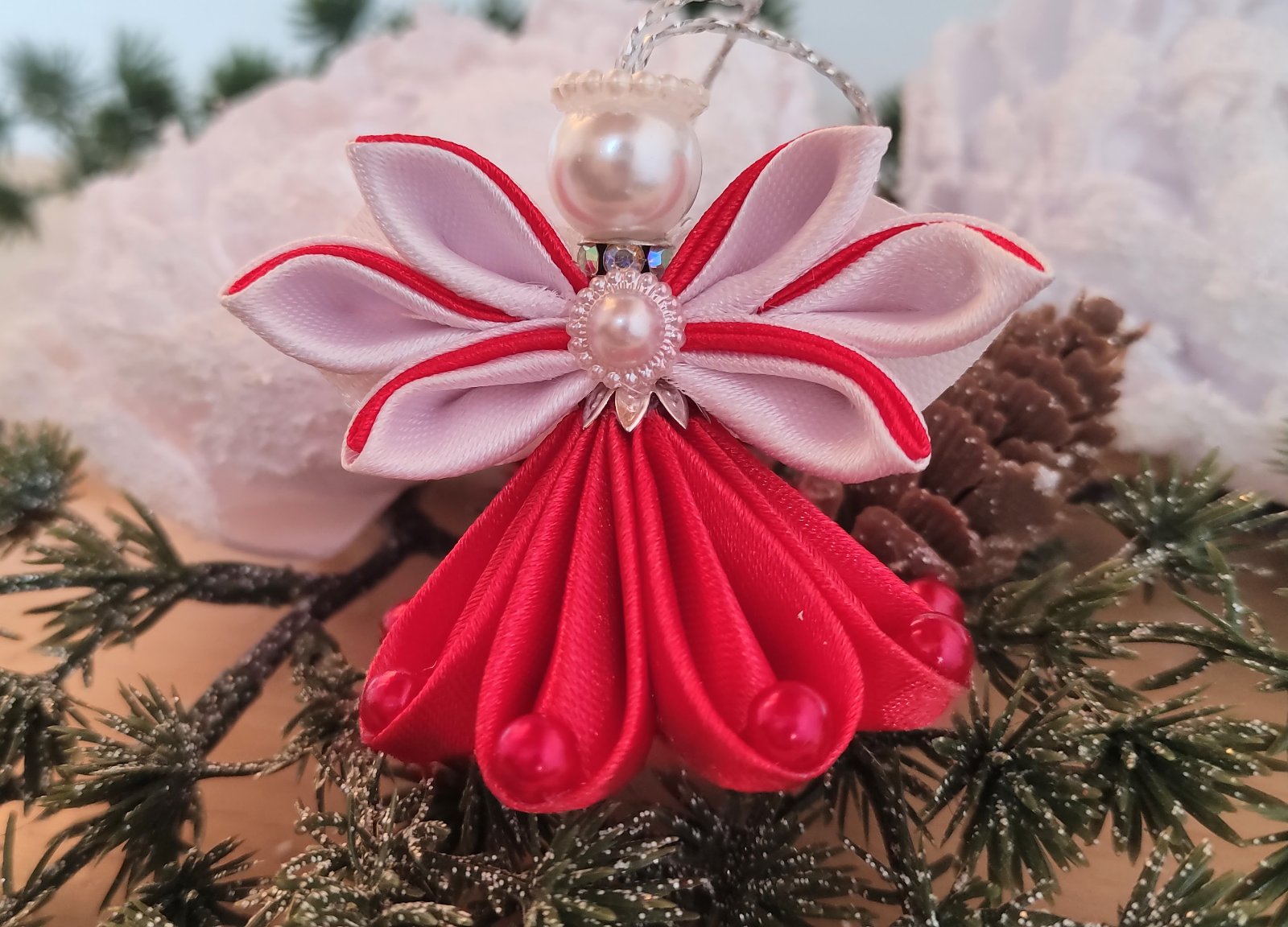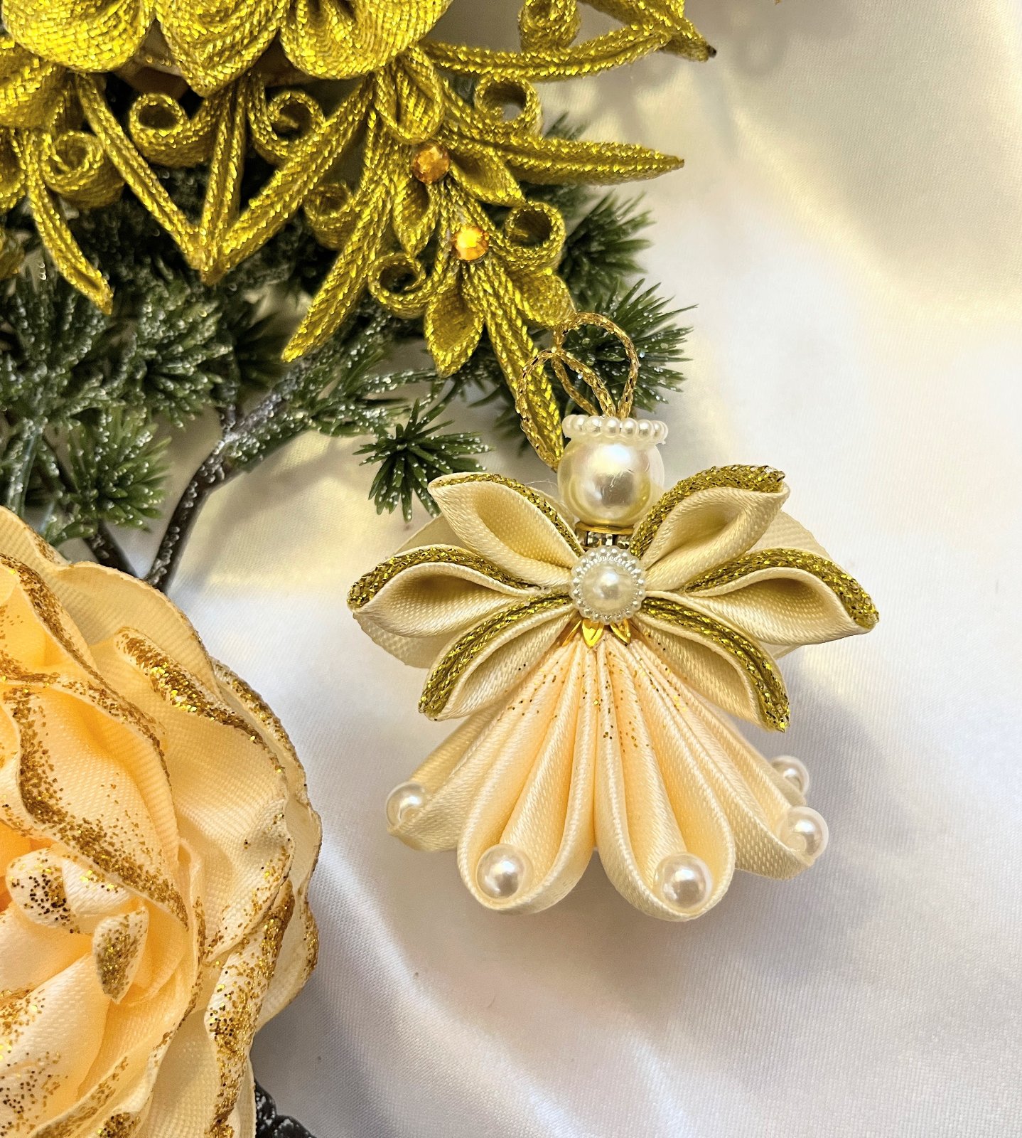 Tento ručne vyrobený anjel z jemnej saténovej a lesklej organzovej stuhy dodá vašej vianočnej výzdobe nebeský pôvab.