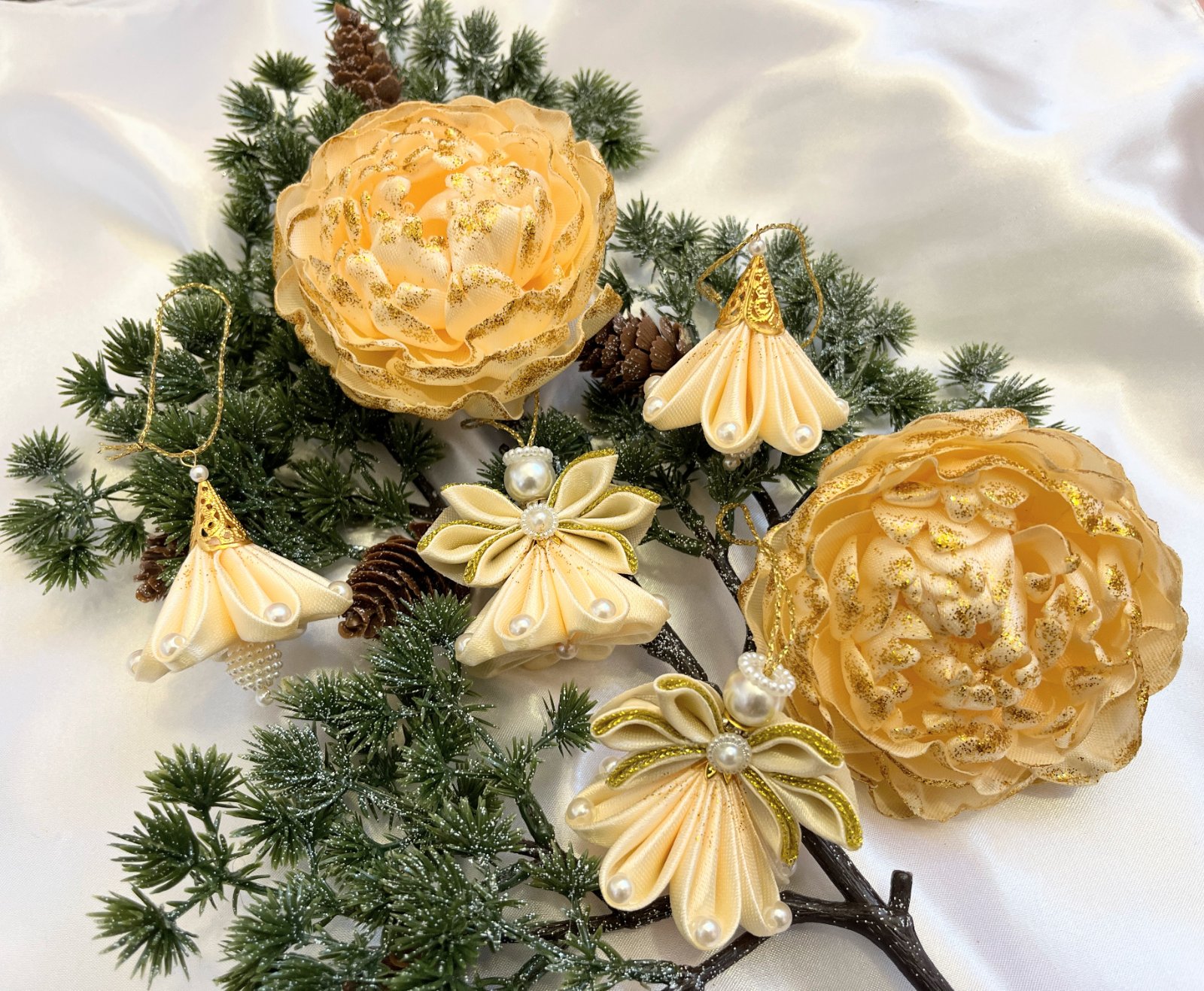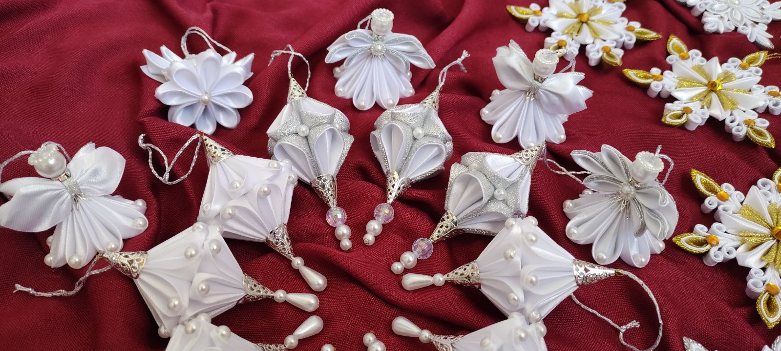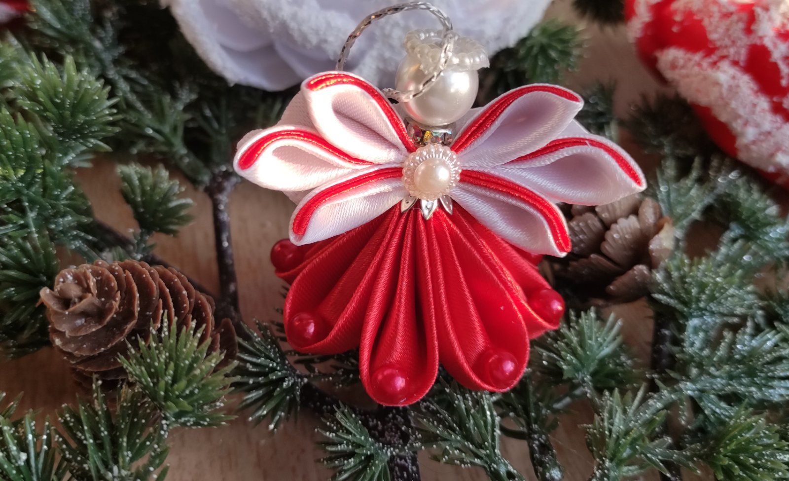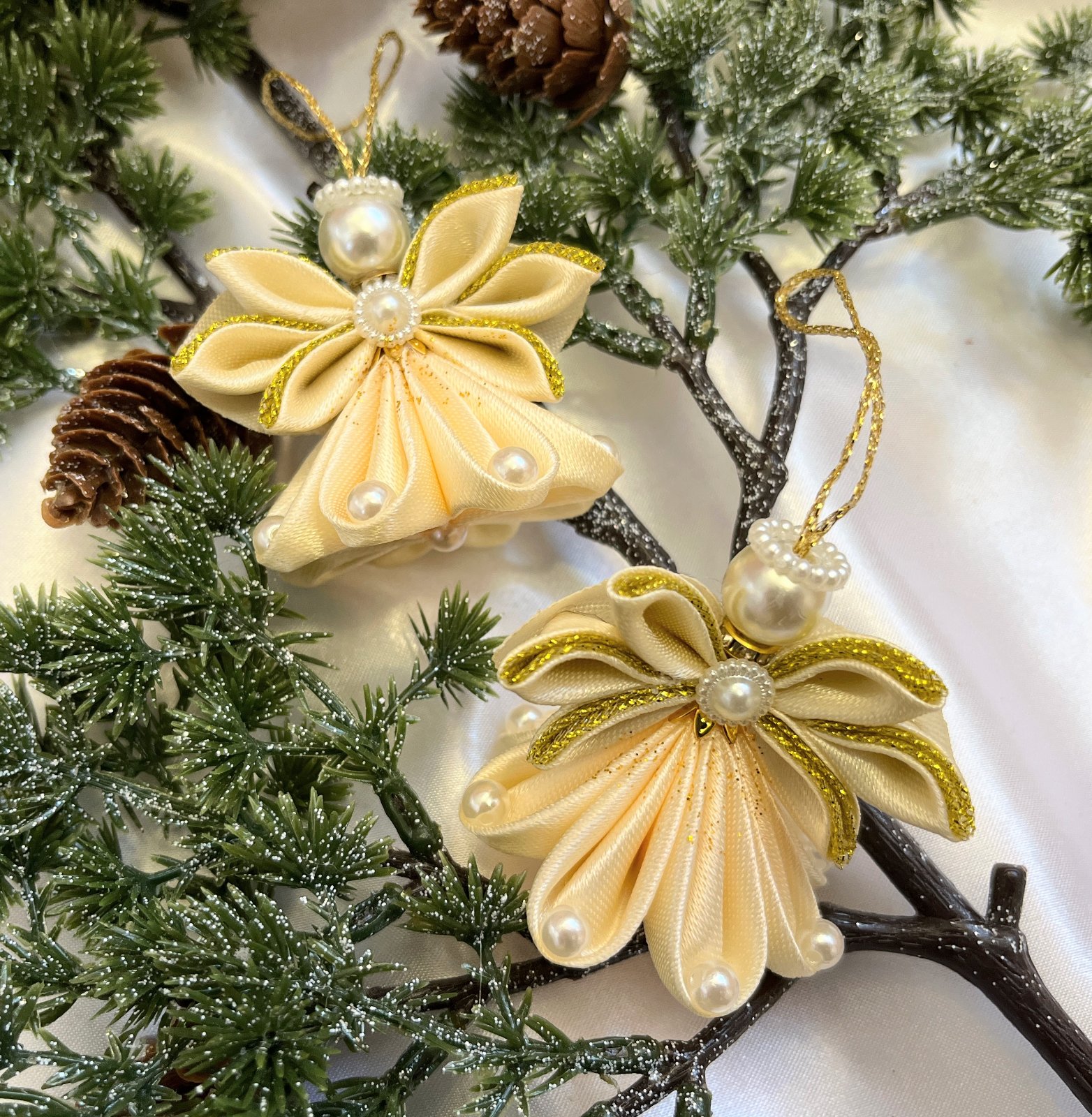 Tento ručne vyrobený anjel z jemnej saténovej a lesklej organzovej stuhy dodá vašej vianočnej výzdobe nebeský pôvab.