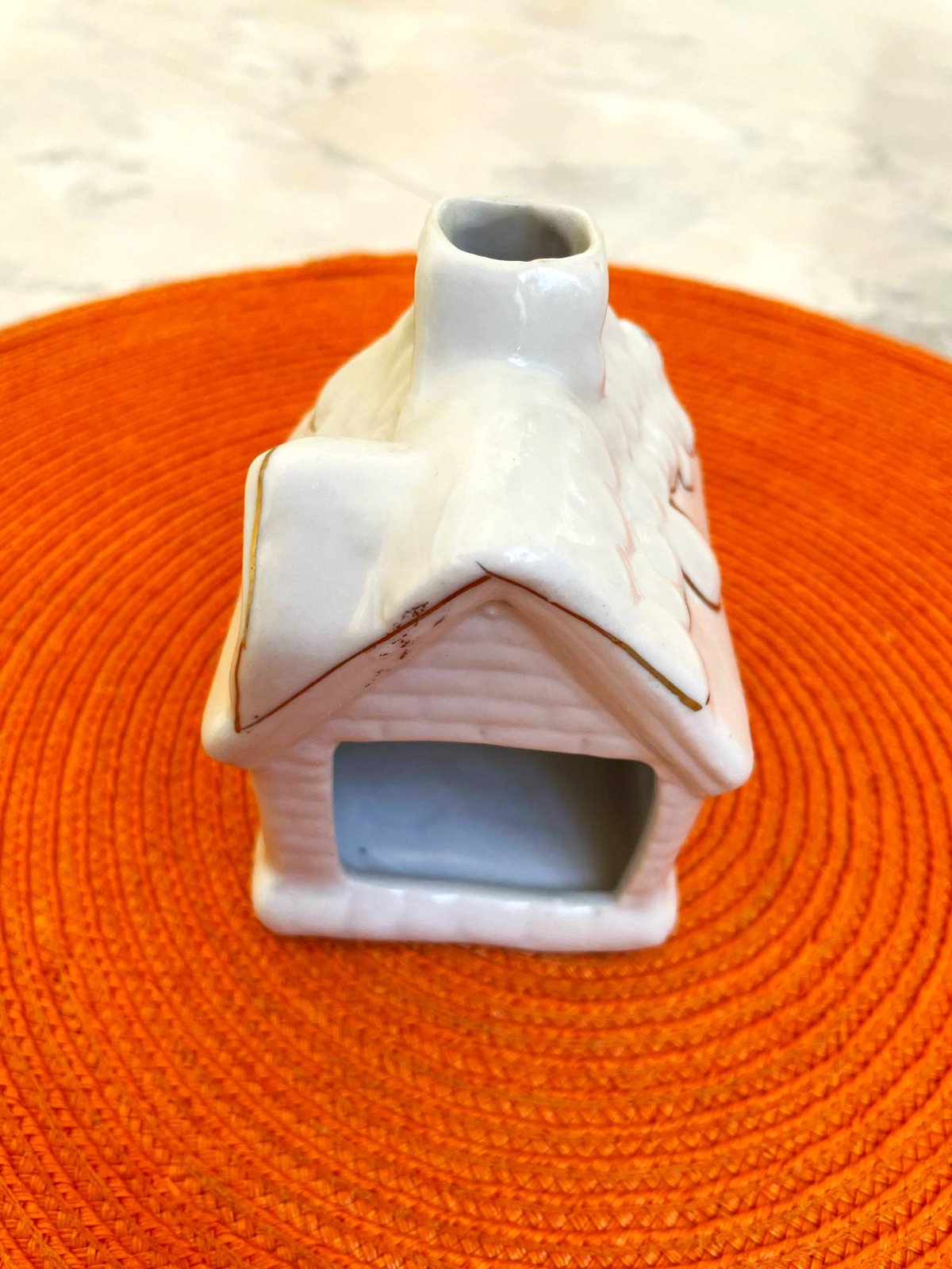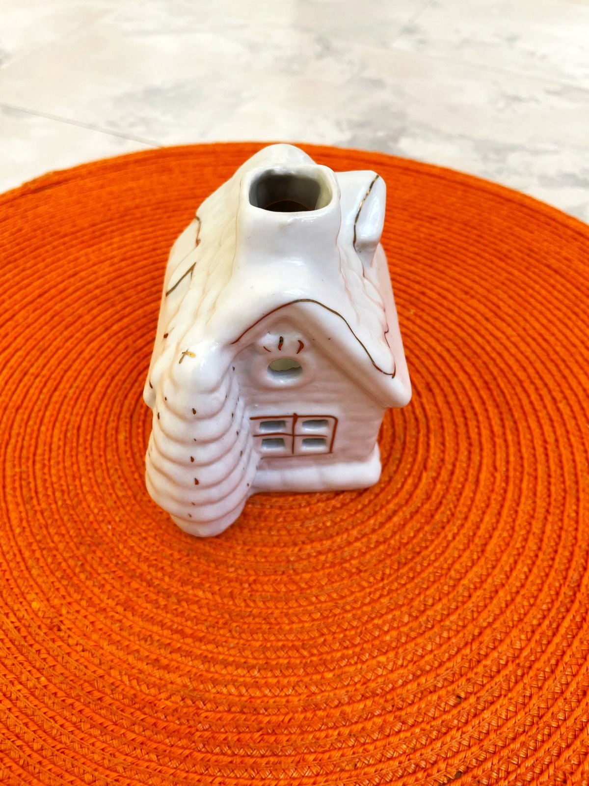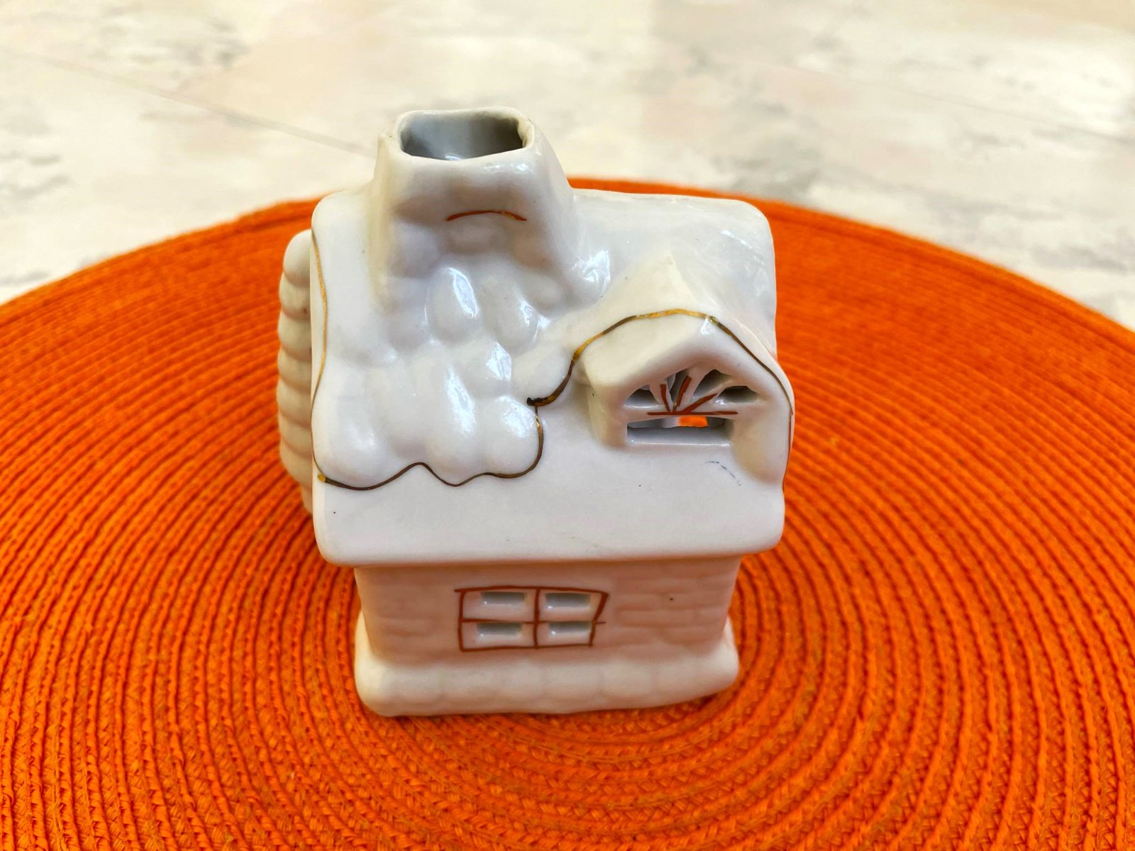 porcelánová chalúpka,krásna jemná ozdoba na Vianoce,cez okienka bliká svetlo od sviečky,7 x 8 cm, výška = 10 cm