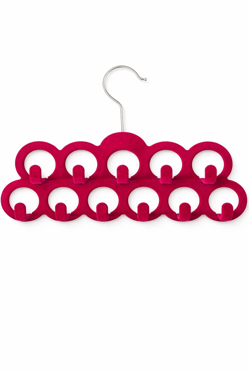 Praktický a elegantný vešiak potiahnutý jemným zamatovým povrchom, ktorý pomáha udržať poriadok v skrini a šetrí miesto. Obsahuje 11 kruhových otvorov s háčikmi, vďaka ktorým môžete prehľadne uložiť viac kusov doplnkov na jeden vešiak.