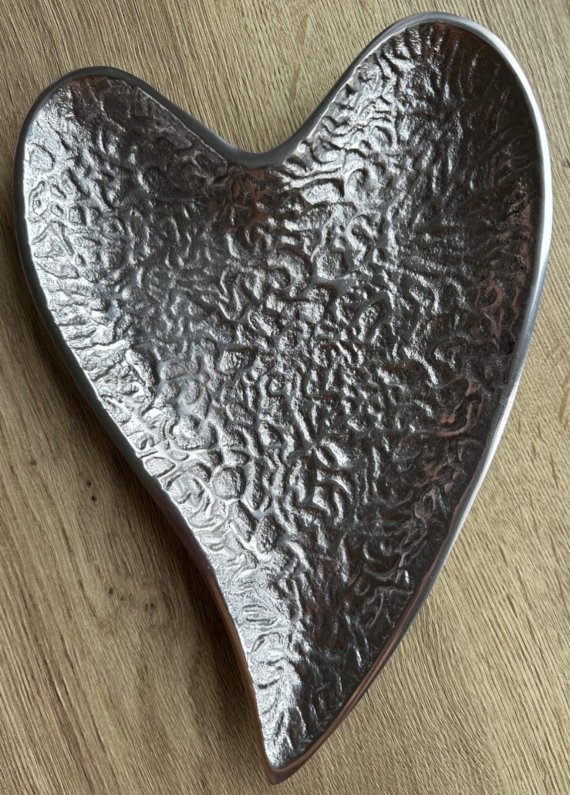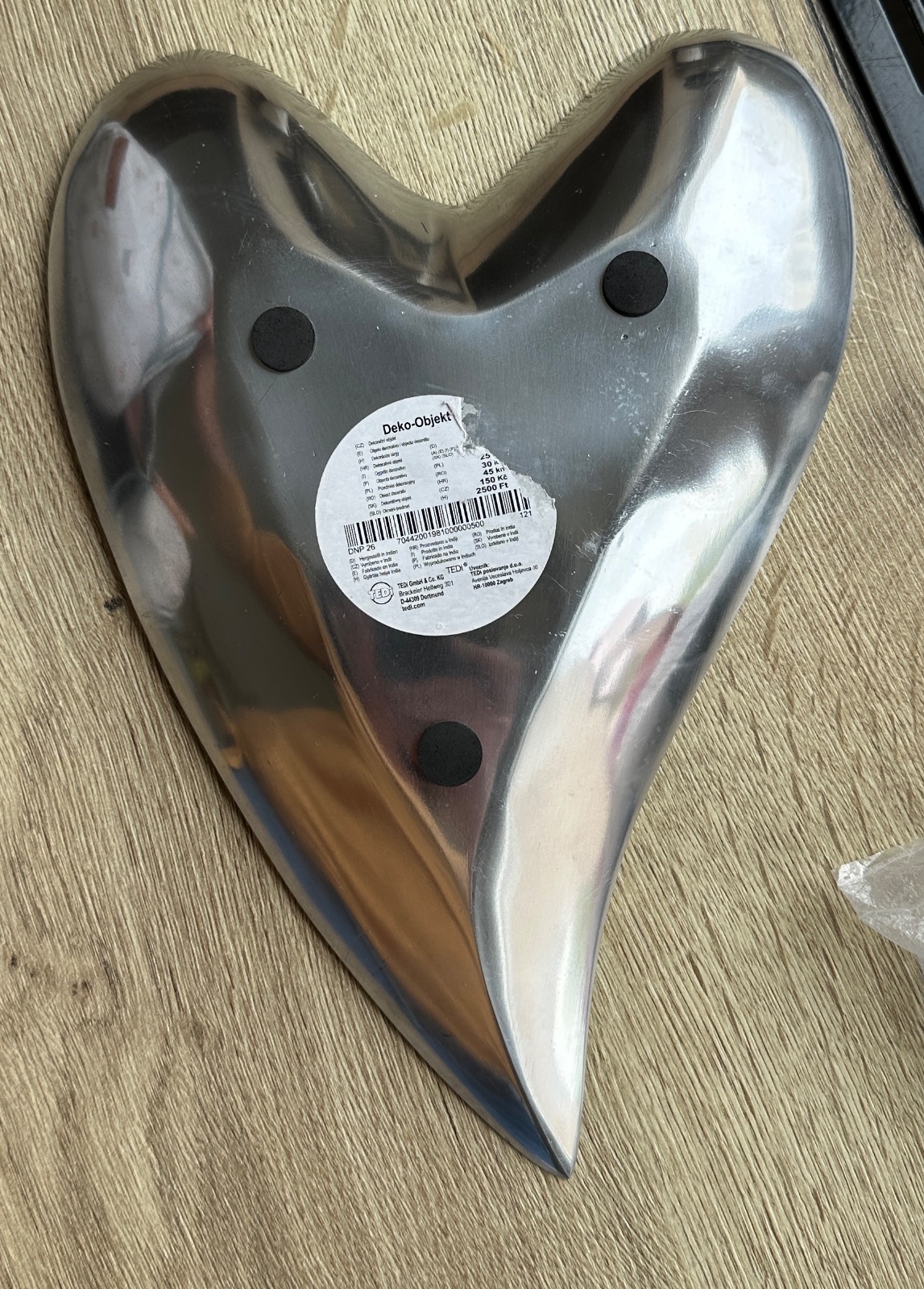 ☘️❤️Stav ako nove. 30x21cm najvacsi rozmer....Ide o dekoratívne srdce z kovu od značky TEDi (nemecký diskontný reťazec). Predná strana – miska/tácňa v tvare srdca s ručne tepanou (hammered) textúrou, strieborná farba, matný povrch. Zadná strana – hladká, lesklá, so štítkom. 3 gumové nožičky na spodku. Použitie: dekoratívna miska/tácňa – na šperky, drobnosti, kľúče alebo čisto ako ozdoba☘️❤️