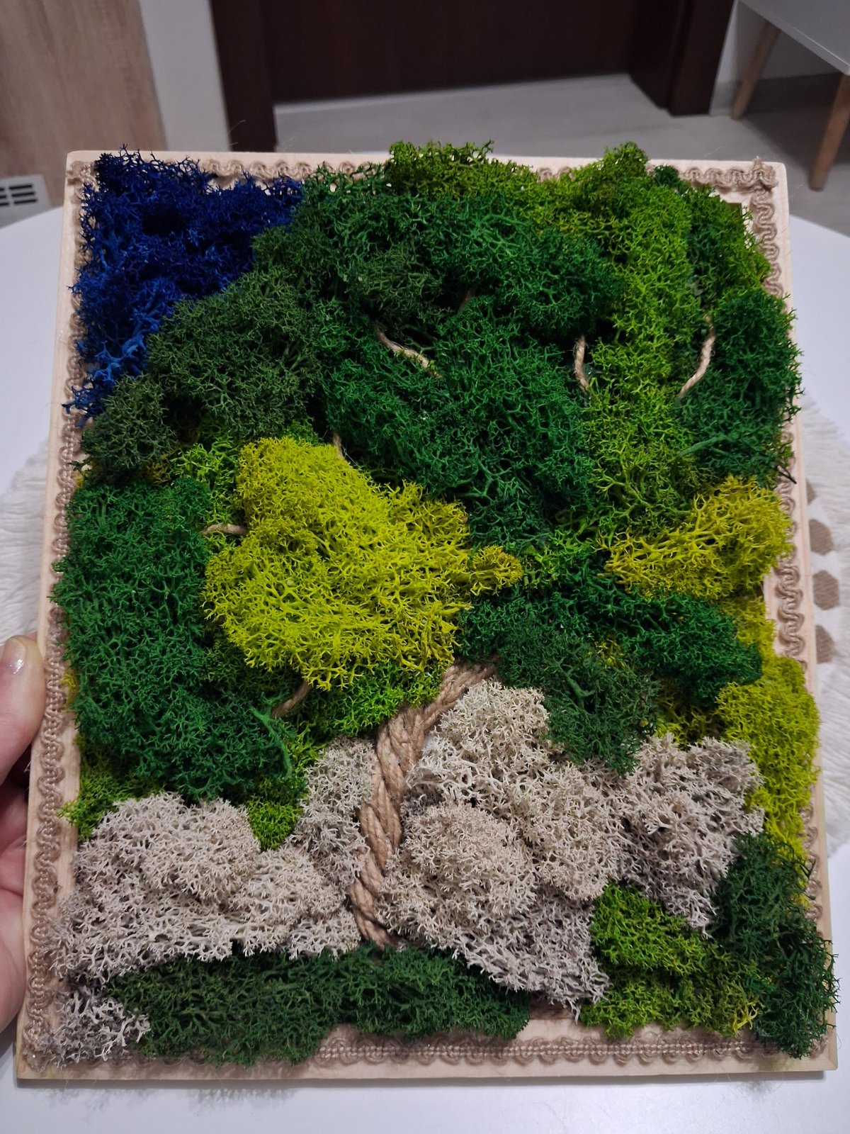 Krásny machový obraz s rozmermi 25x30cm zo stabilizovaného machu (lišajník), mach je bezúdržbový a hypoalergénny, vzadu háčik na zavesenie