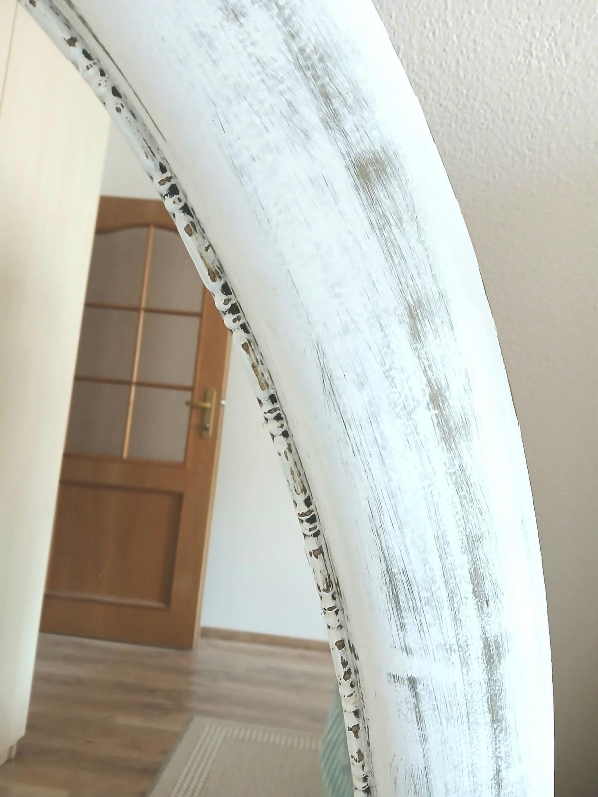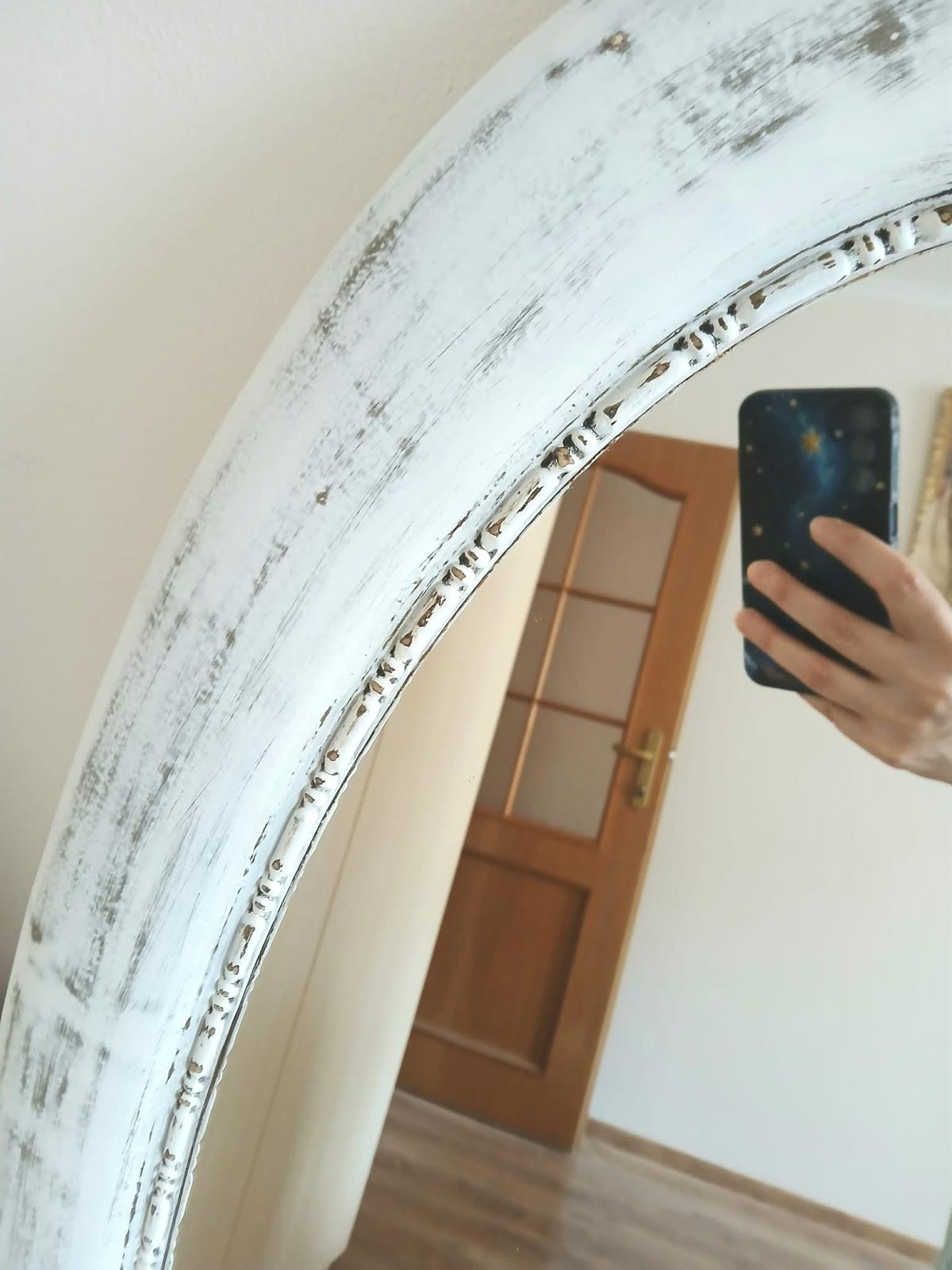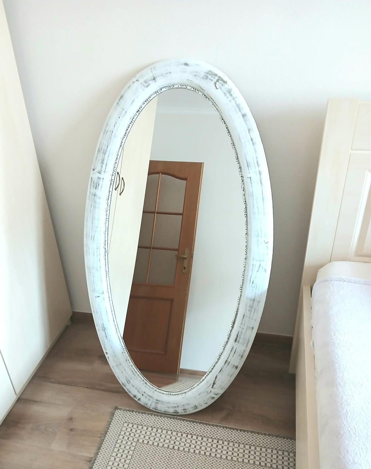 Krásne, biele, vidiecke zrkadlo s vintage efektom zošúchanej farby, ktorého rozmery sú: 127*70cm. Zrkadlo je ťažšie, má ovalný tvar, rám je drevený. Je možné ho zavesiť horizontálne aj vertikálne. Čistý stav. Cena 30Eur. Osobný odber Púchov.