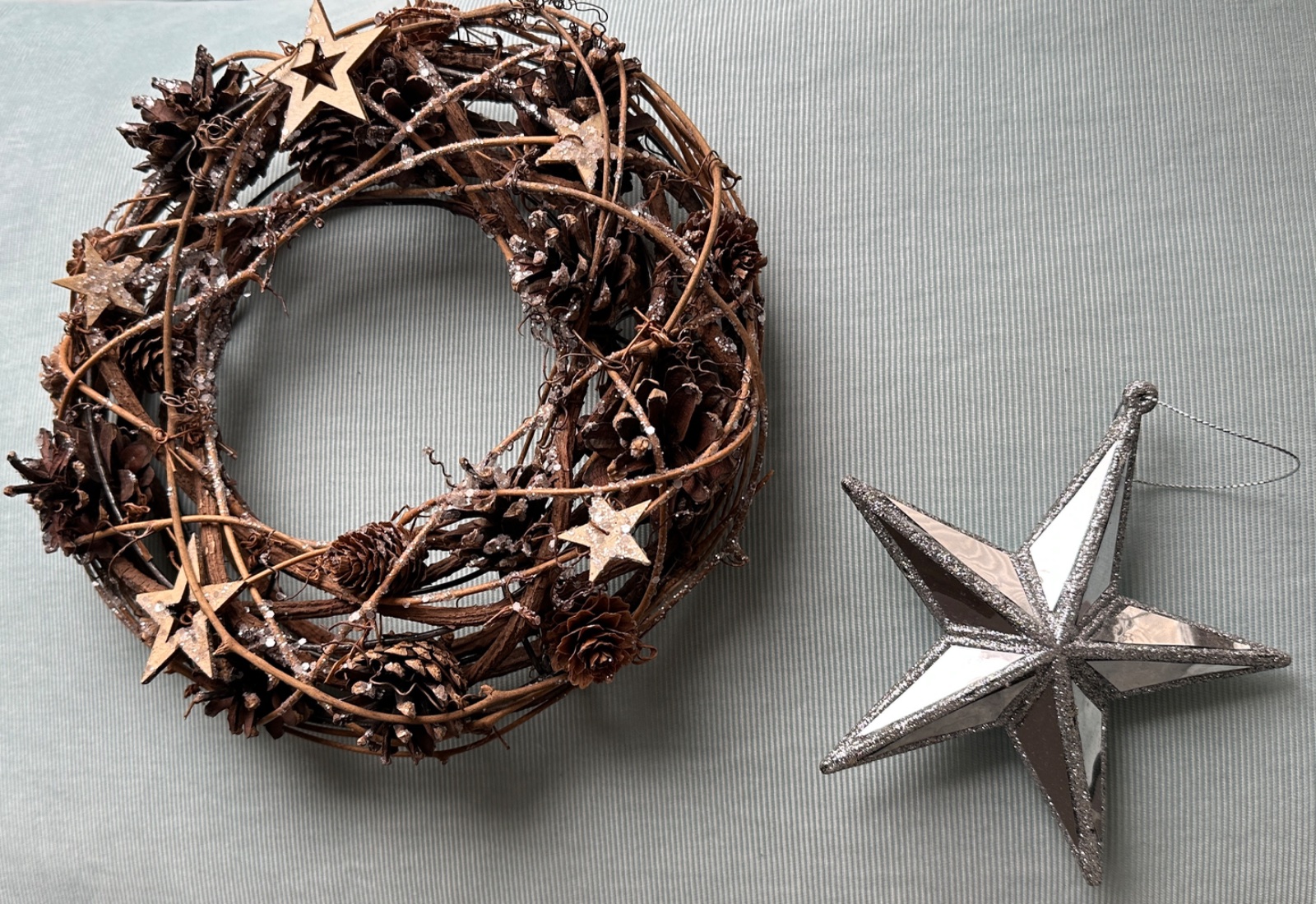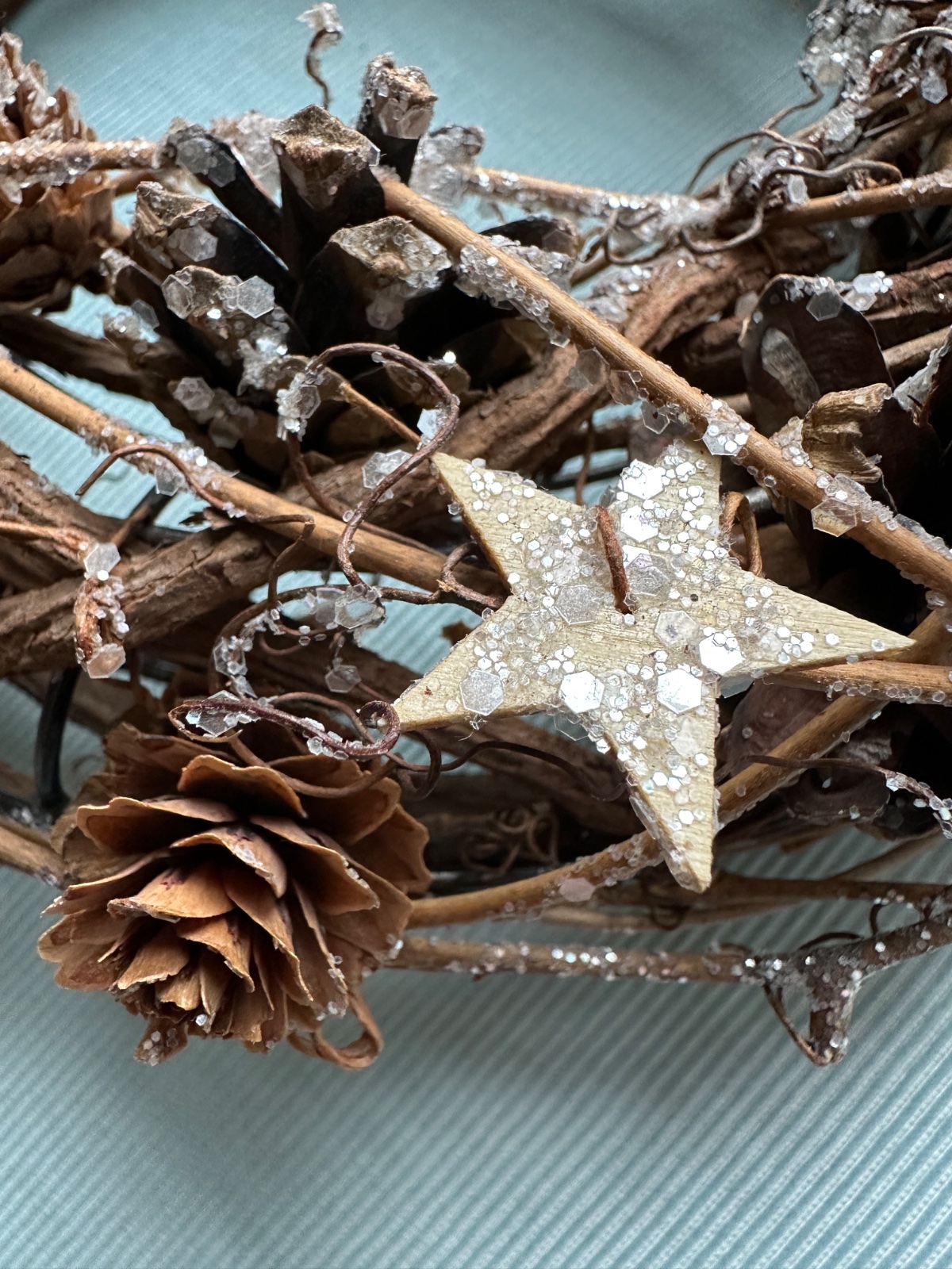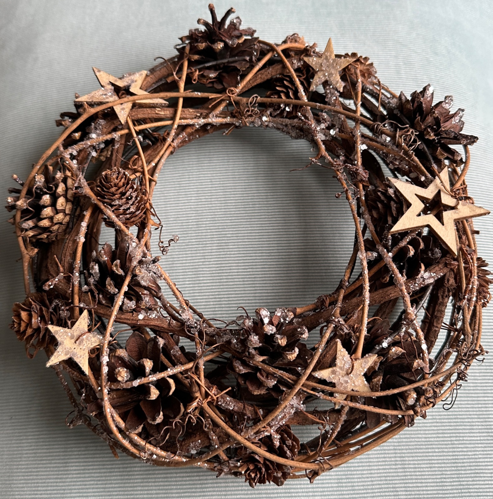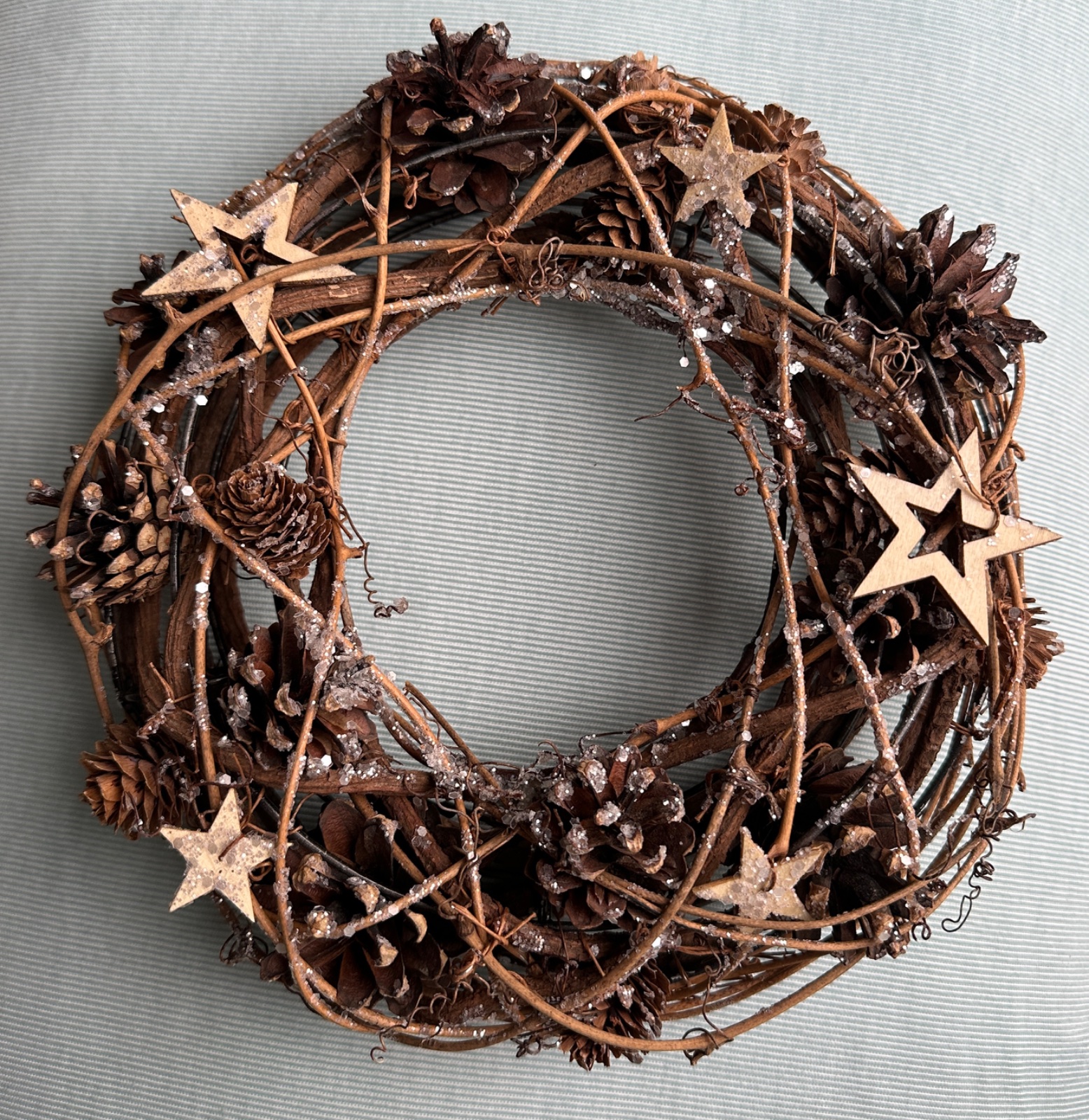❤️☘️Predám ručne viazaný prírodný veniec z konárikov,malé šišky, drevené hviezdičky, jemný trblietavý “mráz”.Priemer je 25-26cm venca.Pevná konštrukcia, vhodný na dvere, stenu alebo stôl.Bez poškodení so striebornou hviezdou (pevná plastová konštrukcia,strieborný lesk + zrkadlové plochy.)SH sa dá zavesiť na stromček alebo použiť ako samostatná dekorácia. Krajšie naživo ako na foto...❤️☘️