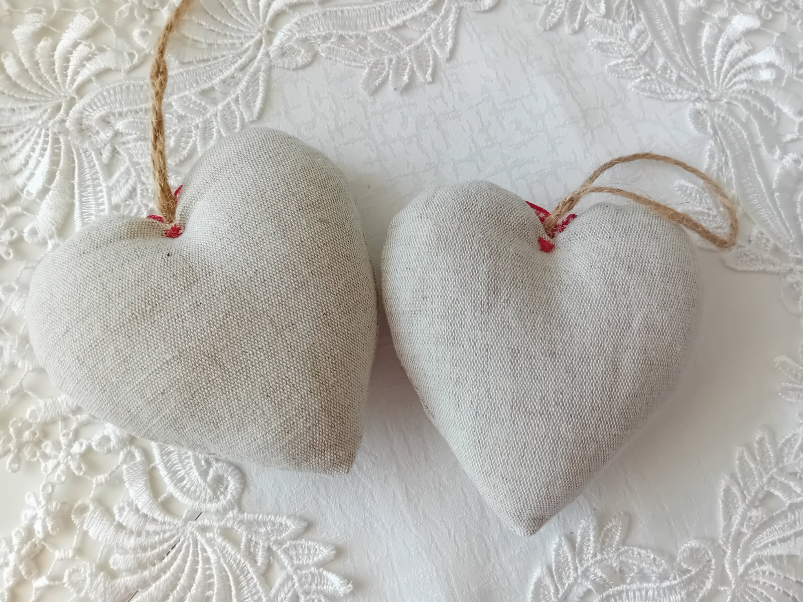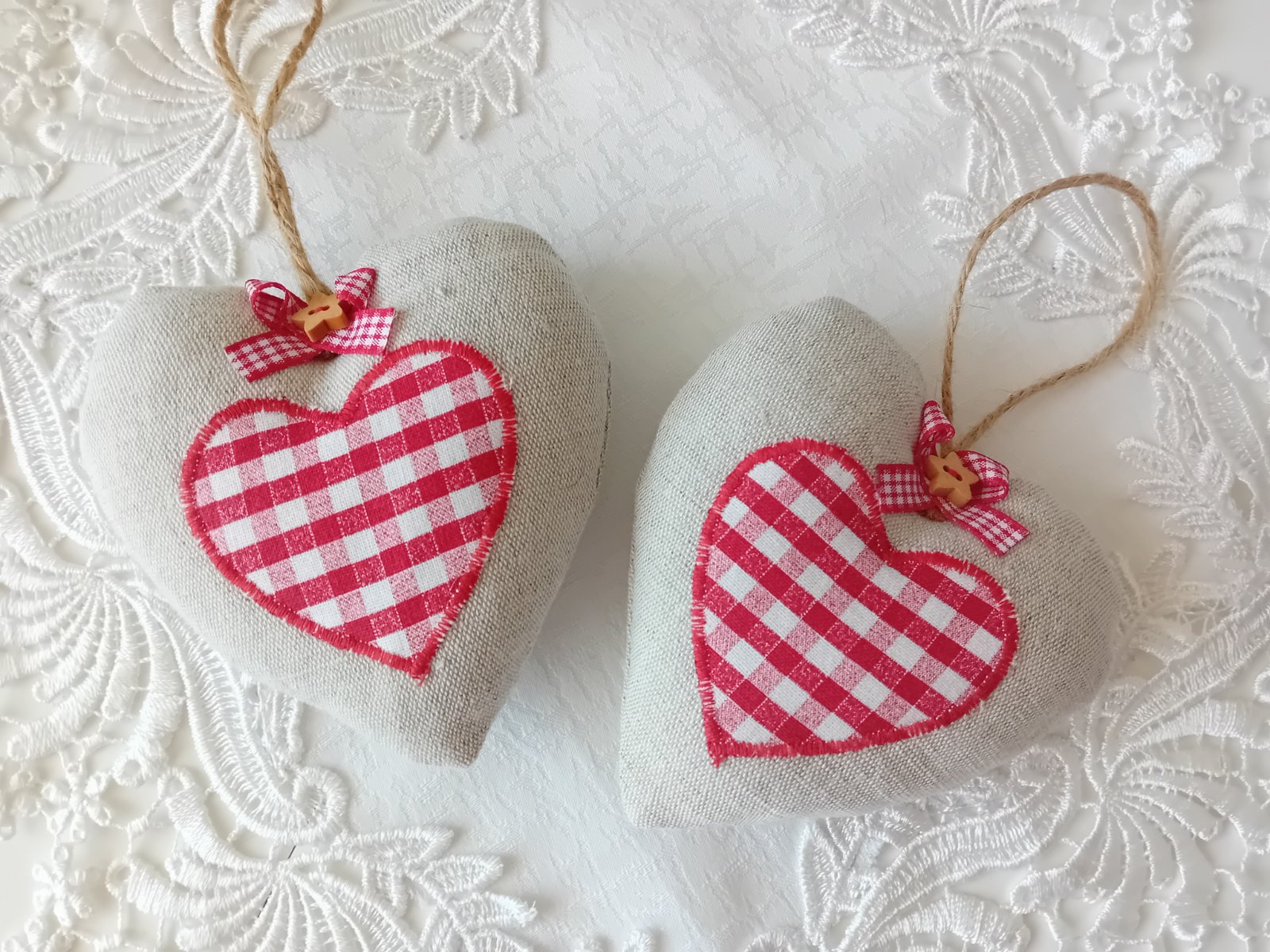 Pár srdiečok na zavesenie, zhotovené z ľanovej látky, zdobené bavlneným srdiečkom z károvanej látky. Milá dekorácia na nábytok alebo stromšek, či ako milý darček (nie sú vsak darčekovo balené)