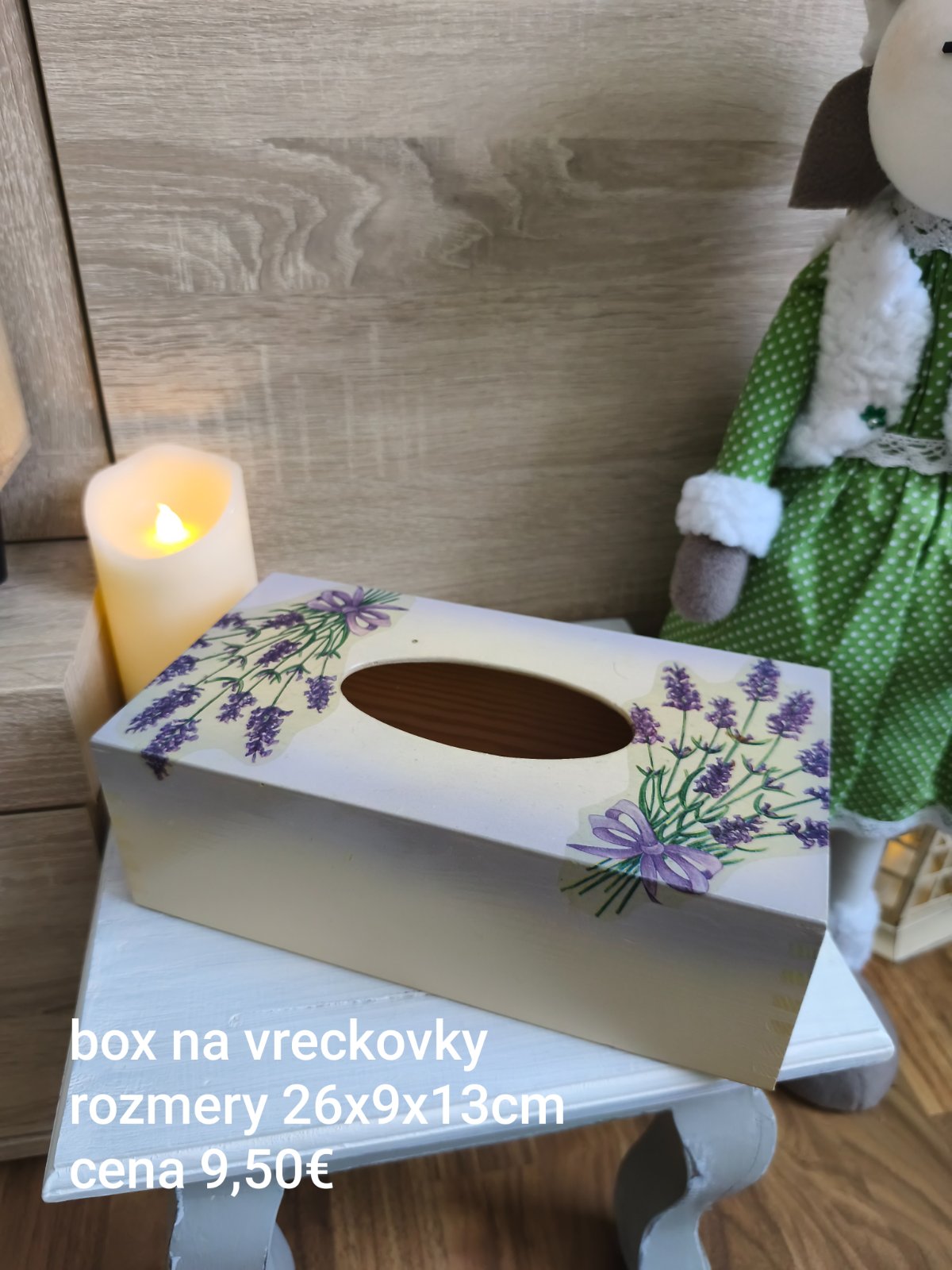 Krásny drevený box na vreckovky s motívom levandule. Výpredaj! Super cena!