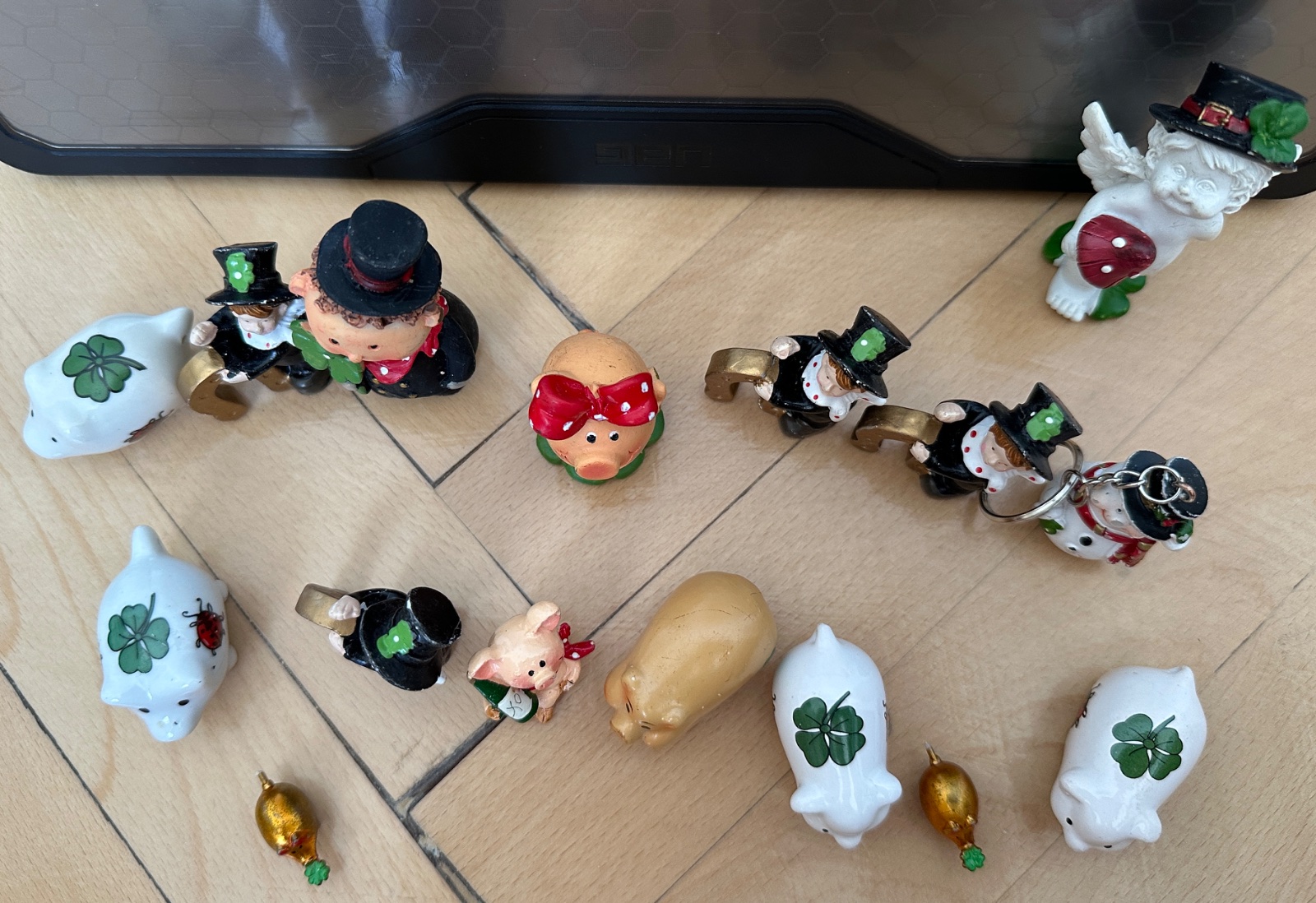Všetko vo veľmi dobrom stave, vhodné ako dekorácia alebo darček pre šťastie.KUS/30centov.