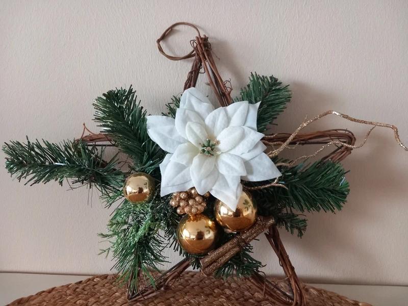 Zostali po mamine, podklad prútie/drevo s umelou výzdobou v bielo-zlatej farbe, obe s krúžkom na zavesenie. Pekný stav.
