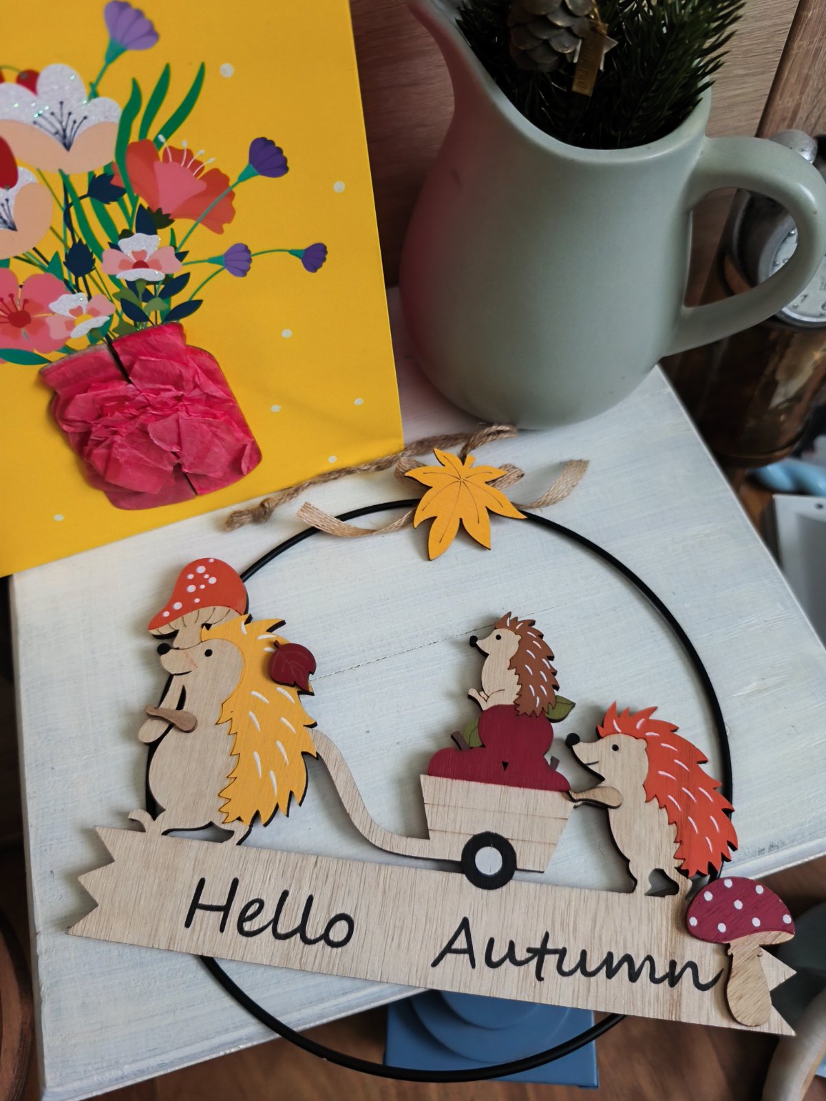 Krásny kovový venček s rodinou ježka, rozmery viď na foto.