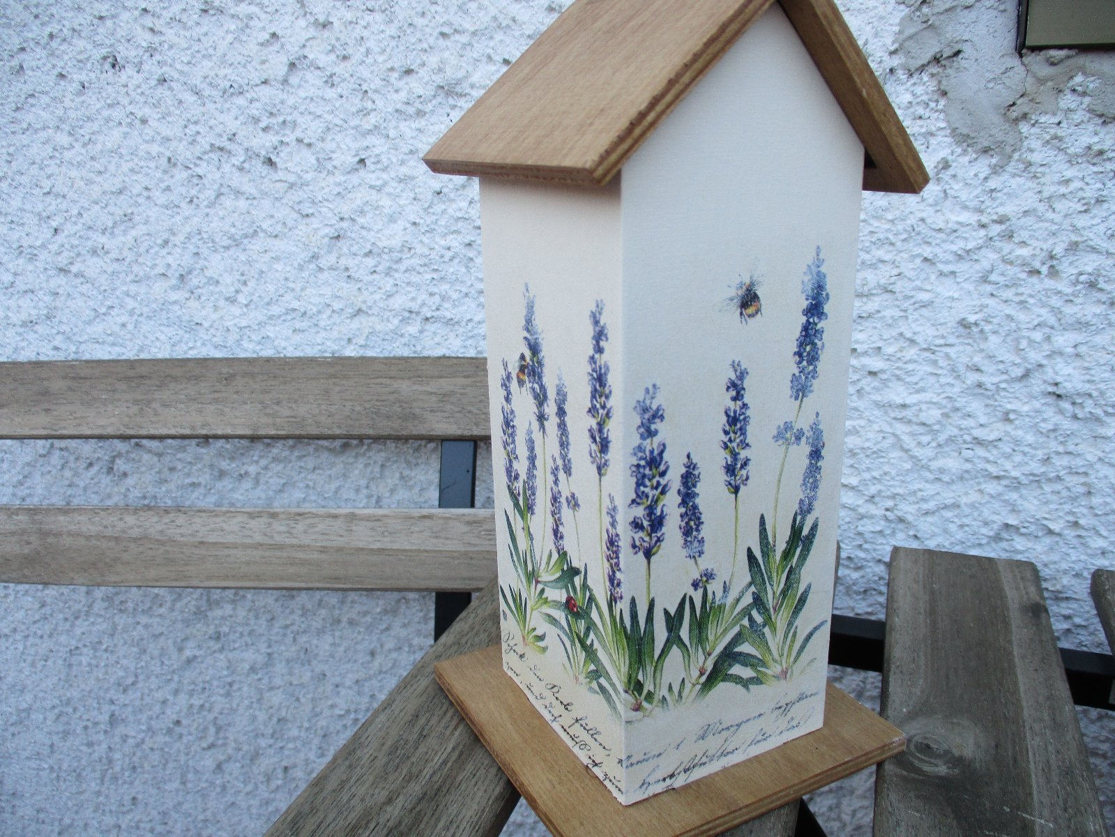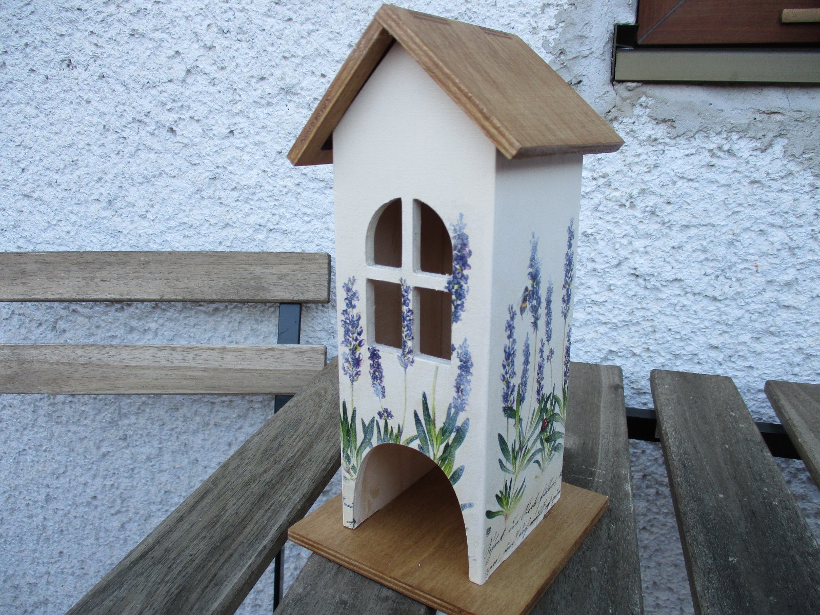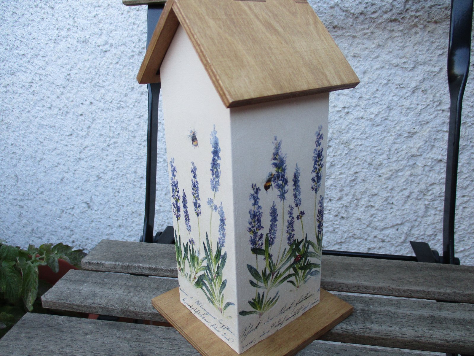 Drevený zásobník na čajové vrecúška v tvare domčeka, s odnímateľnou strechou, čo umožňuje jednoduché dopĺňanie vrecúšok. Je namaľovaný svetlo béžovou akrylovou farbou a dekorovaný servítkovou technikou s motívom levandule. Strieška a podstavec sú natreté svetlo hnedou lazúrou a celý domček je prelakovaný bezfarebným matným lakom. Všetky nátery boli prevedené zdravotne nezávadnými farbami aj lakom.
