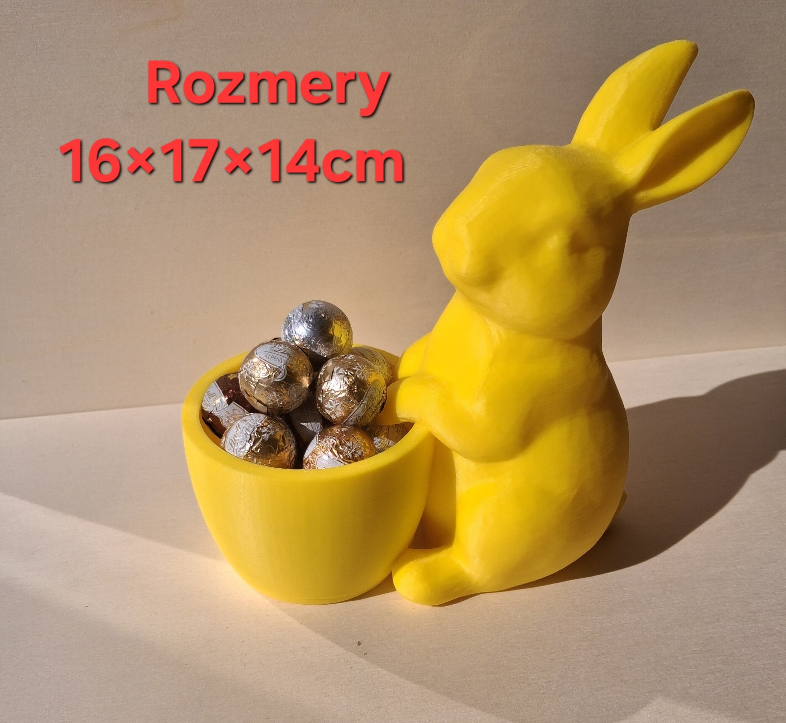 Roztomilý zajac drží misku, do ktorej môžete dať čokoládové vajíčka, sladkosti alebo drobnú výzdobu.