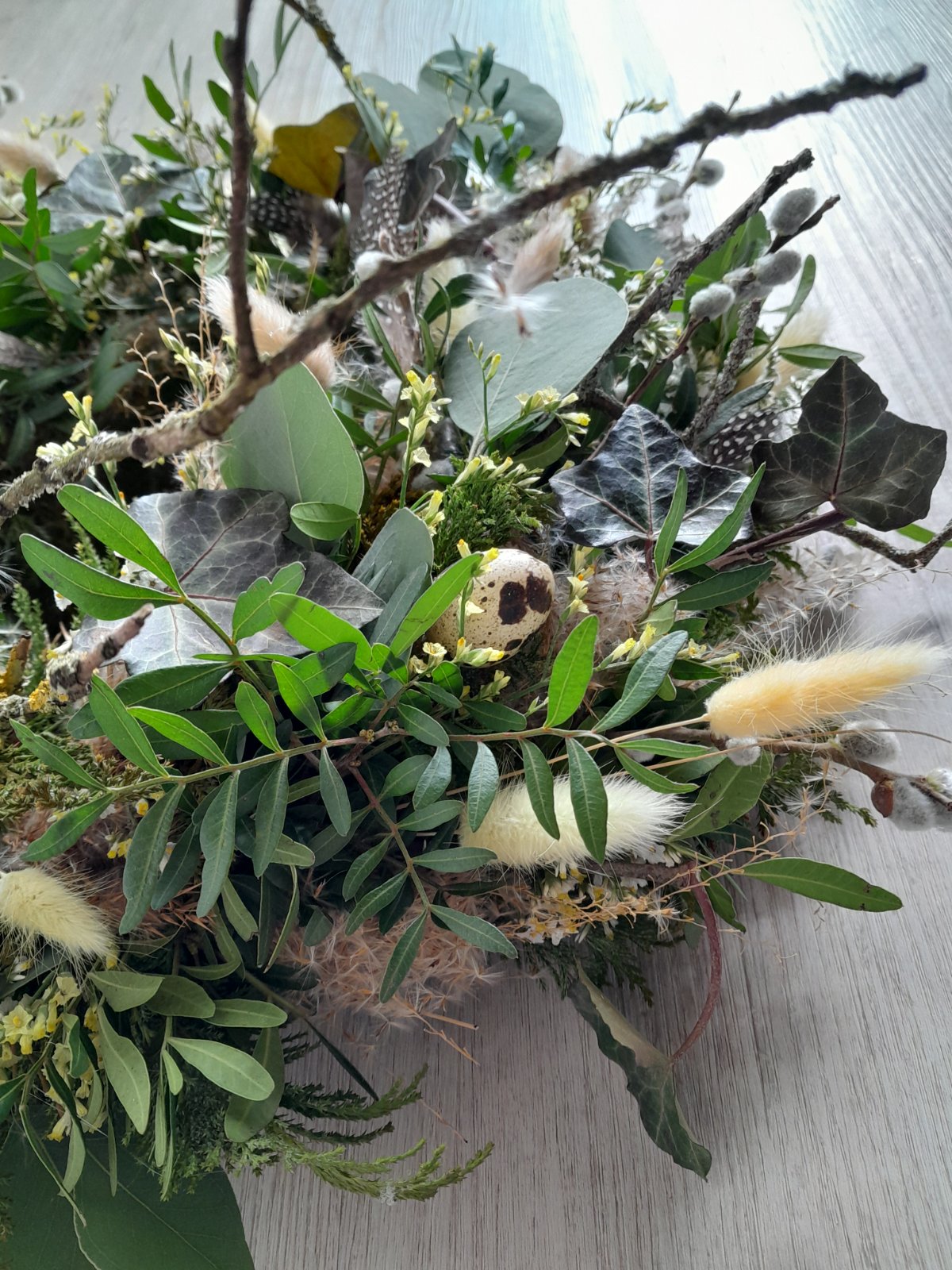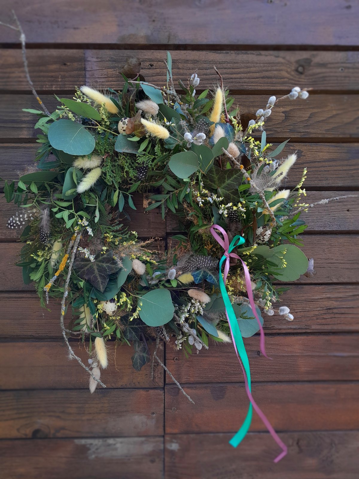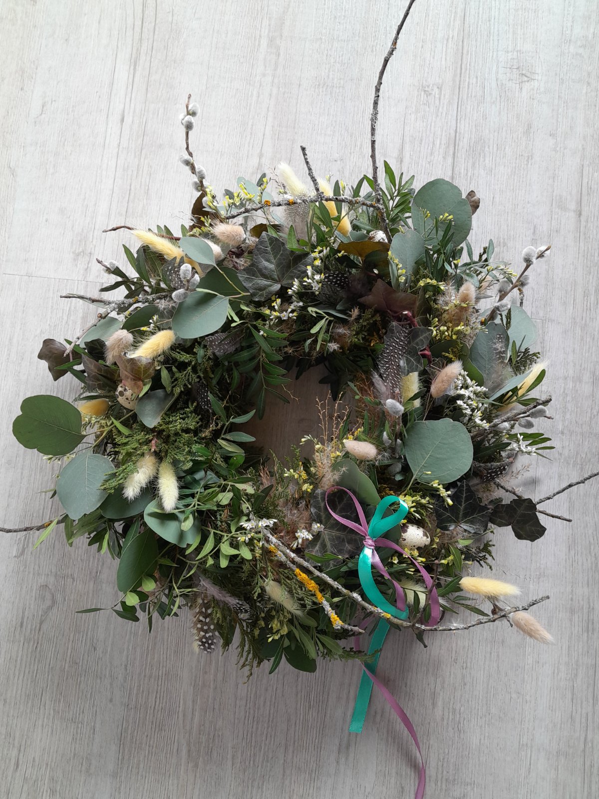 Jarný venček, ktorý prirodzene uschne, neopadá, vonkajší priemer cca 41 cm, uvijem čerstvý :)