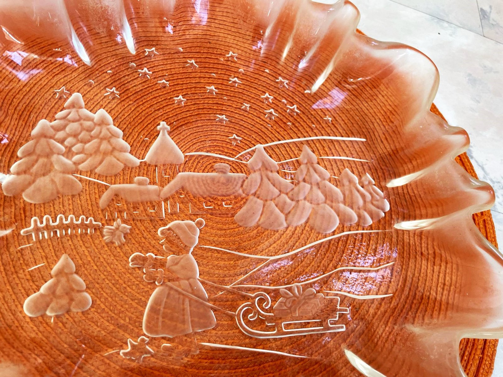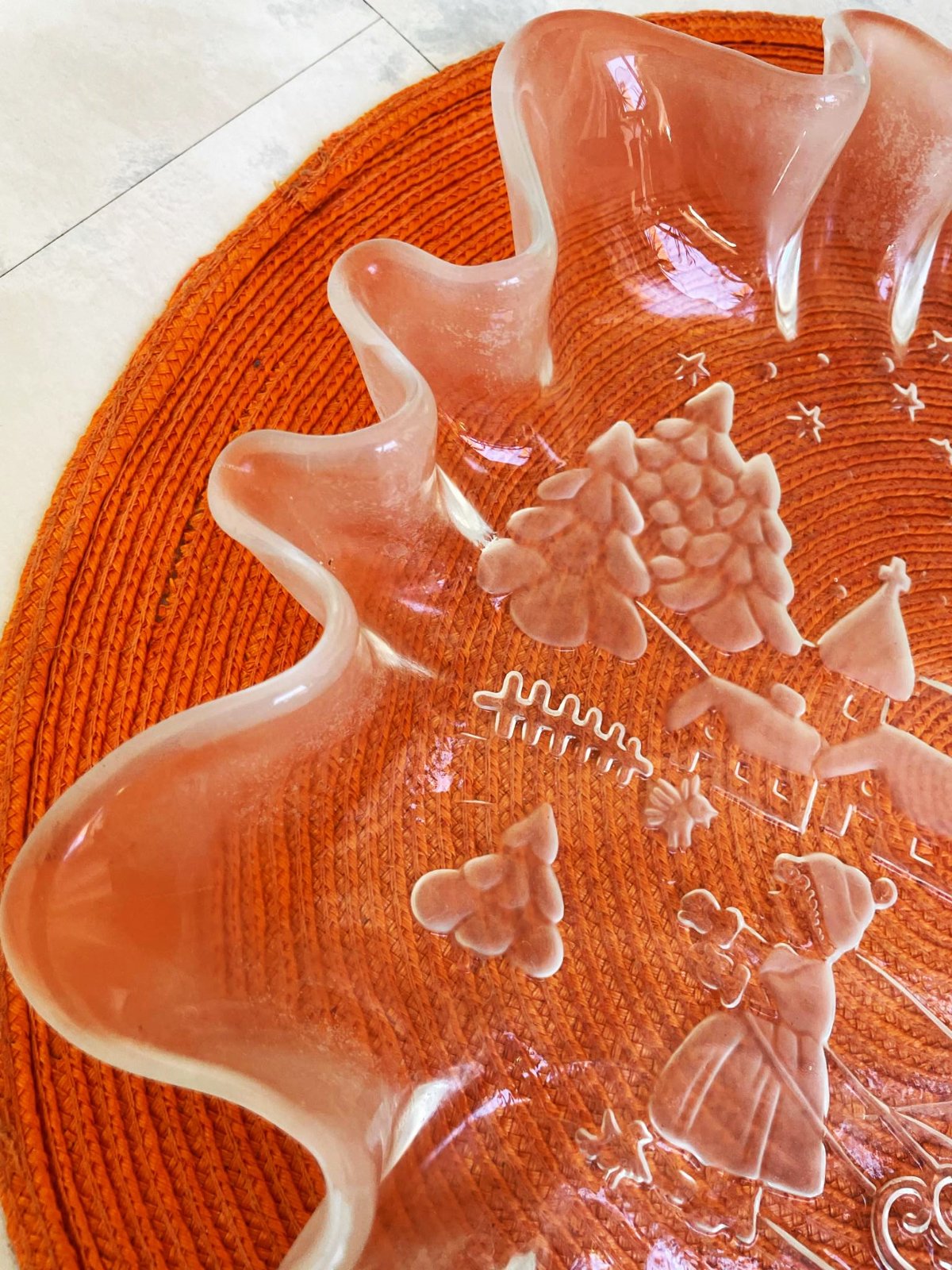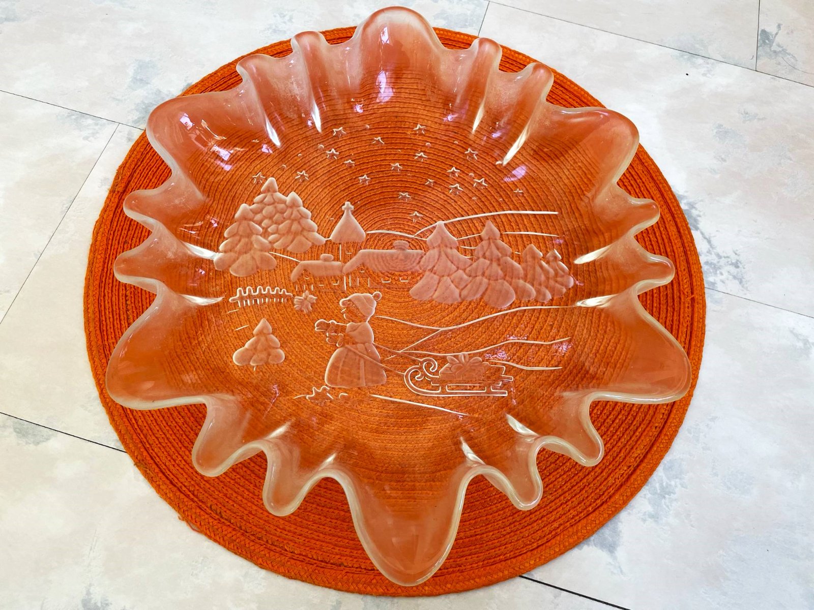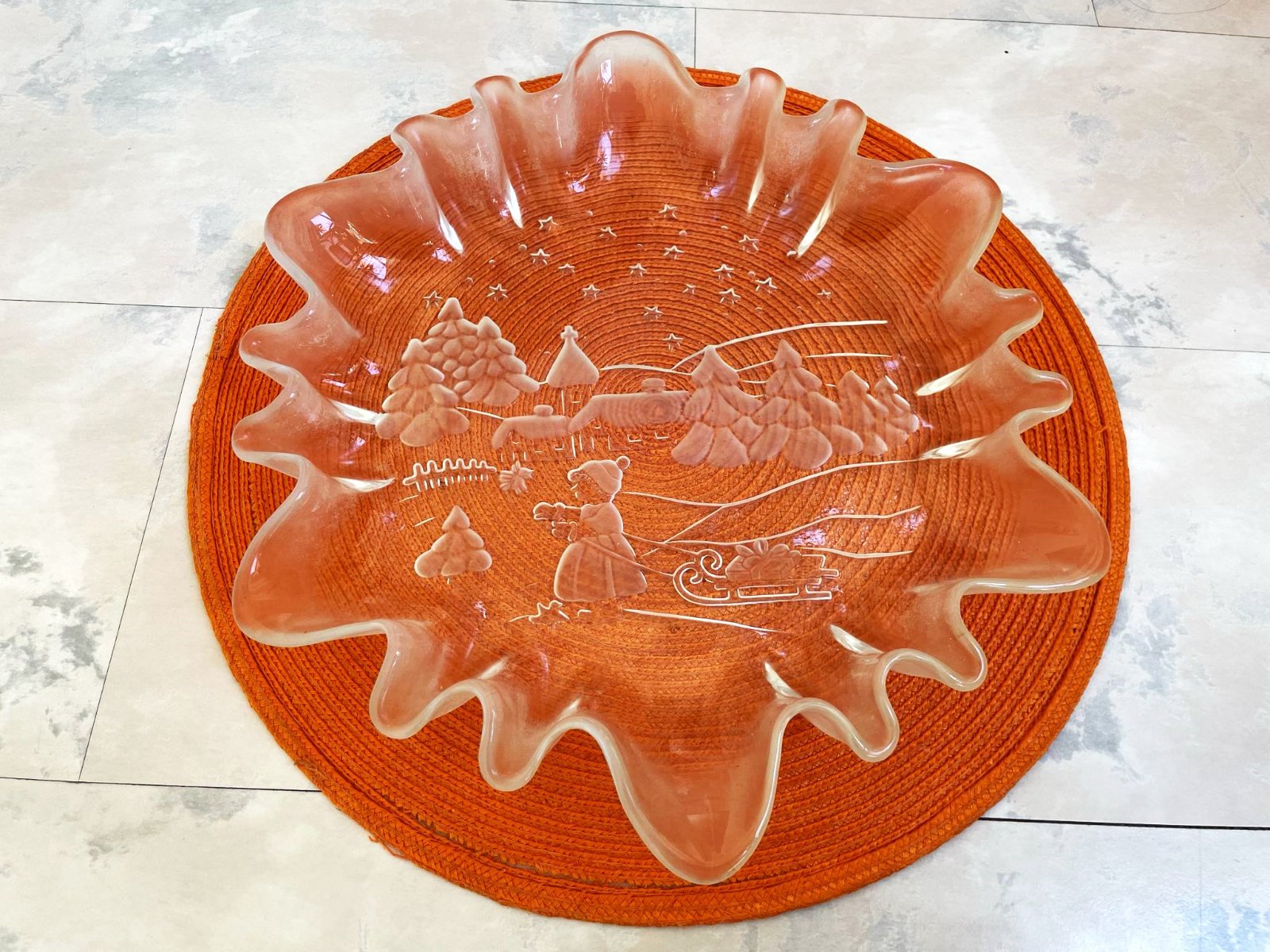 krásna zaujímavá masívna nerozbitná misa z ľadového hrubého skla,nerozbitná,s vianočným motívom,vhodná na zákusky,pečivo,ovocie,sladkosti,chipsy a pod. - v top stave - bola iba vystavená,priemer cca 30 cm