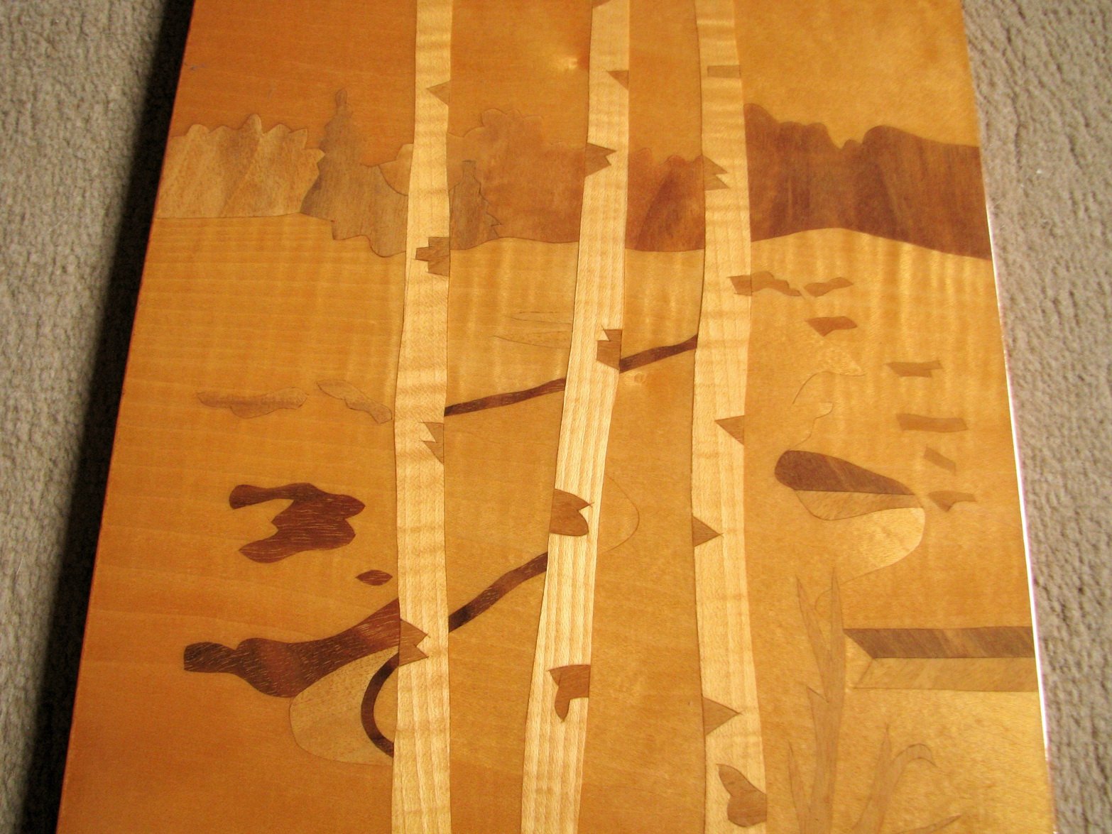 Starý drevený dekoratívny obrázok s brezami pri lese, rozmer 37,6 x 22,4 cm. Lakovaný povrch, pár iba pri blízkom skúmaní viditeľných povrchových šmúh a škrabančekov. Malé odlúpnutia v 3 rohoch. Stále však vyzerá veľmi dobre.
