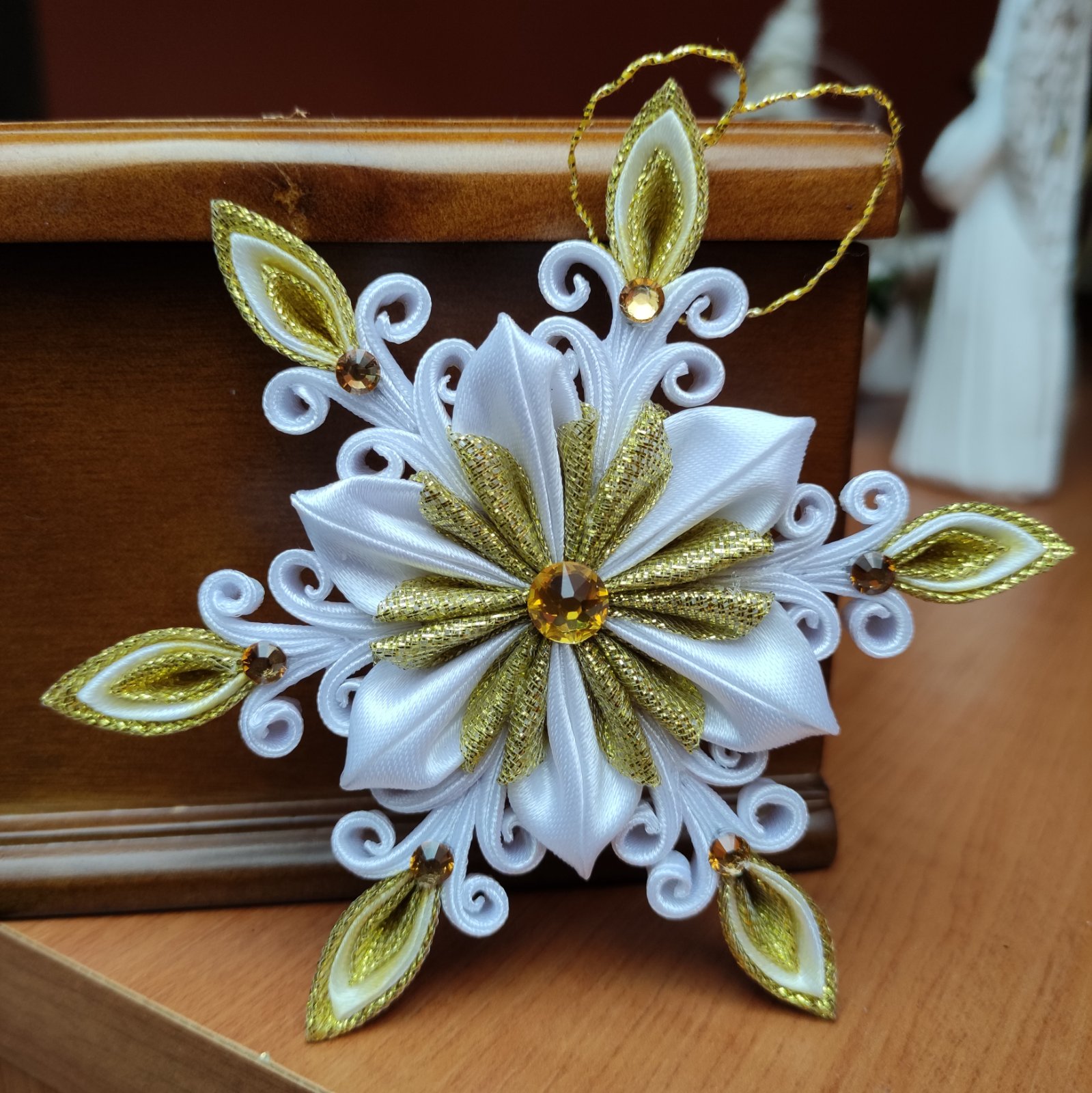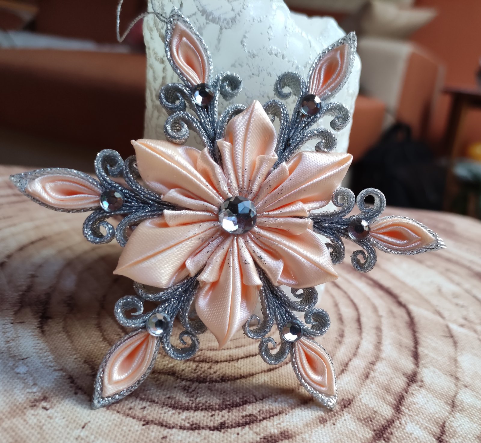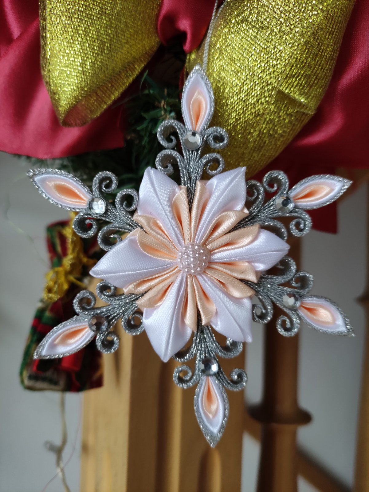 Dodajte svojmu vianočnému stromčeku dotyk elegancie s touto nádhernou vločkou zo saténovej a organzovej stuhy, ktorá je precízne dozdobená ligotavými kamienkami.