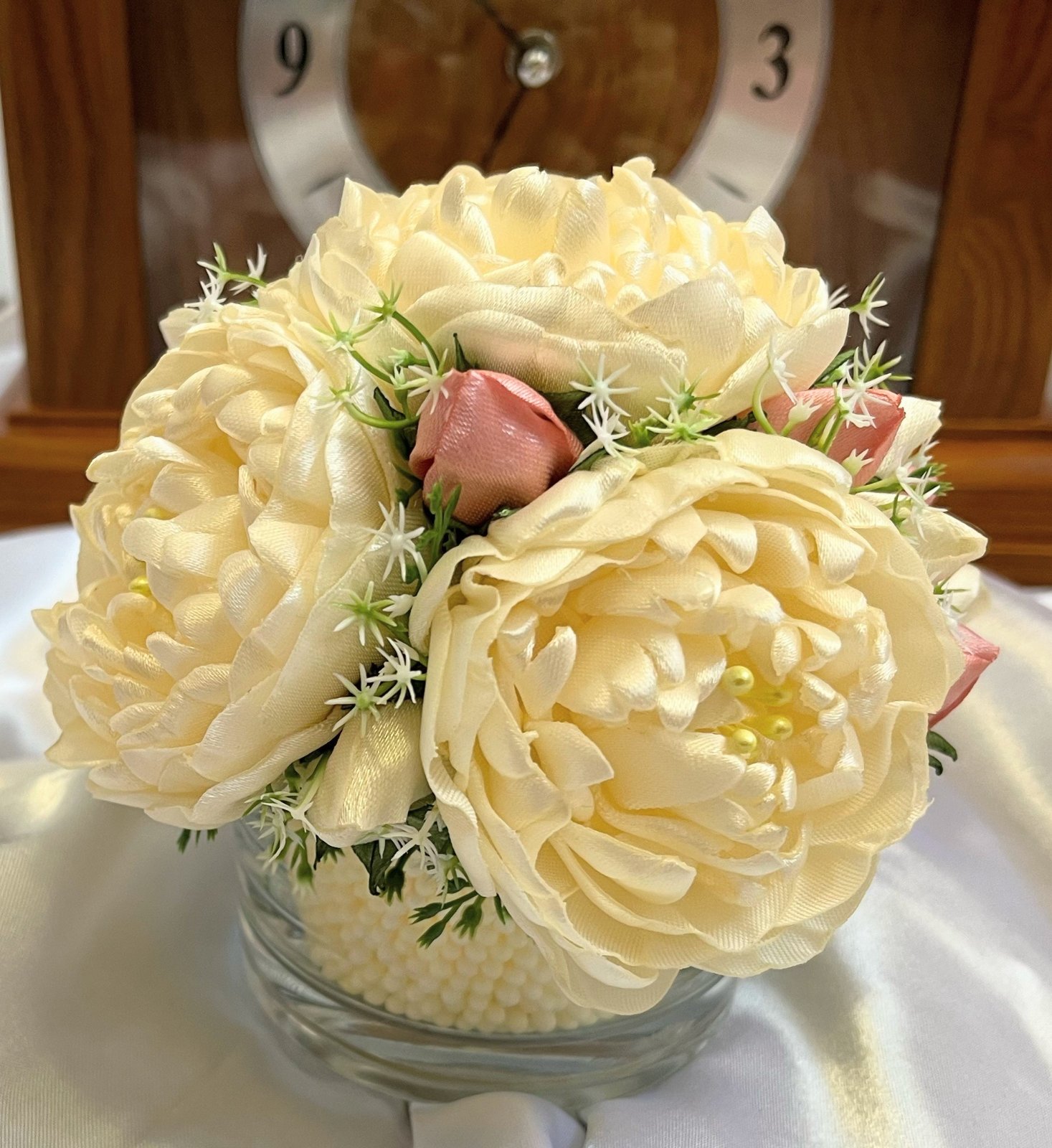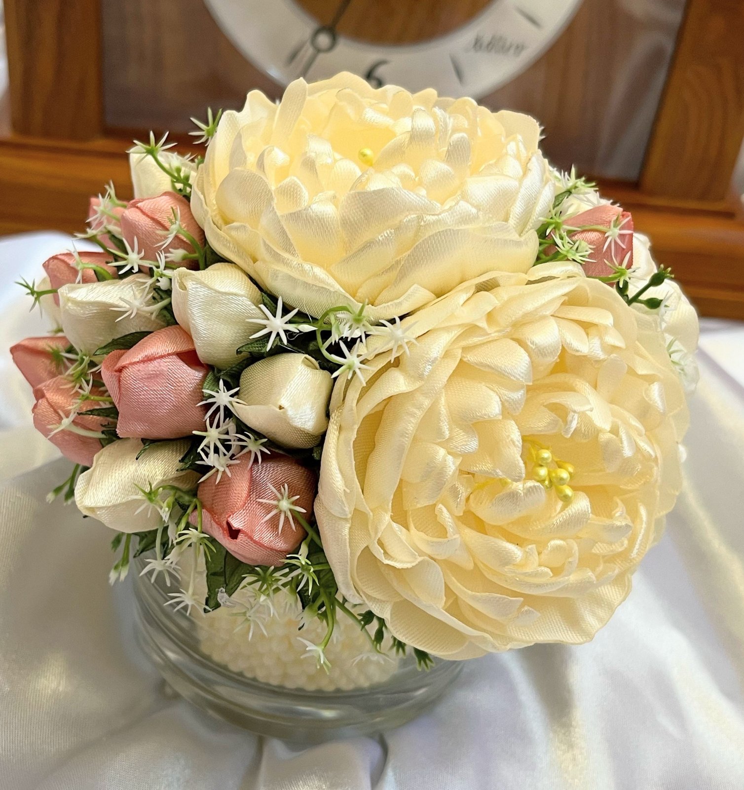 Tento nežný kvetinový aranžmán je stelesnením elegancie a trpezlivej ručnej práce. Dominujú mu bohato vrstvené krémové pivonky a jemné ružové a smotanové púčiky, vytvorené zo saténovej stuhy.